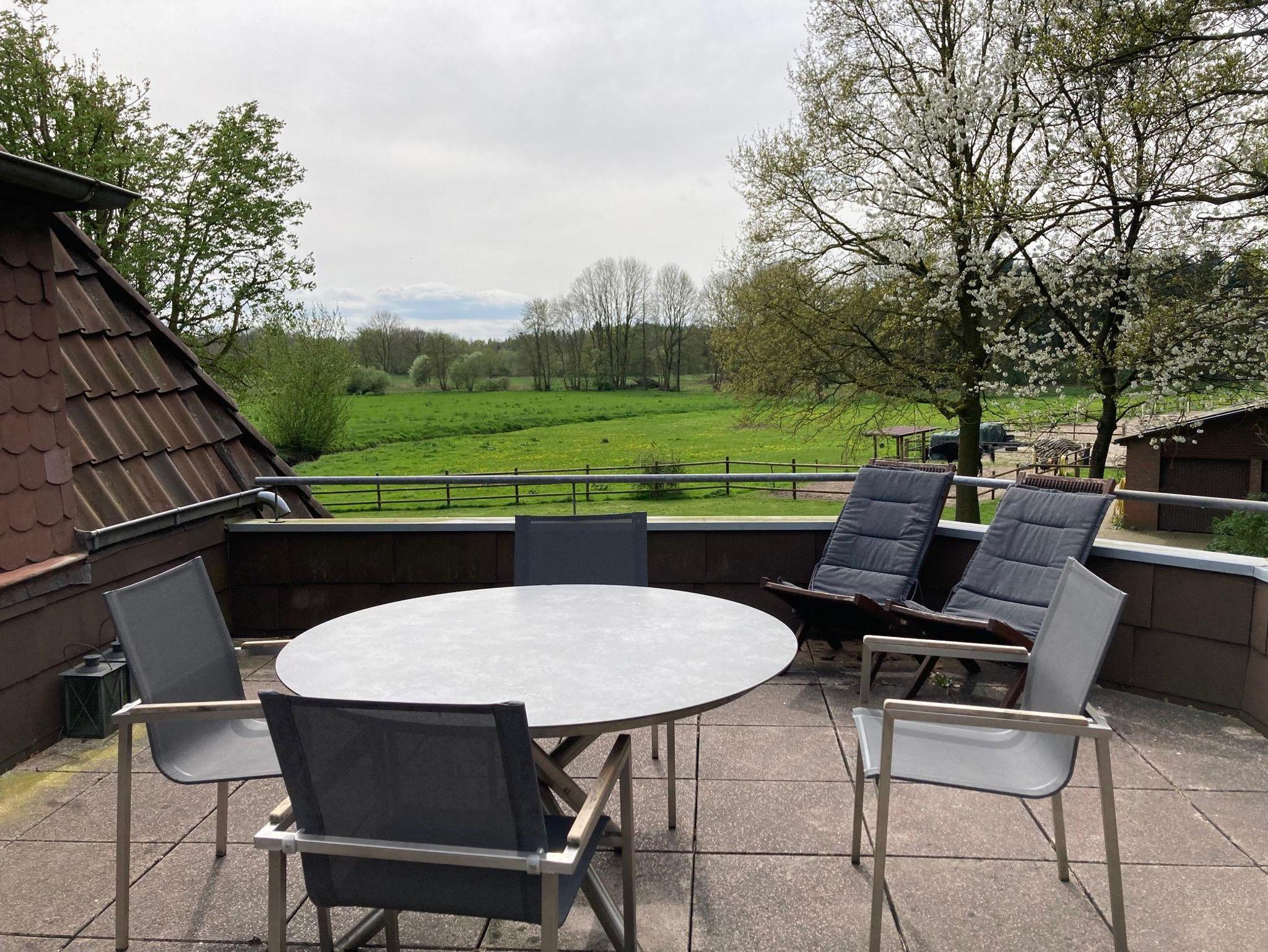 Die Wohnung hat zu allen Seiten hin Aussicht auf die Natur: von der Küche aus schaut man auf die Bäke vor dem Haus, vom Wohnzimmer aus auf die Wiesen, von auf der Terasse aus auf den angrenzenden Wald (beinahe wie im Baumhaus). 2 separate Schlafzimmer stehen zur Verfügung: das Bäkenzimmer hat 2 Einzelbetten, das Brückenzimmer hat ein 1,80 x 2,00 m großes Boxspringbett.