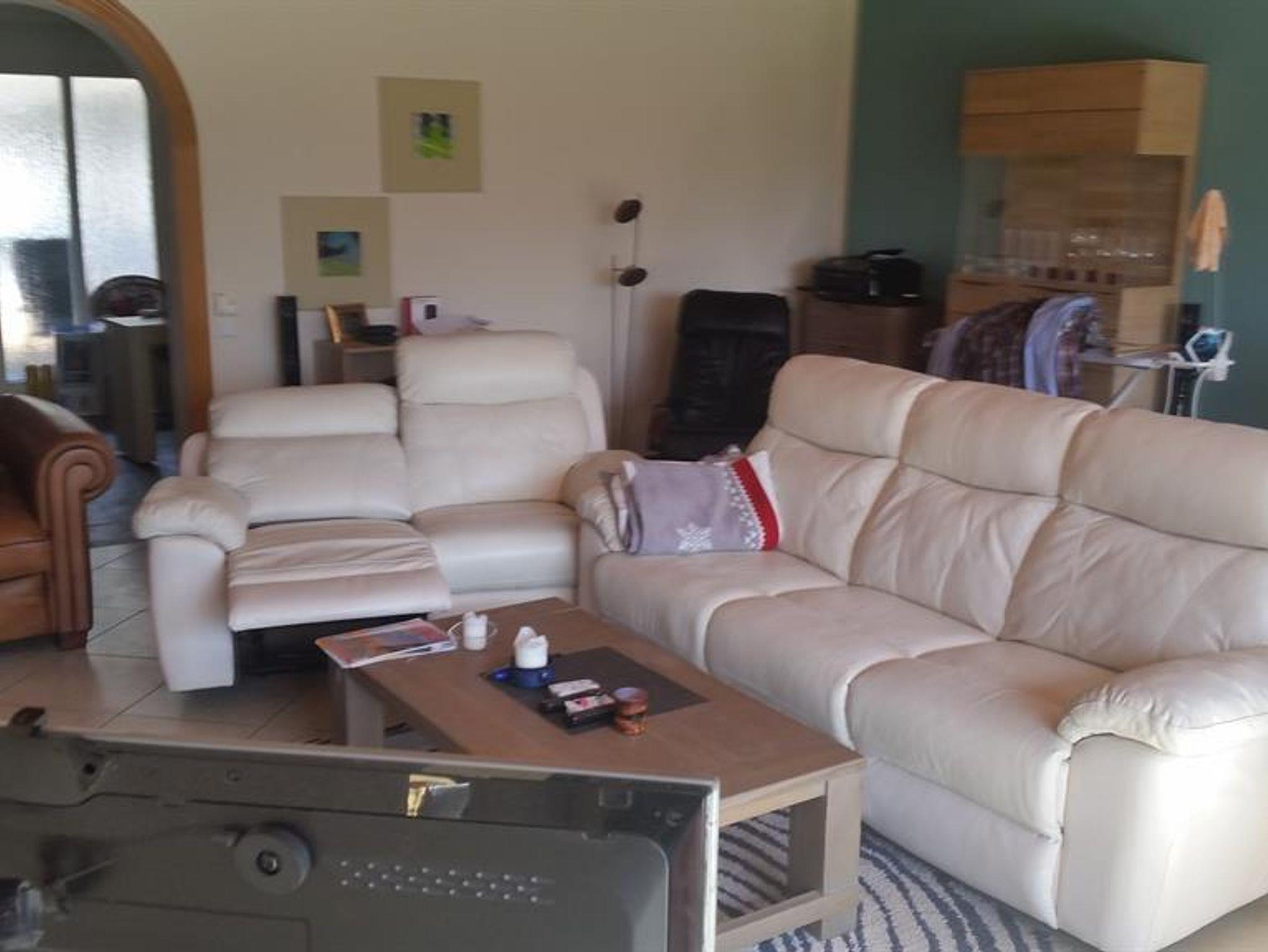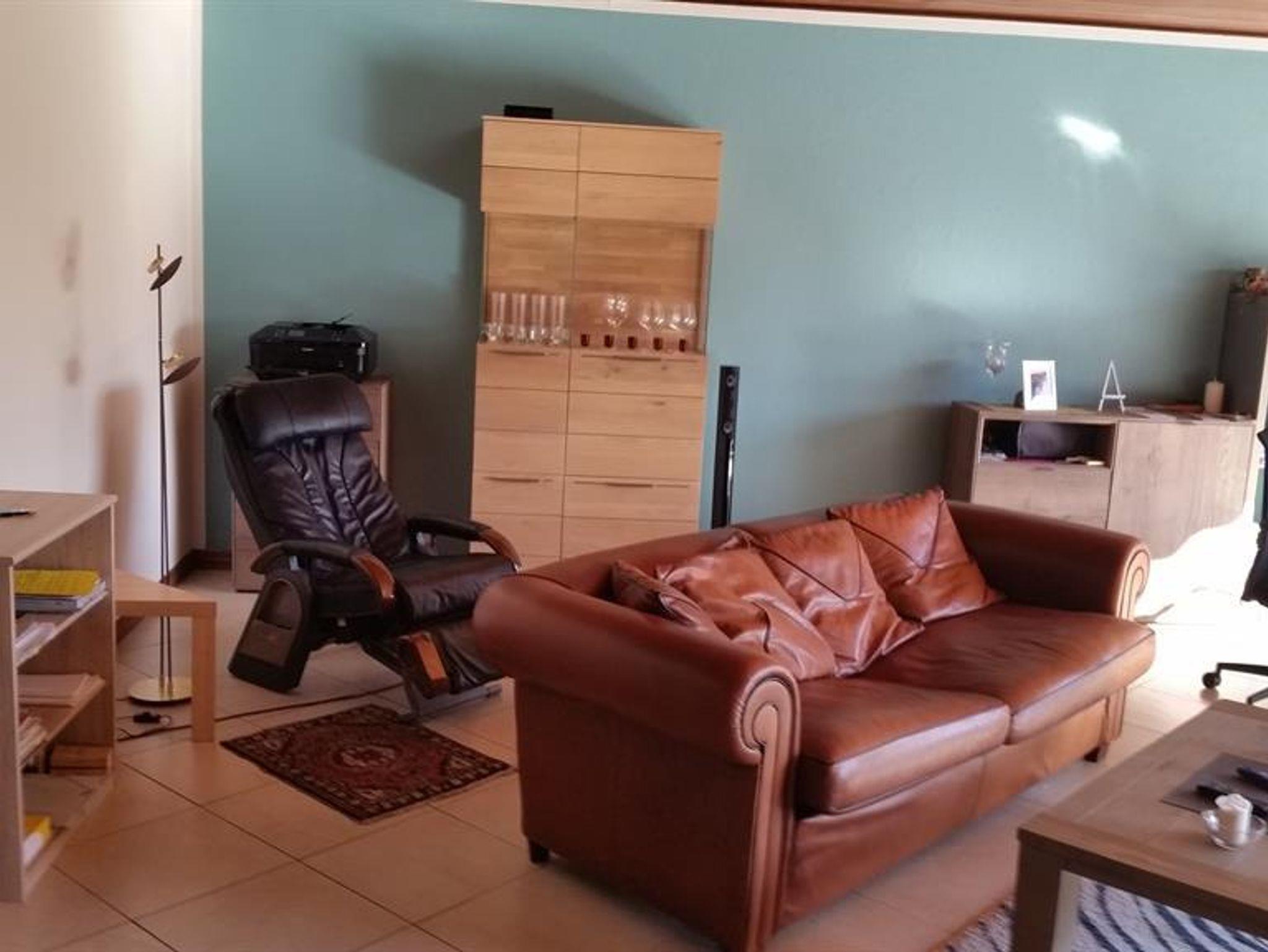 Wohnbereich mit Smart-TV (49“) und großen Panoramafenstern zum Garten, moderner, bequemer 3-Sitzer –Leder-Couch, 2 Leder Relax- Sesseln, eine 2-Sitzer Schlafcouch, einem exclusivem Massagesessel, Edler Eiche-Echtholzvitrine und Bücherregalen.
