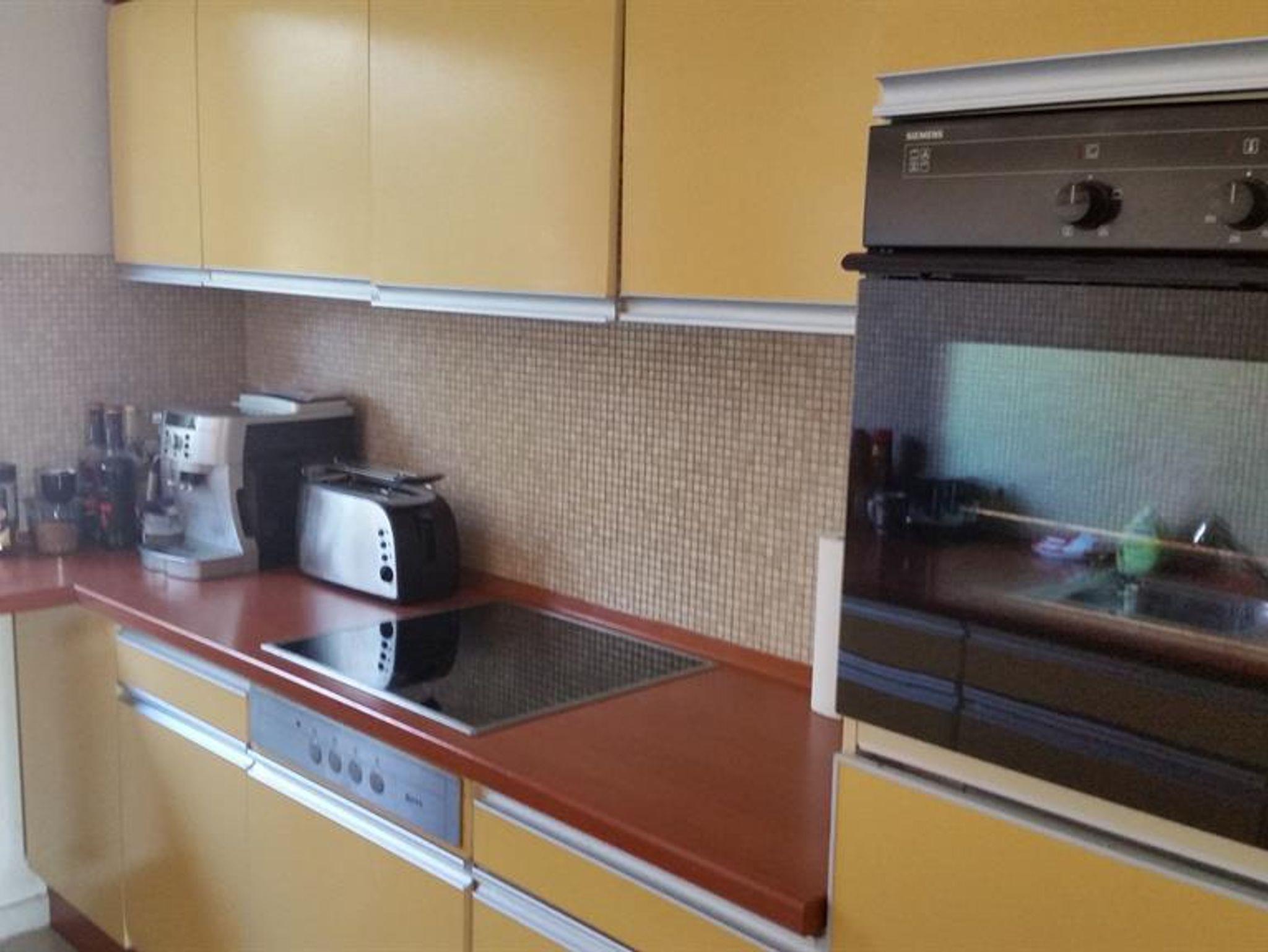 Küche (11m²) mit Küchenblock, Kühlschrank, Geschirrspüler, Backofen , Spüle und Cerankochfeld. Kaffeevollautomat, Microwelle, Mixer mit Kochfunktion, Milchaufschäumer, Wasserkocher, Toaster, Geschirr für 4-5 Personen.