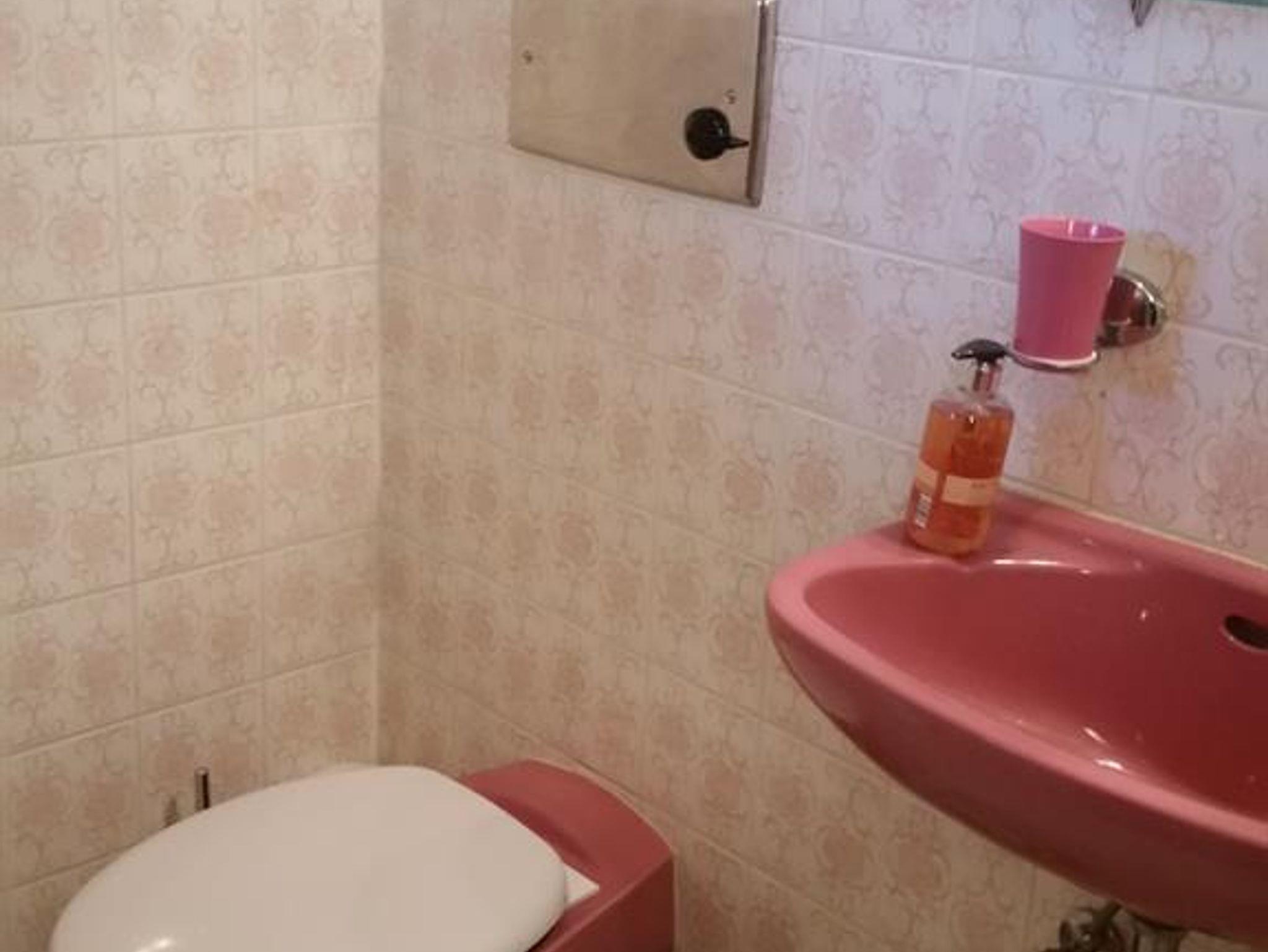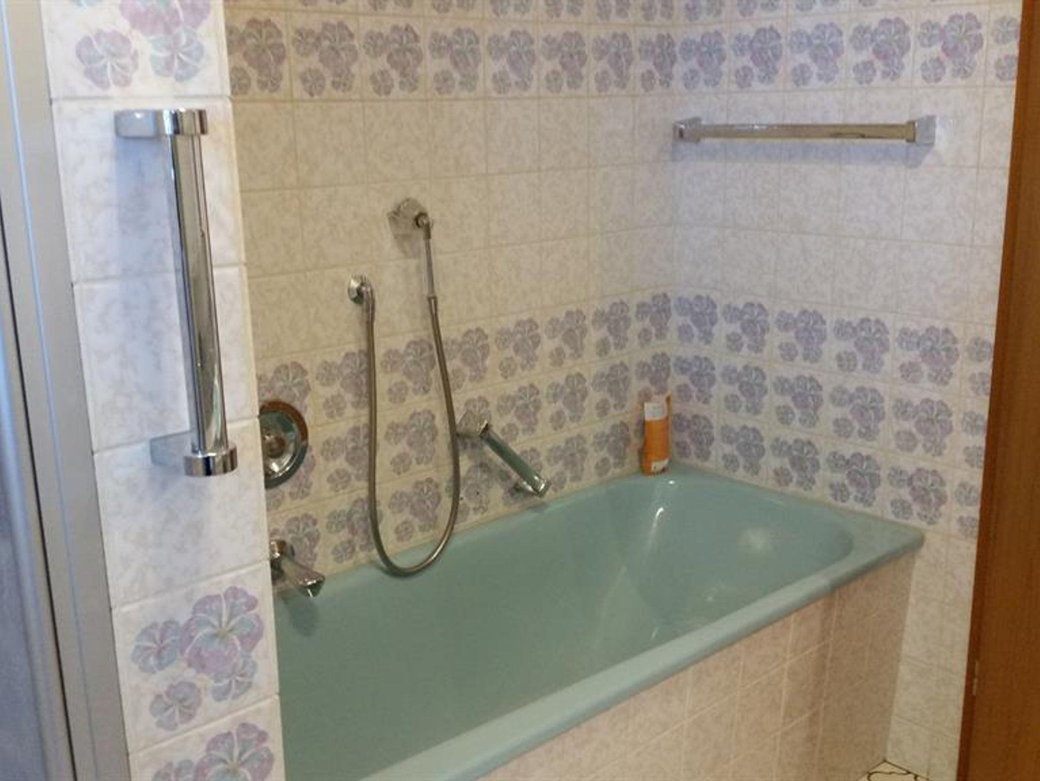 Duschbad ( 9 m²) mit Badewanne, Dusche, Waschbecken, Badezimmerschrank und Toilette.