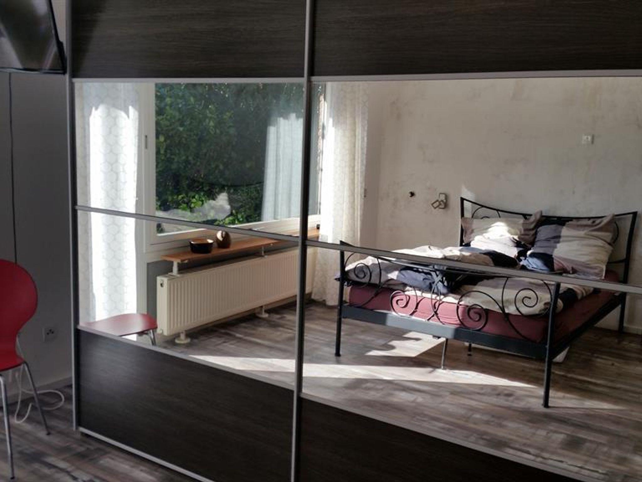 Schlafzimmer 2: (15 m²) mit Fenster und Tür zum Garten. Smart-TV (32“), Doppelbett 1,8x2m mit Schiebe- Bettisch , Nachtschränken, grossem Kleiderschrank und Kommode.