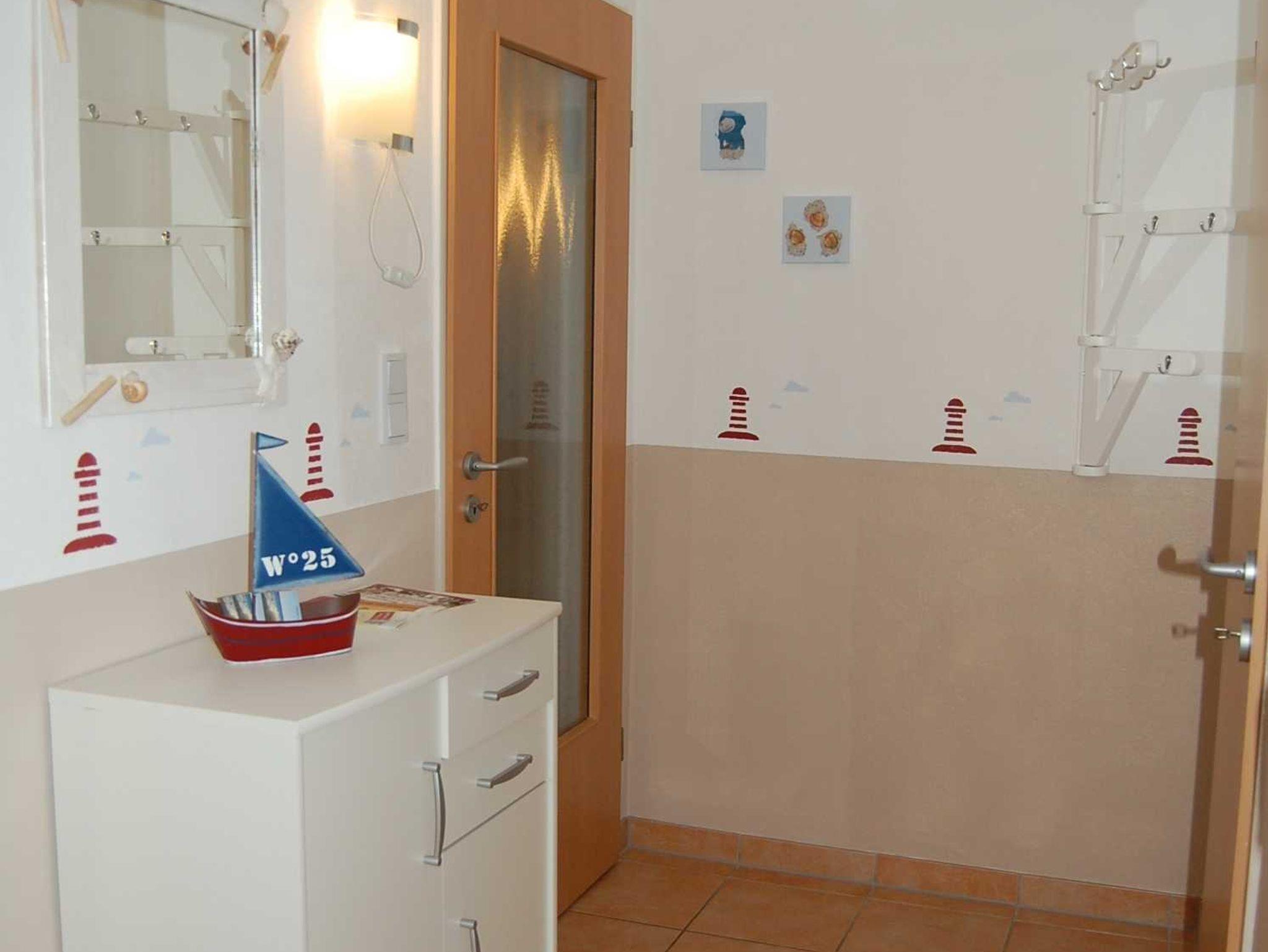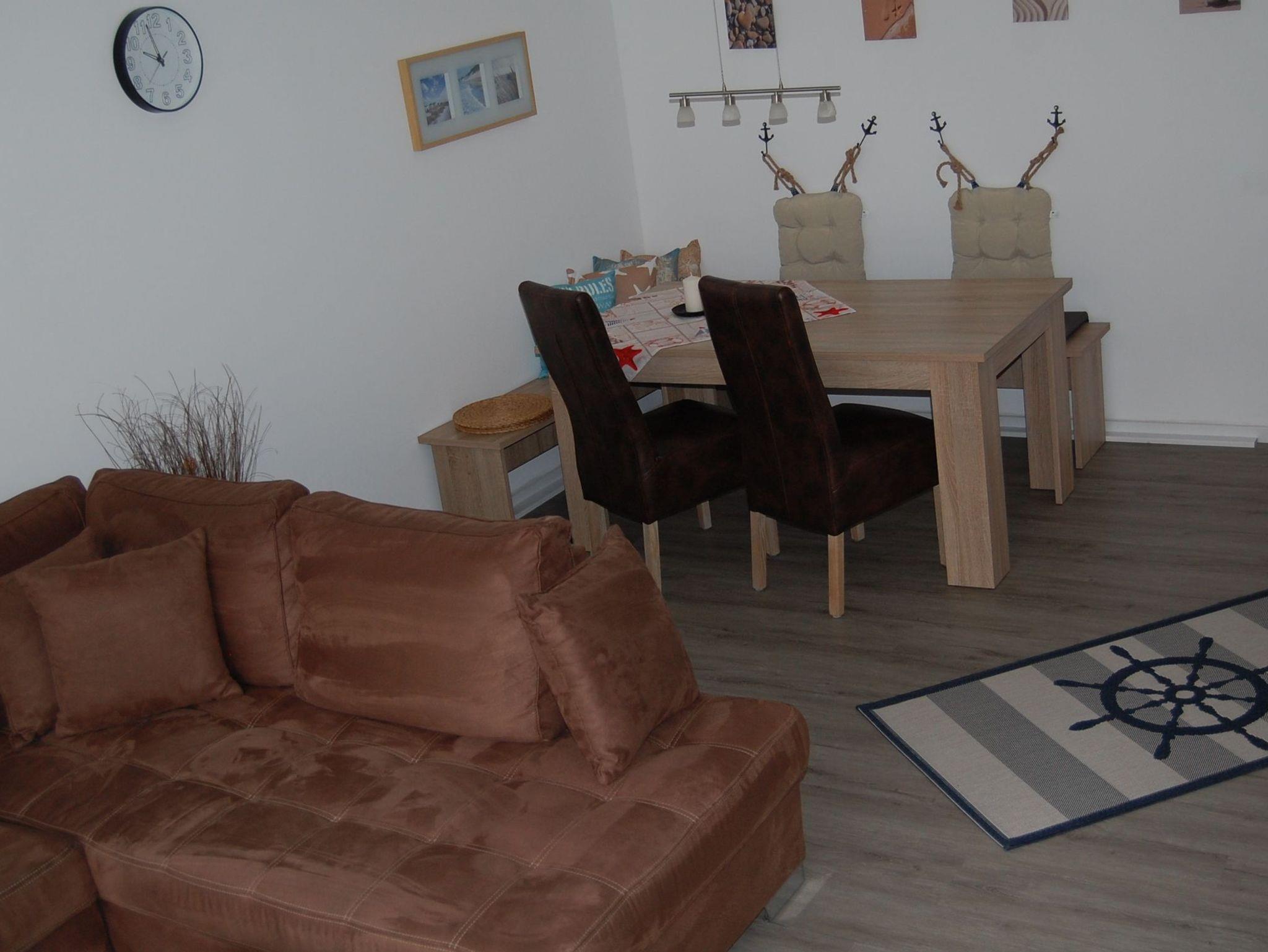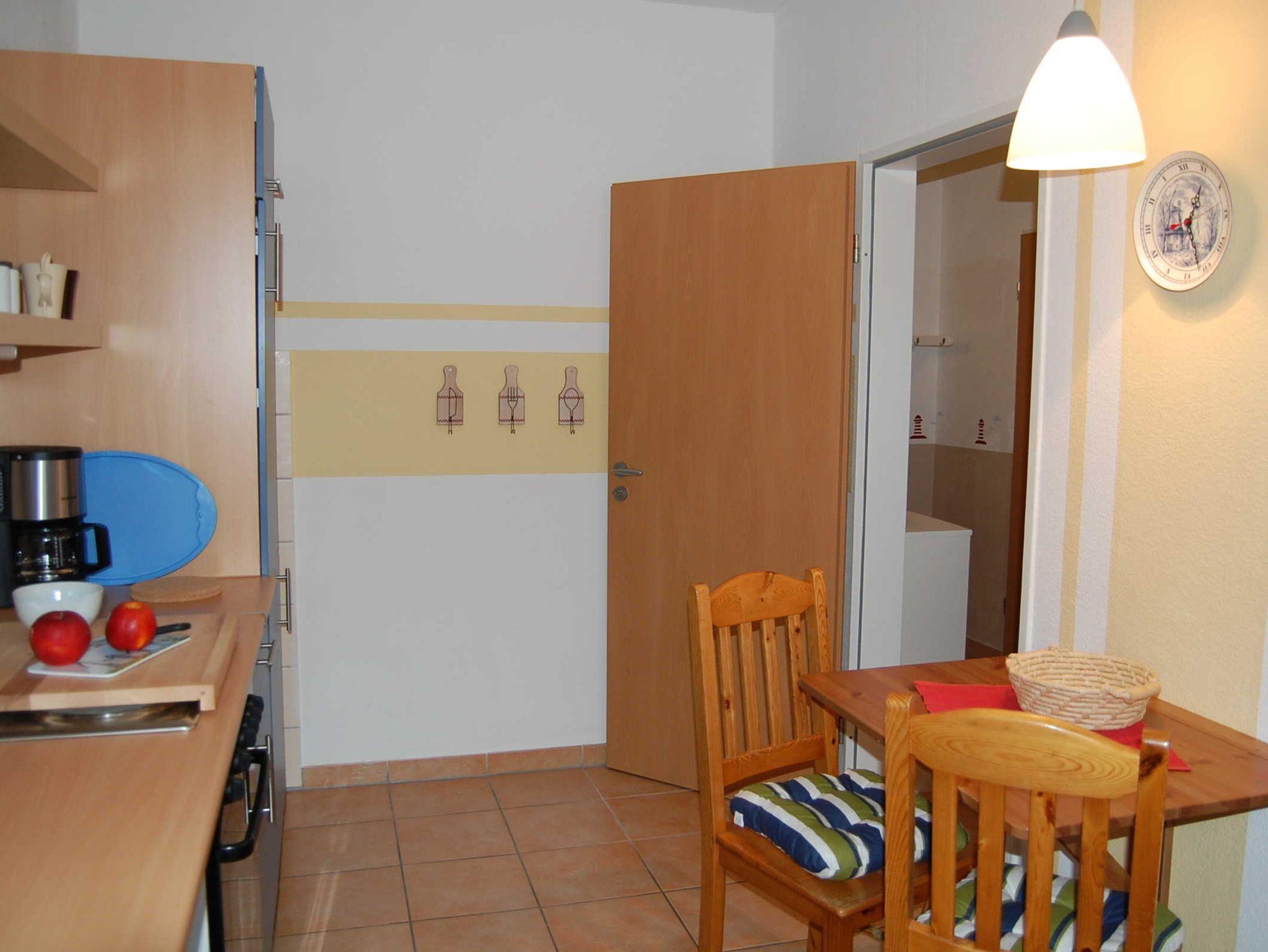 Die Ferienwohnung verfügt übe eine separate Küche mit Abstellraum. Vorhanden sind Wasserkocher, Kaffeemaschine, Kühlschrank, Backofen mit E-Herd, Spülmaschine sowie ein Eierkocher und Toaster. Im Schlafzimmer befindet sich ein Doppelbett mit einem geräumigen Kleiderschrank. Der Wohn-, Essbereich verfügt über einen Fernseher mit DVD-Player und eine Stereoanlage. Die Couch kann zu einer Schlafcouch für 2 Personen umfunktioniert werden.