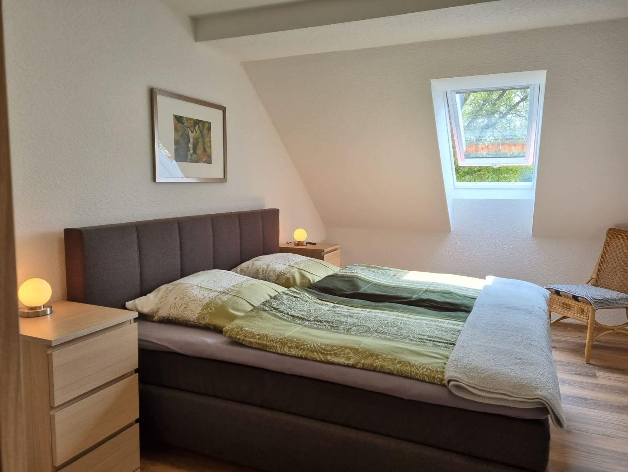 Zwei Schlafzimmer mit Boxspringbetten, sowie in der oberen Etage ein Schlafzimmer mit zwei Einzelbetten. Insgesamt ist in der Wohnung Platz für bis zu 6 Erwachsene.