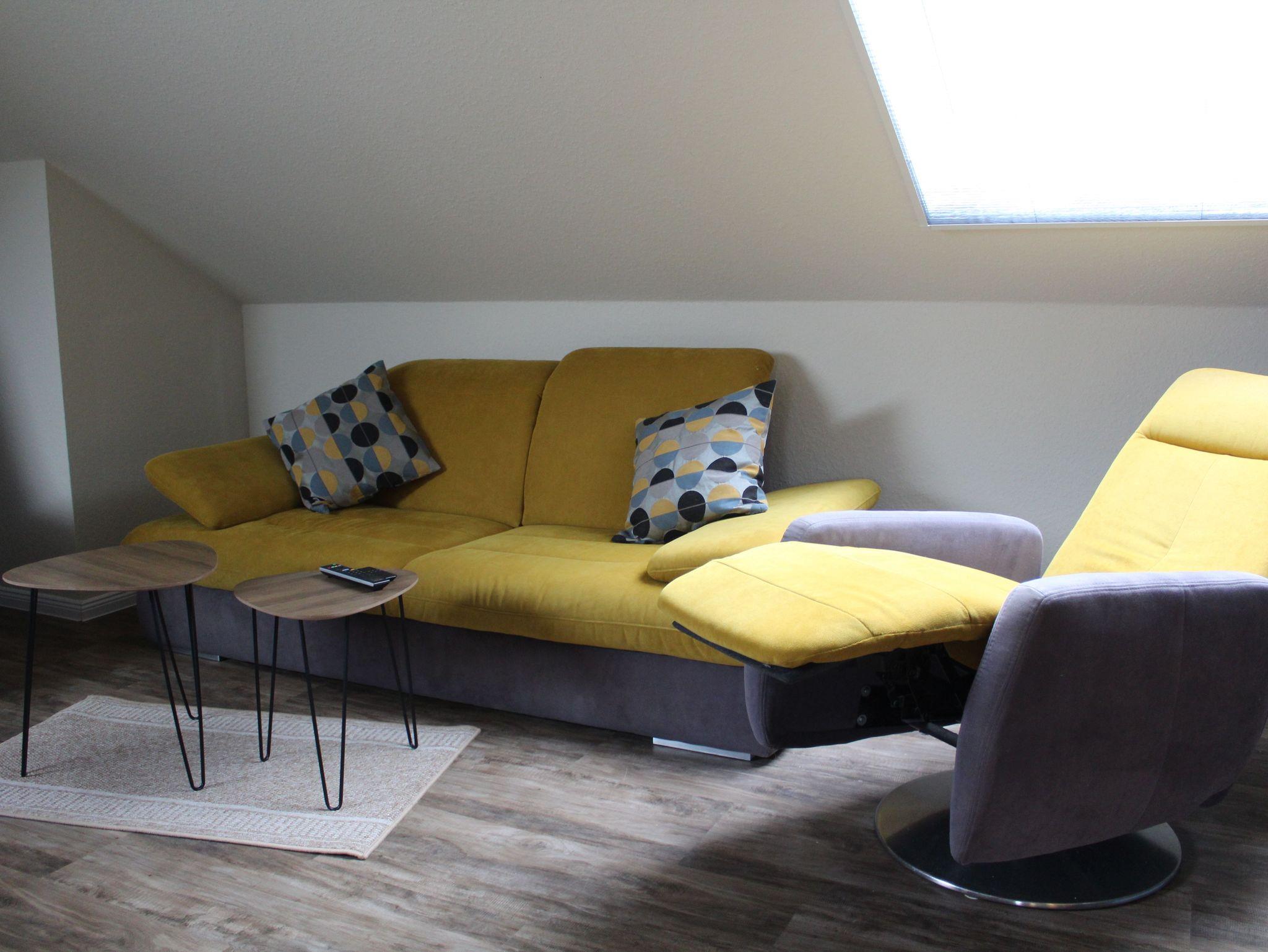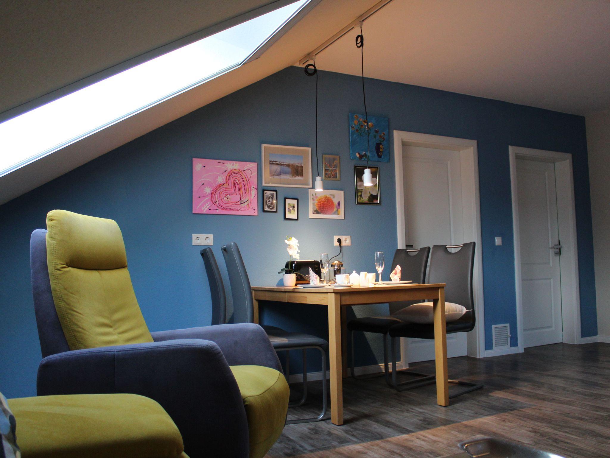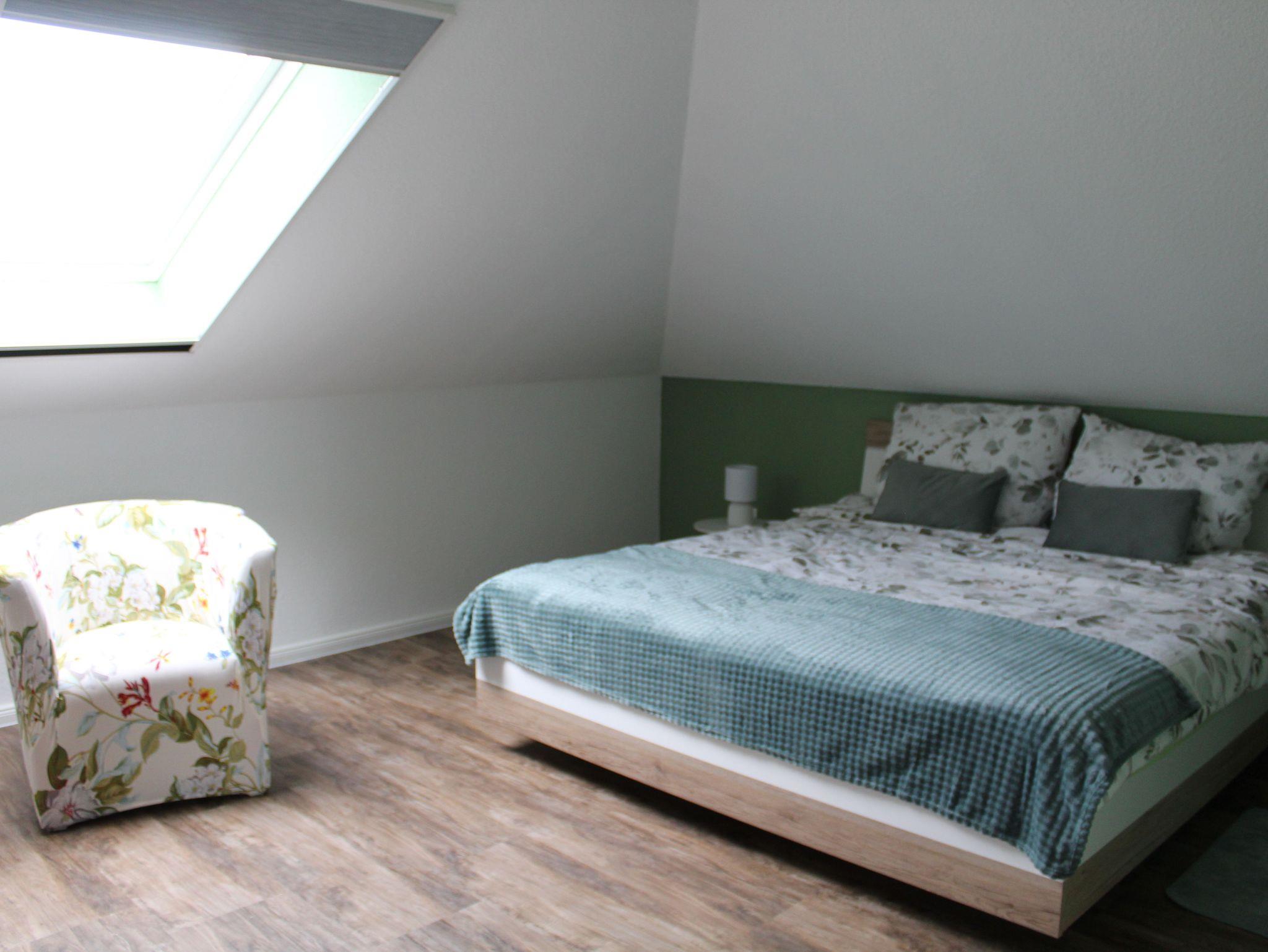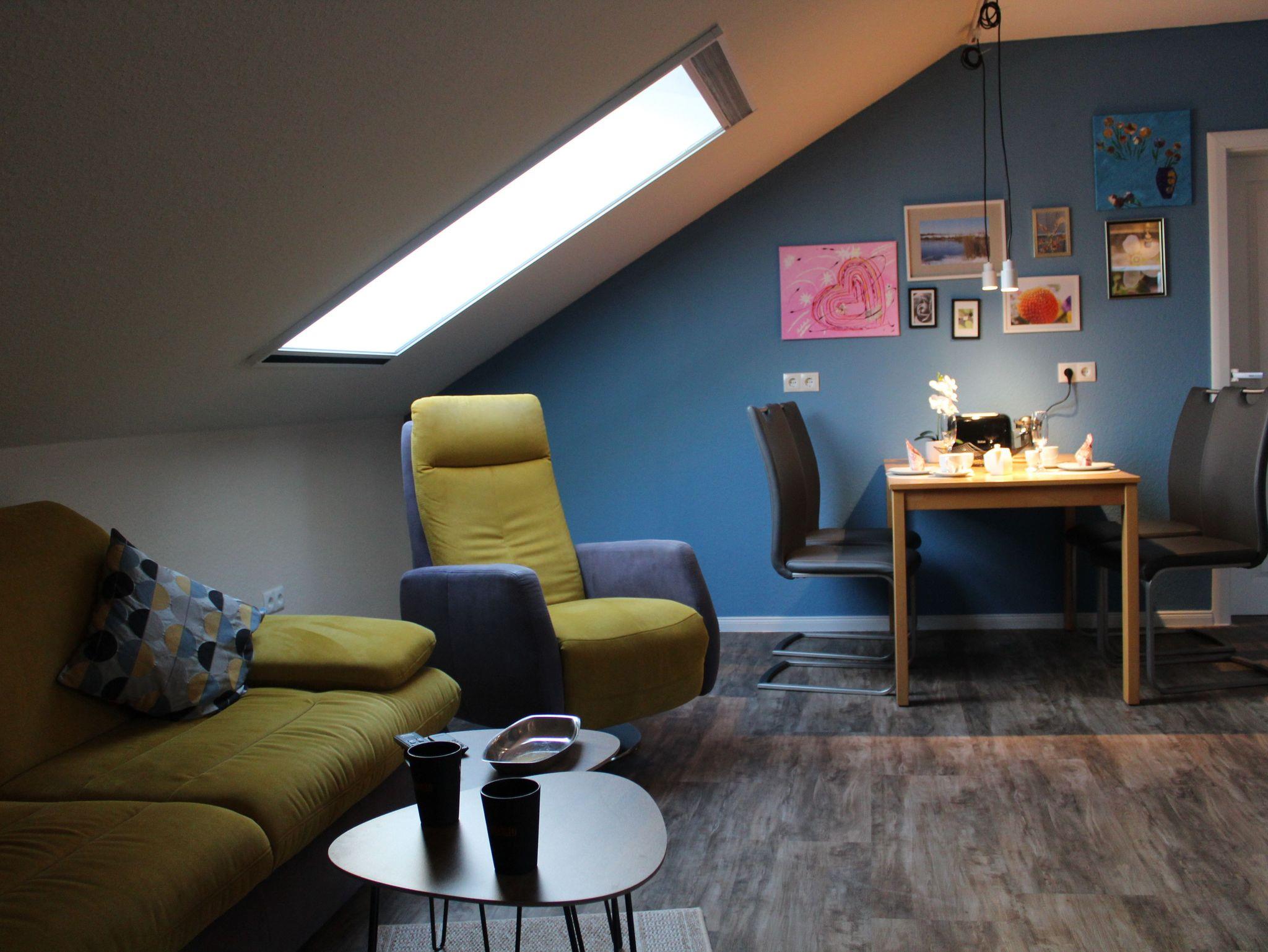 Unsere vollausgestattete Ferienwohnung befindet sich im Obergeschoss eines gepflegten Einfamilienhauses. Der Zugang erfolgt über eine Treppe.