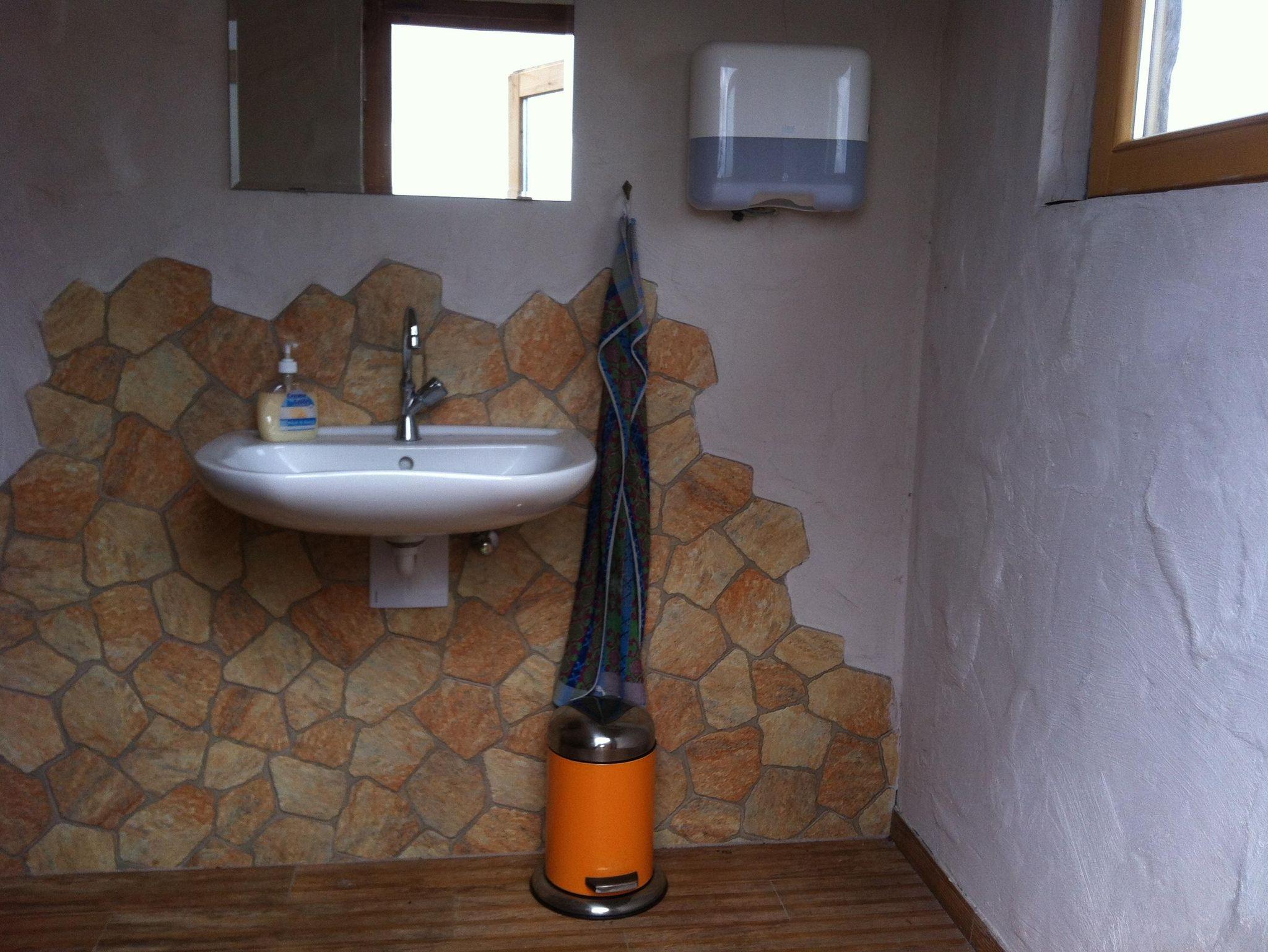 Da sGästezimmers Malve hat ein separates WC, sowie der eigene Waschtisch mit fließendem Kalt- und Warmwasser direkt im Zimmer. Die Sanitäreinrichtungen des Campingplatzes stehen darüber hinaus ebenfalls zur Nutzung bereit.