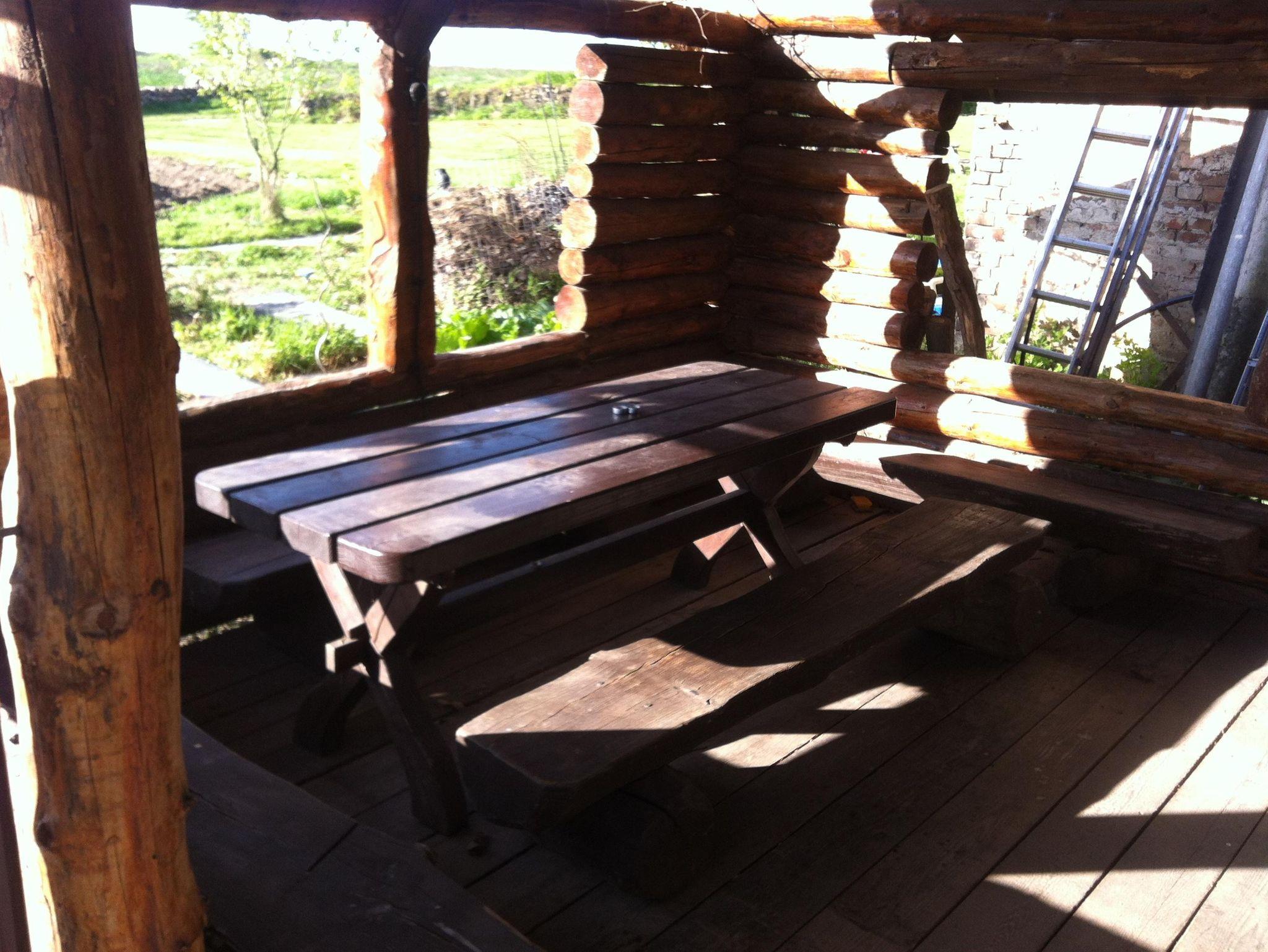 Zur Blockhütte gehören außerdem eine eigene überdachte Terrasse sowie Garten und Gartenmöbel. Dadurch finden auch größere Gruppen ausreichend Platz – unabhängig vom Wetter. Die überdachte Terrasse ist ideal für gesellige Abende, lange Tafeln oder entspannte Pausen im Freien.