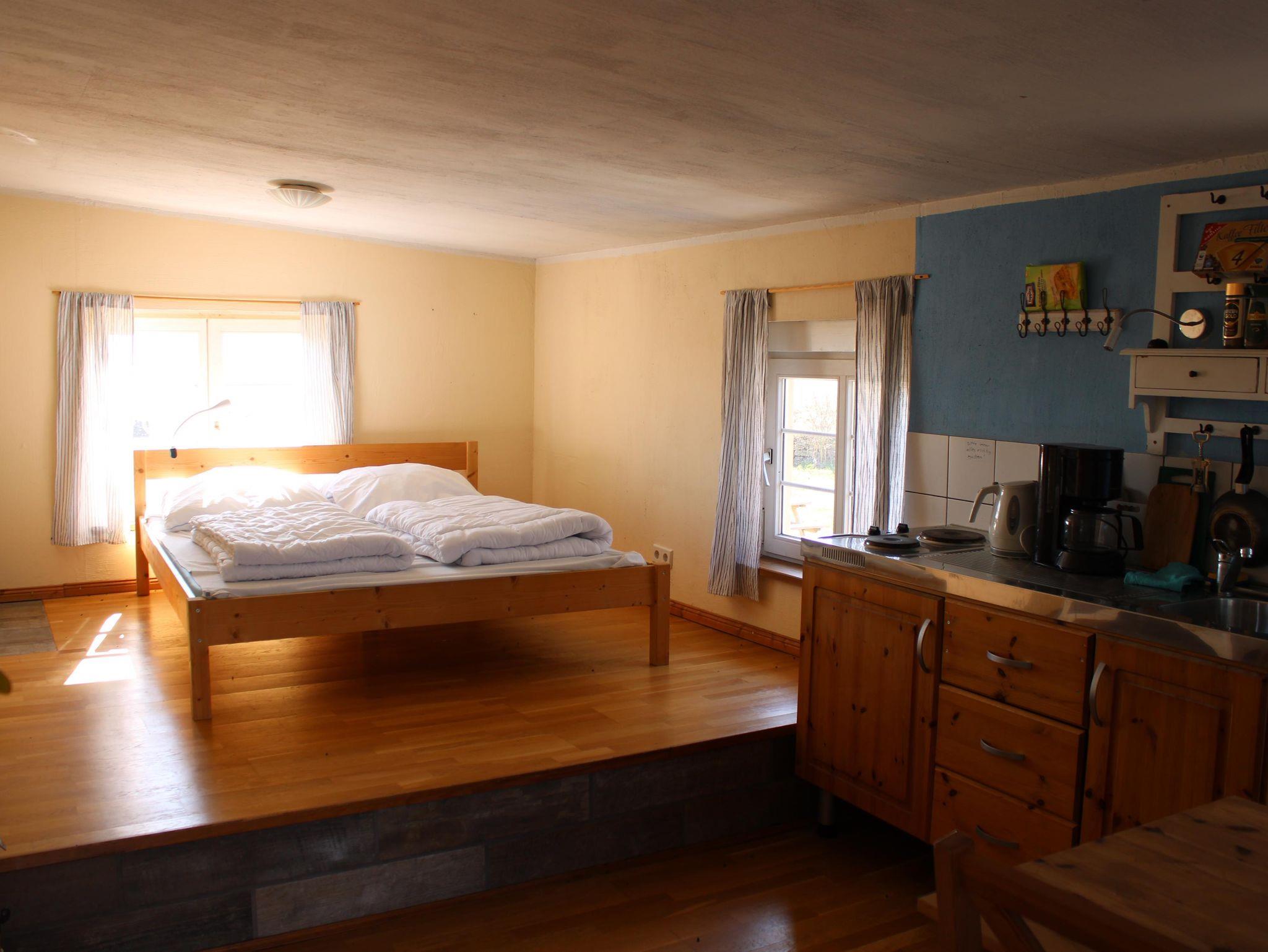 Die Wohnung verfügt über einen gemütlichen Wohn- und Schlafbereich, der funktional und komfortabel gestaltet ist. Die integrierte Kochnische ist mit einem Elektroherd, einem Geschirrspülbecken, einem Kühlschrank sowie einer Kaffeemaschine ausgestattet und bietet dir optimale Möglichkeiten zur Selbstversorgung. Ein Radio sorgt zusätzlich für Unterhaltung und eine angenehme Atmosphäre.