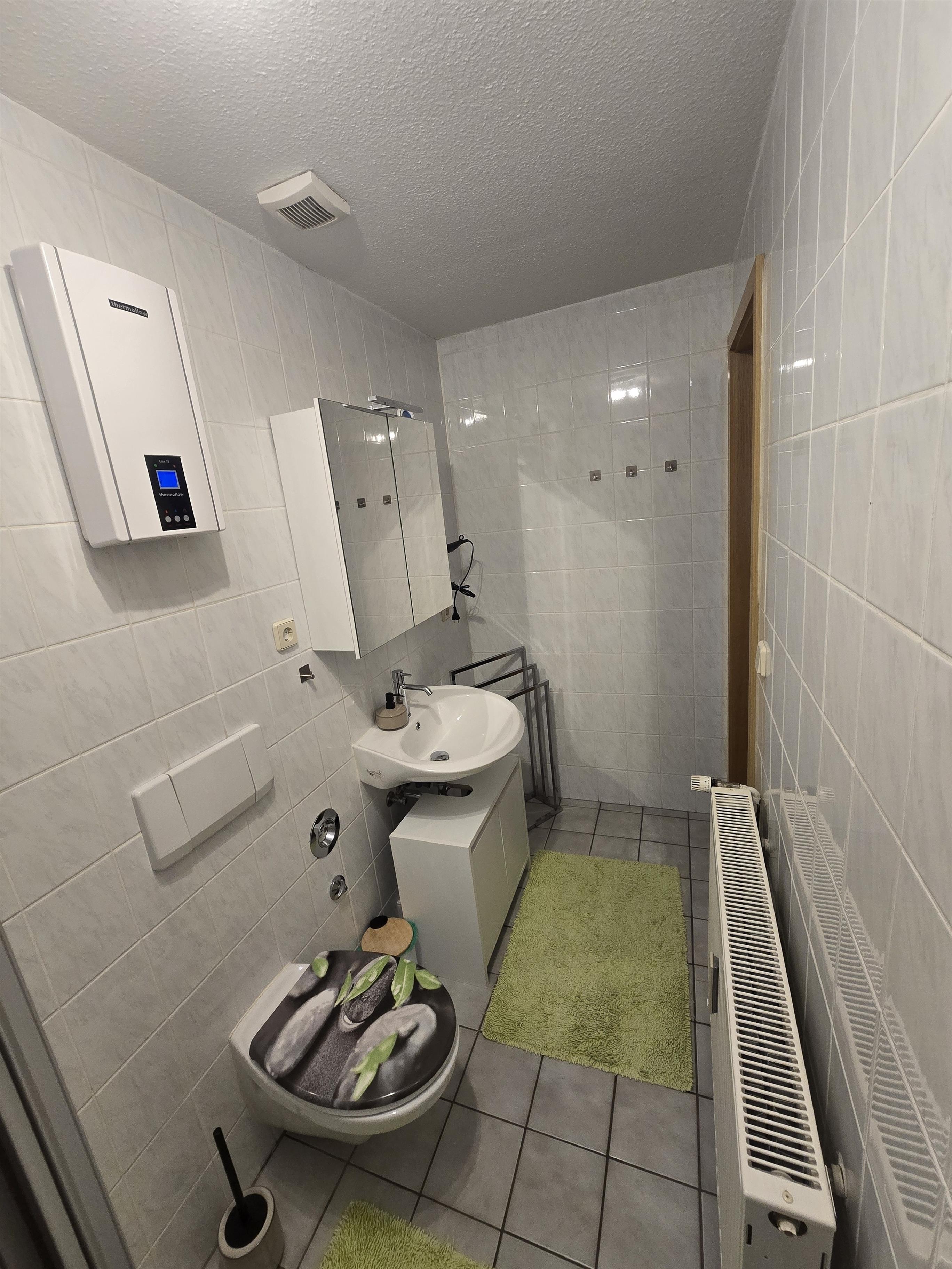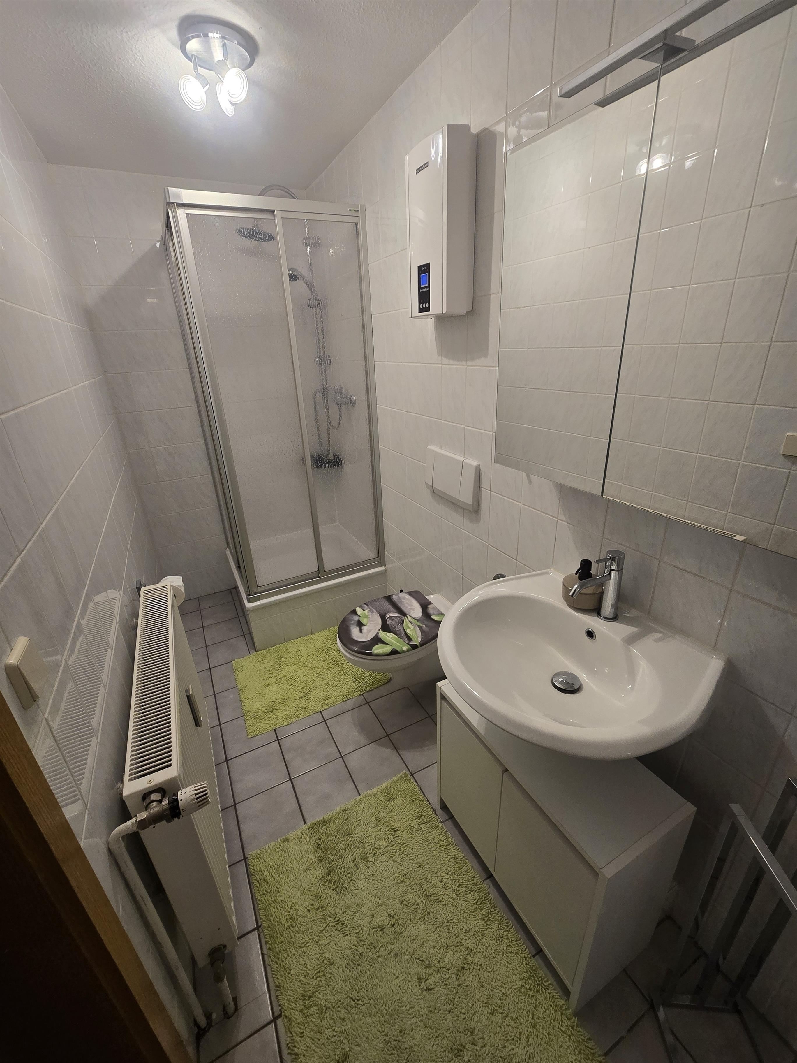 Das Bad ist mit einer Toilette und Dusche ausgestattet.