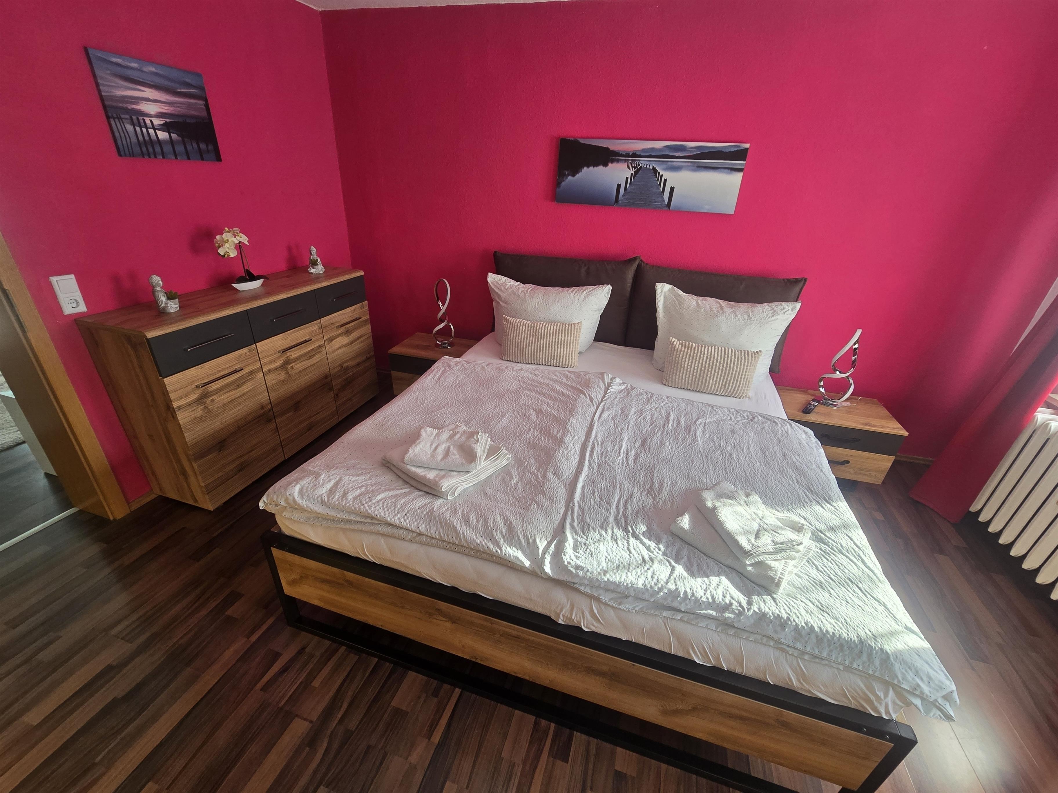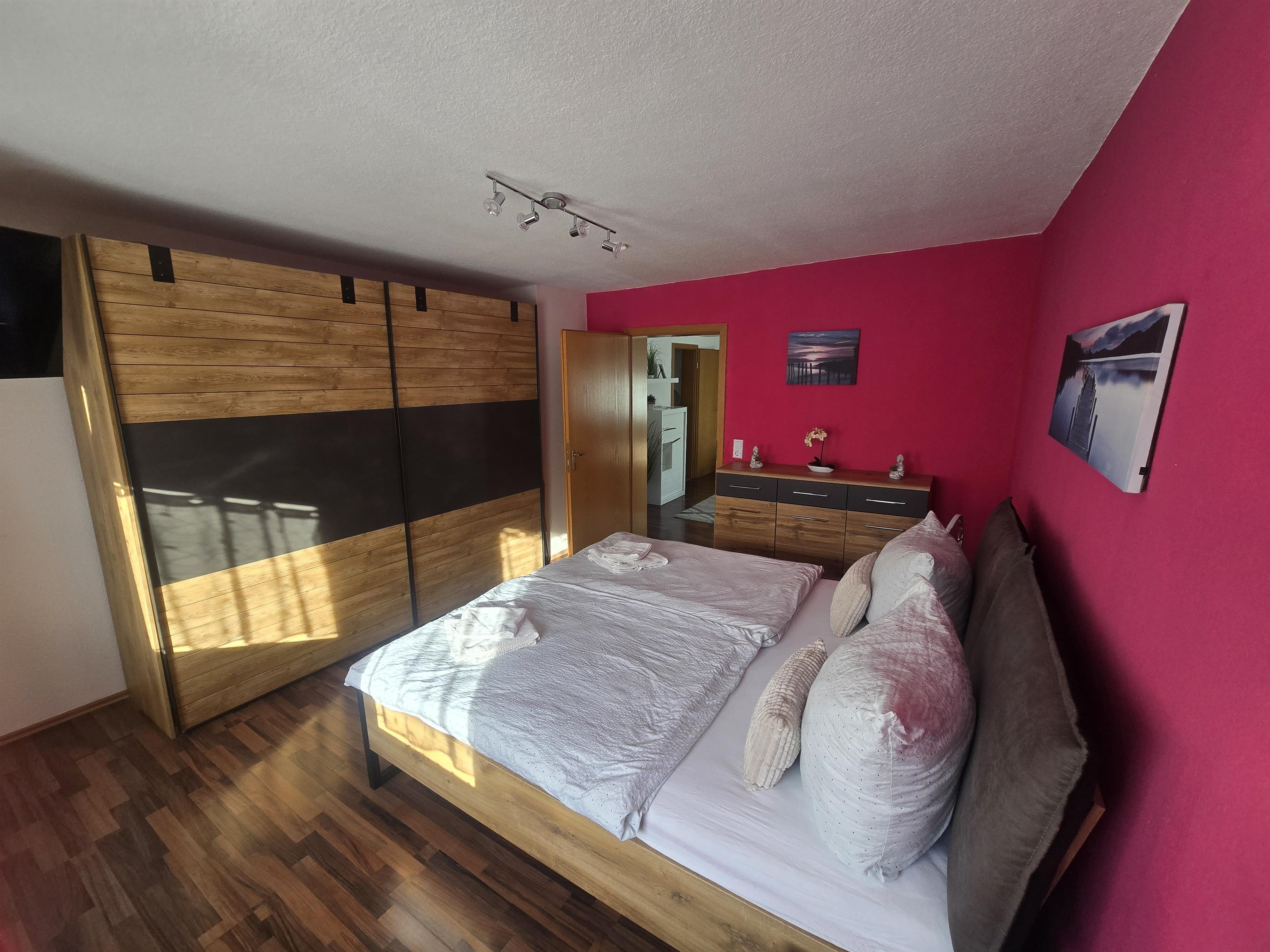 Im Schlafzimmer steht ein Doppelbett und Kleiderschränke.