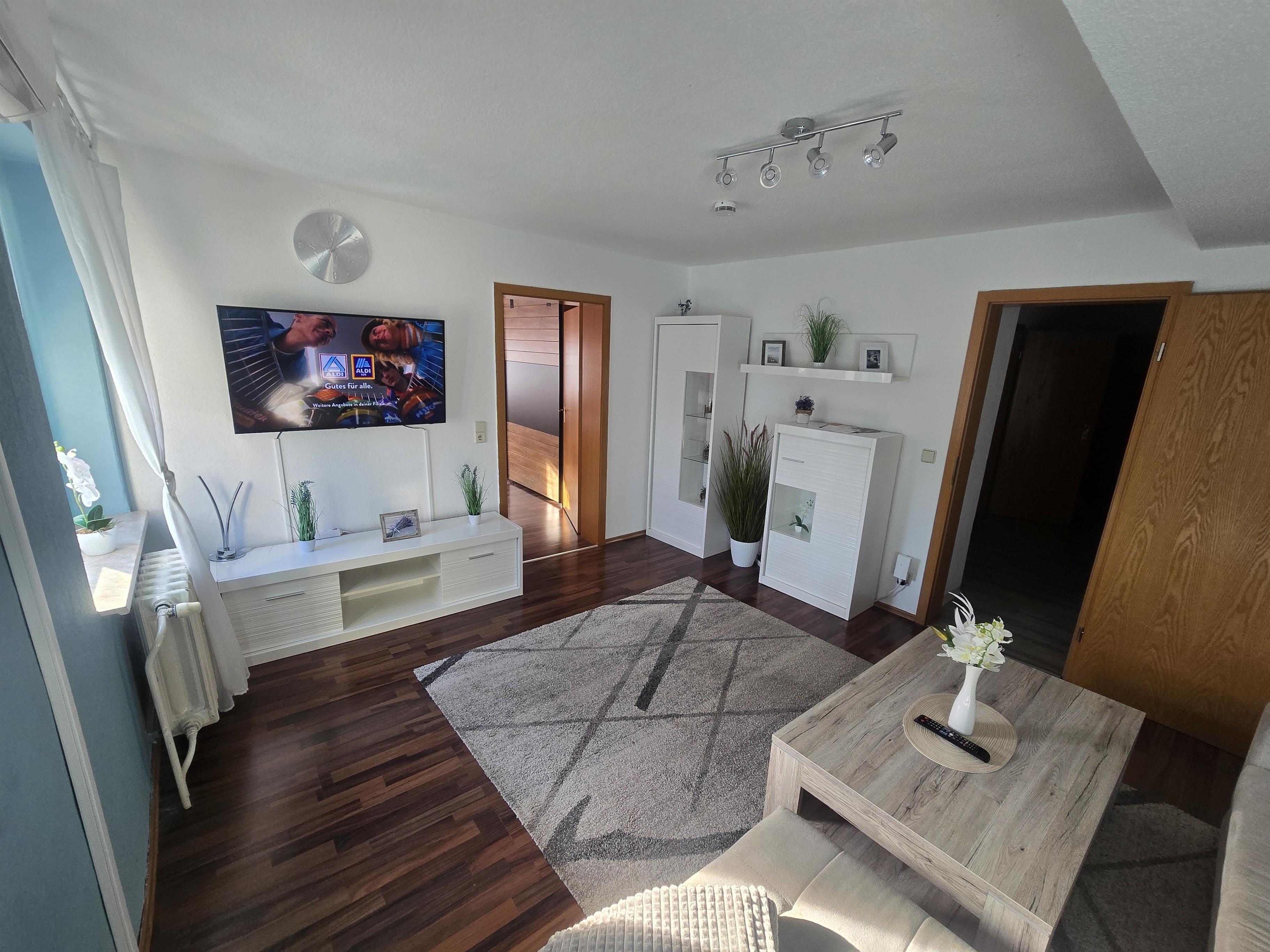 Das Wohnzimmer ist mit einem Fernseher, Schränke und einem Ecksofa ausgestattet.