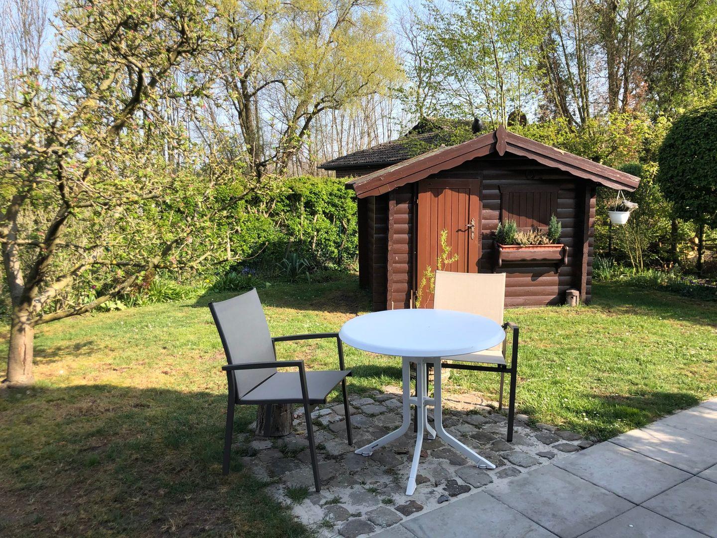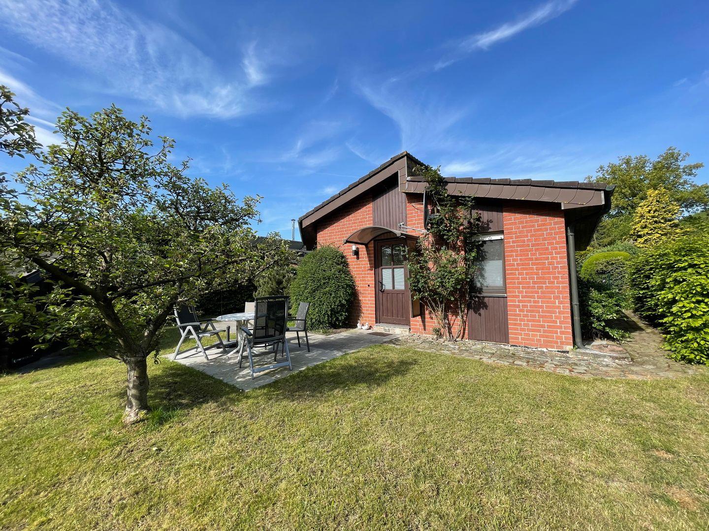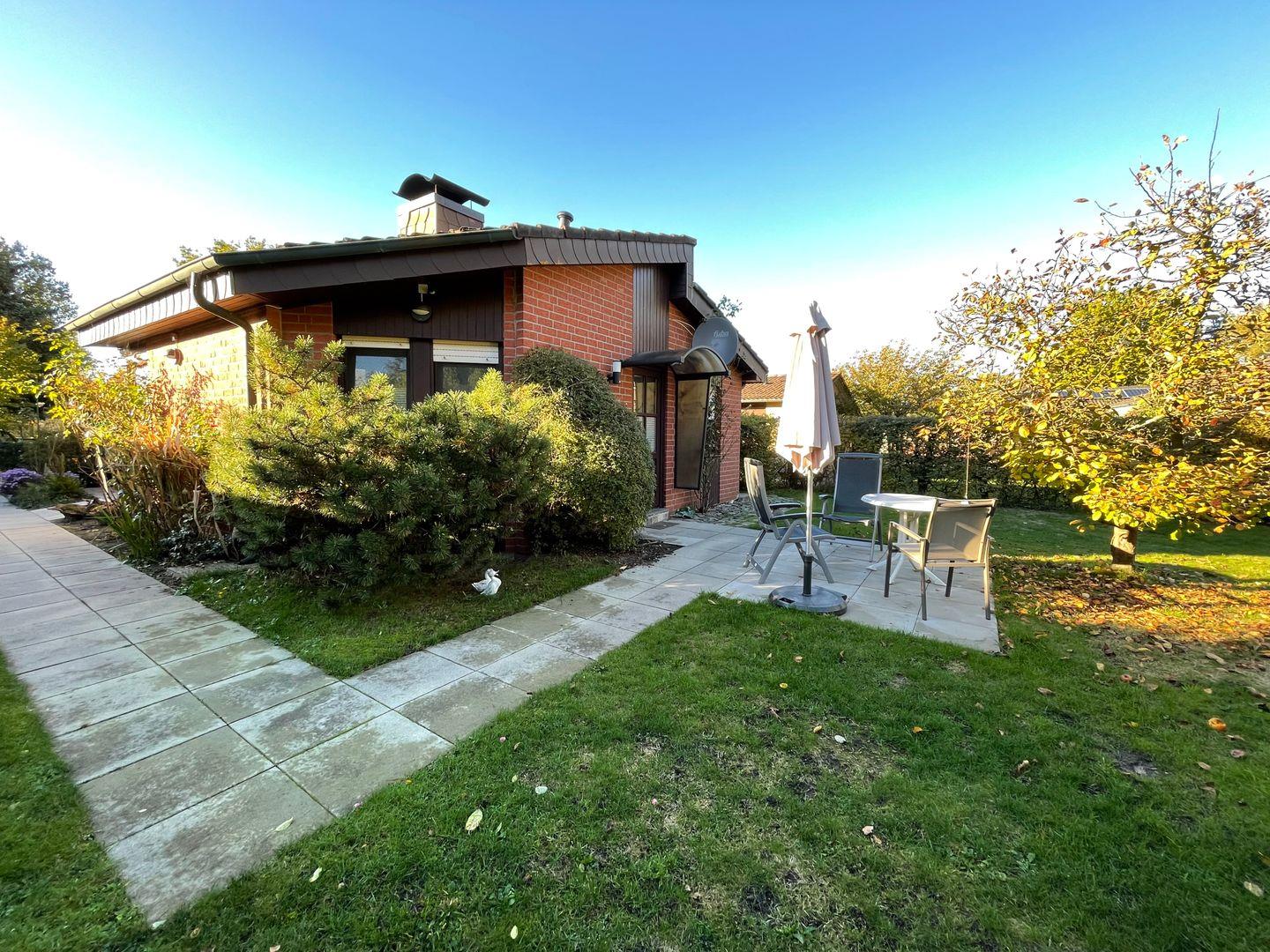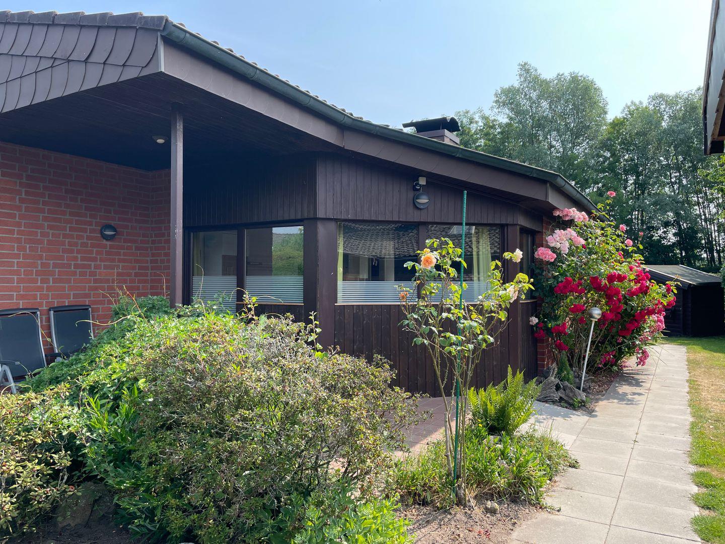 Eine große, überdachte Terrasse lädt dazu ein, die frische Luft zu genießen und den Blick auf den Garten zu schweifen. Der Außenbereich ist eine wahre Oase mit Gartenmöbeln, Sonnenliegen, einem Grillplatz für gemütliche Grillabende und einer Liegewiese. Kinder sind herzlich willkommen und können im abgeschlossenen Grundstück sicher spielen, während die Erwachsenen für sich selbst entspannen oder den Grill anschüren.