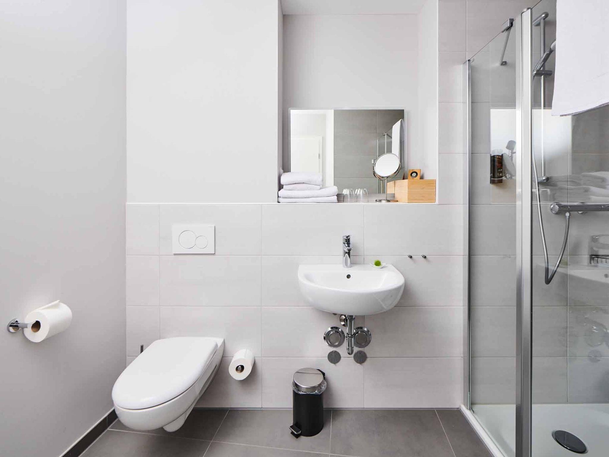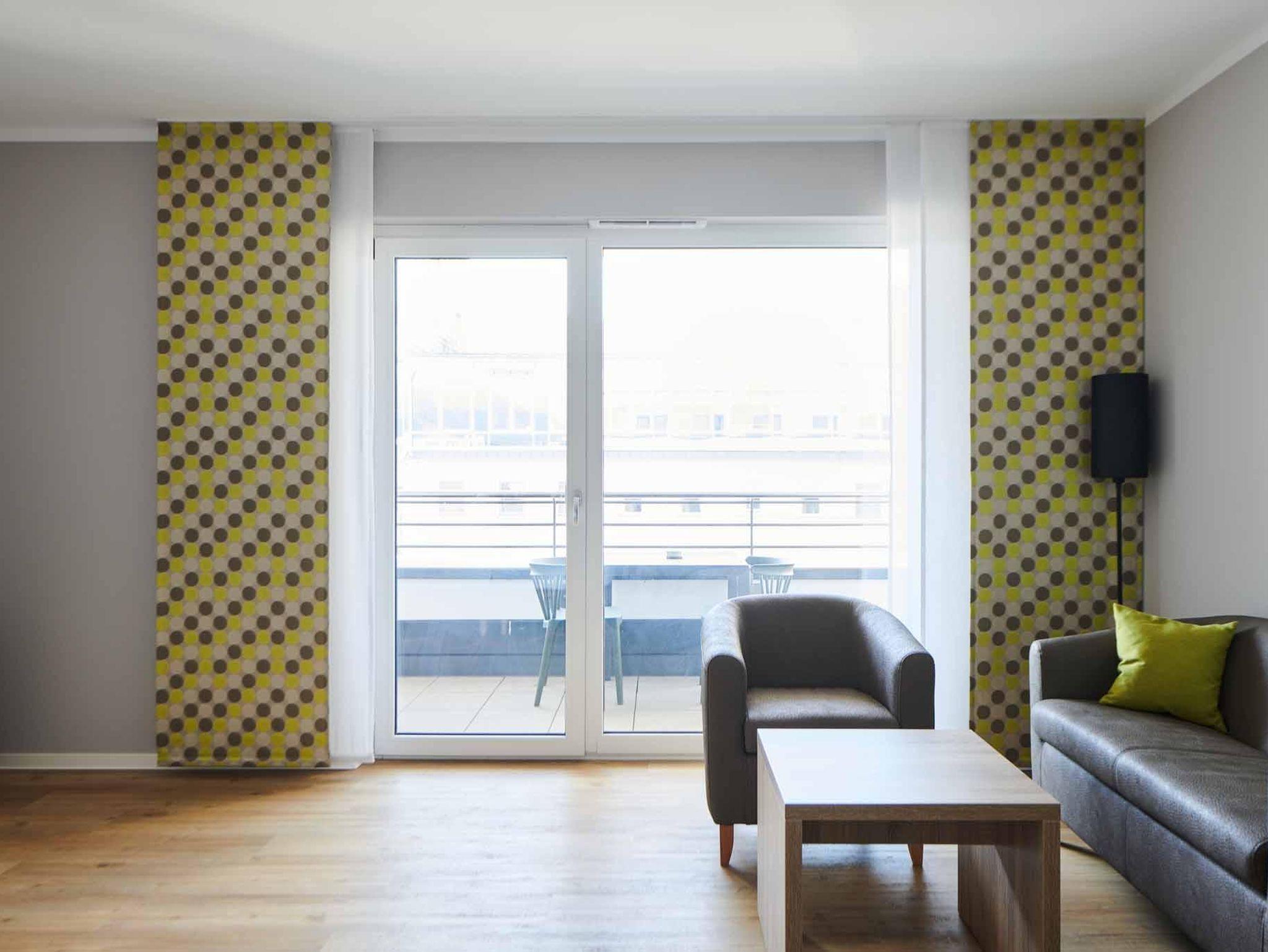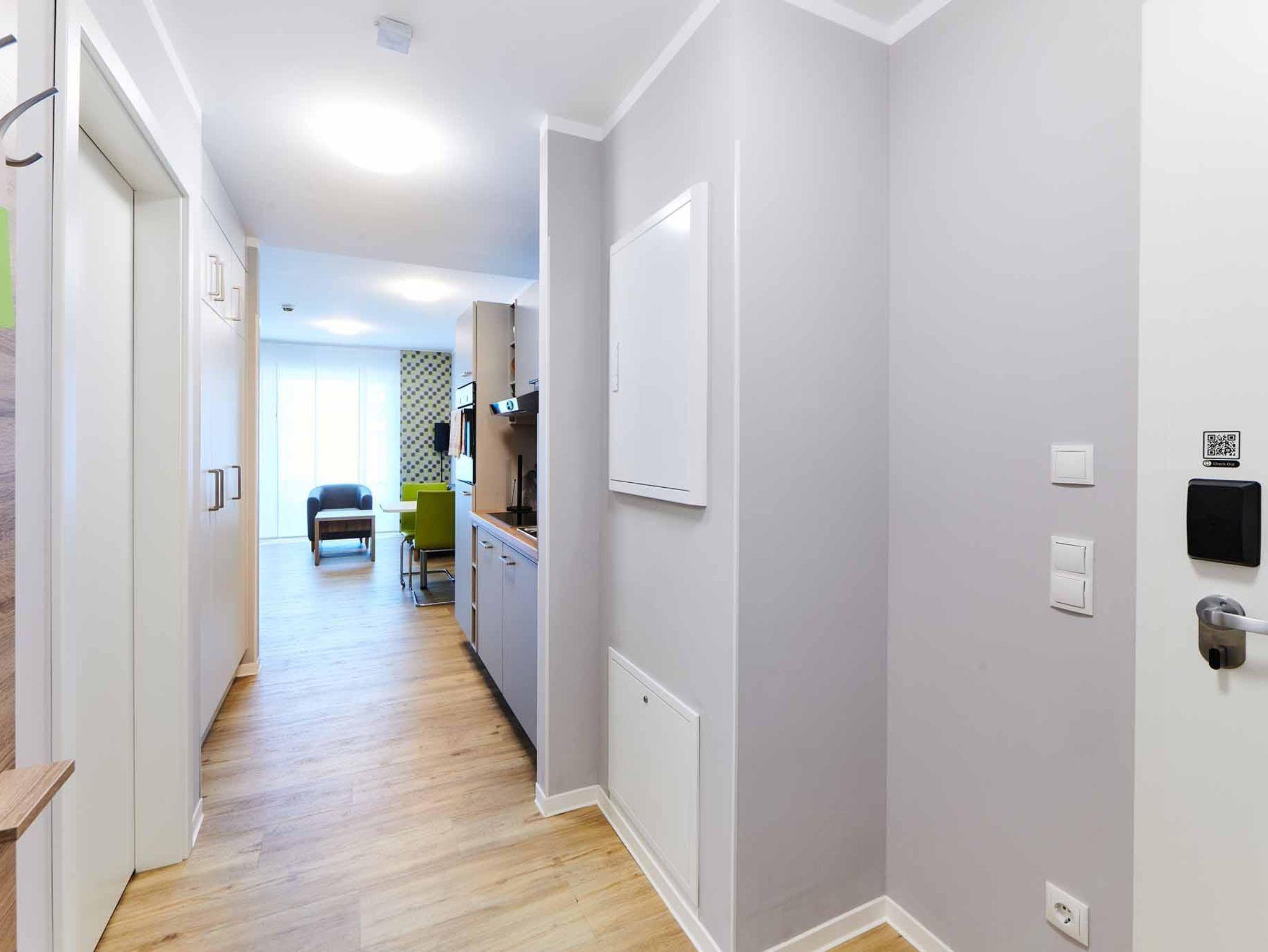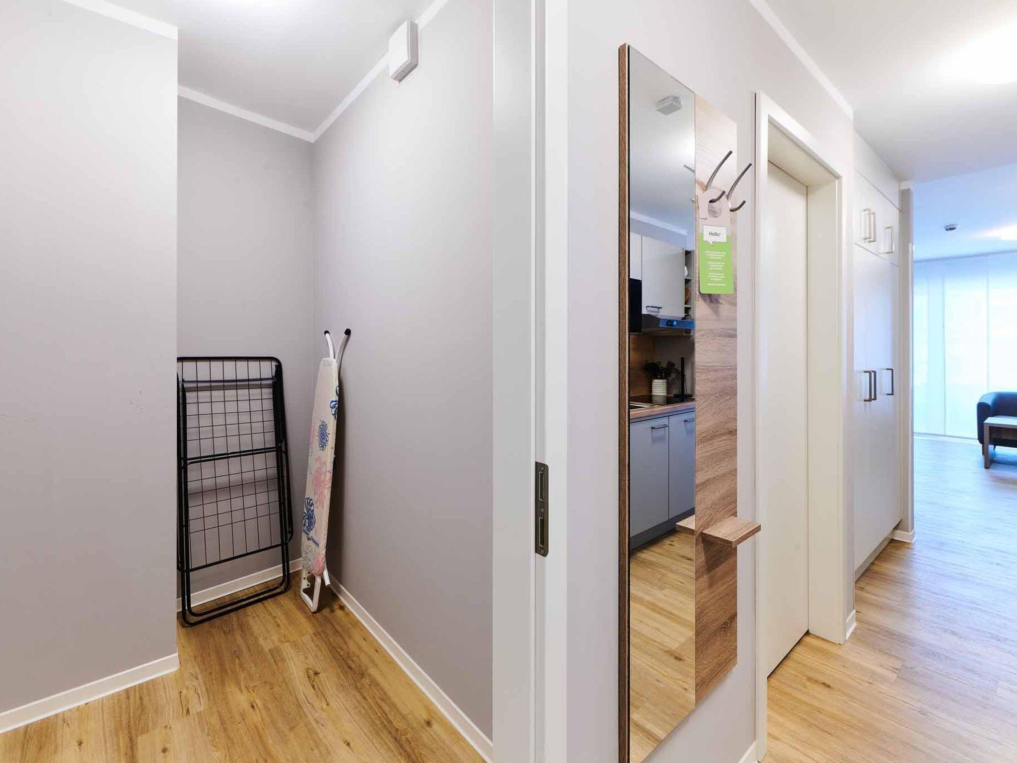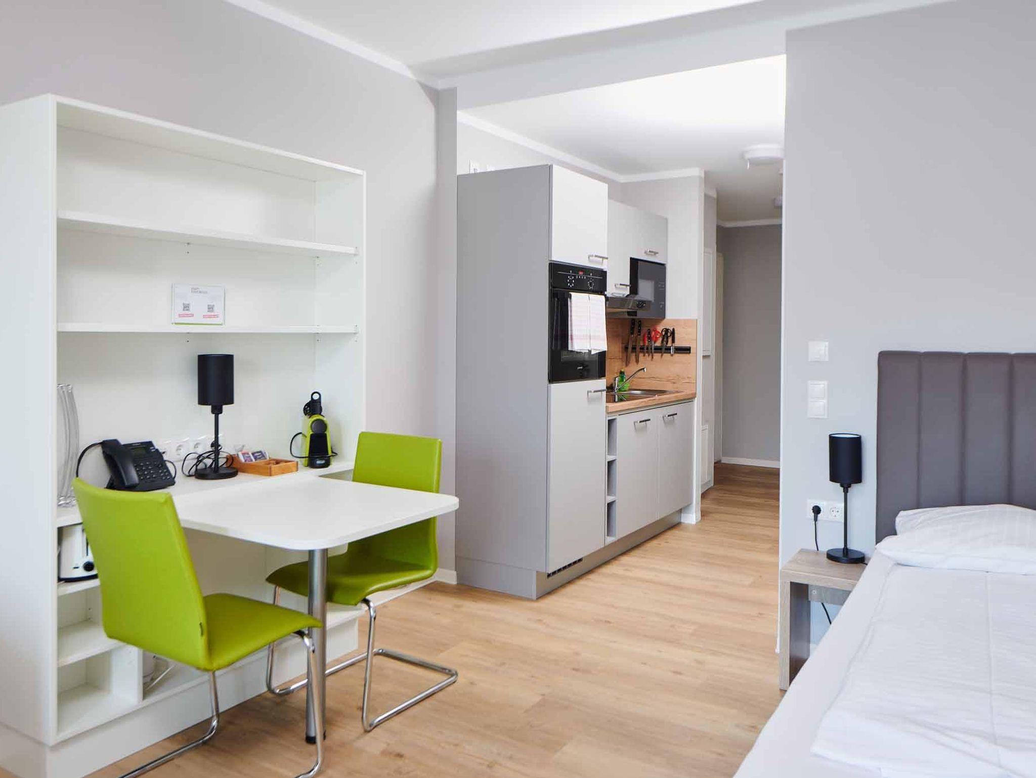 Unsere drei großzügig geschnittenen Einzel- und Doppel-Apartments der Größe M mit 45 qm vereinen stilvolles Design mit durchdachtem Komfort – ideal für gehobenes Wohnen auf Zeit. Die großen Glasfronten und die private Terrasse lassen viel Tageslicht herein und schaffen ein offenes, einladendes Ambiente. Jedes Apartment bietet eine voll ausgestattete Küche, ein modernes Bad, reichlich Stauraum und eine hochwertige Ausstattung, die keine Wünsche offenlässt. Für zusätzlichen Komfort sorgen kostenfreie Waschmaschinen und Trockner im Gebäude, kostenloser Kaffee sowie schnelles WLAN – alles, was Sie für ein angenehmes und unabhängiges Wohnerlebnis benötigen.