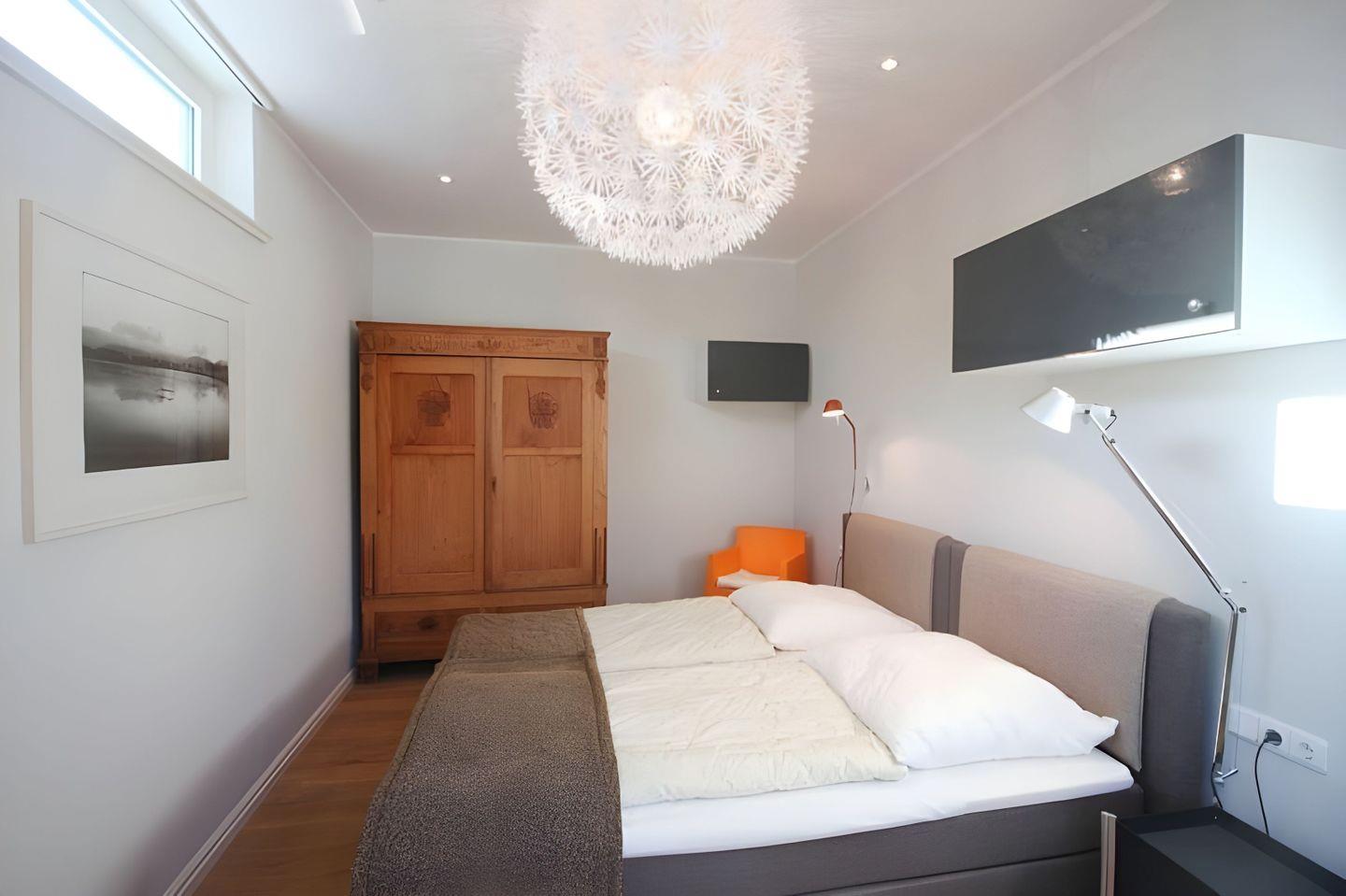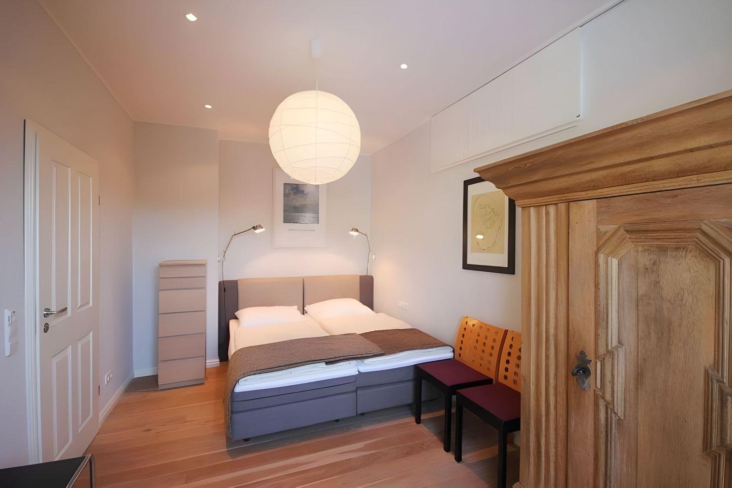 Schlafzimmer sind mit einladenden Doppelbetten und geräumigen Kleiderschränken