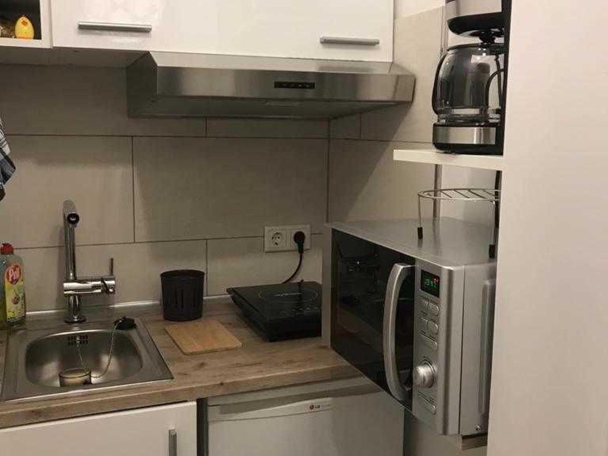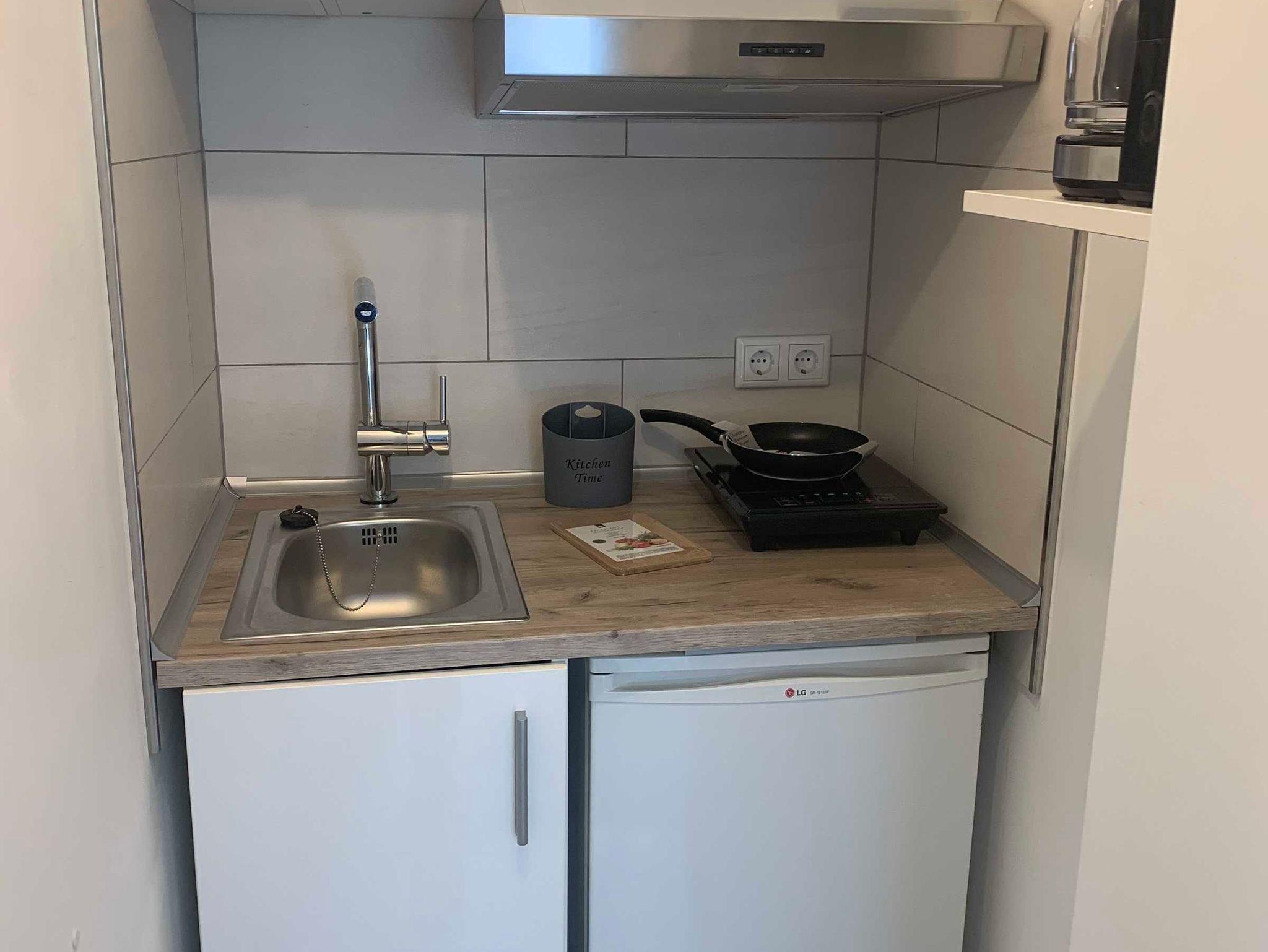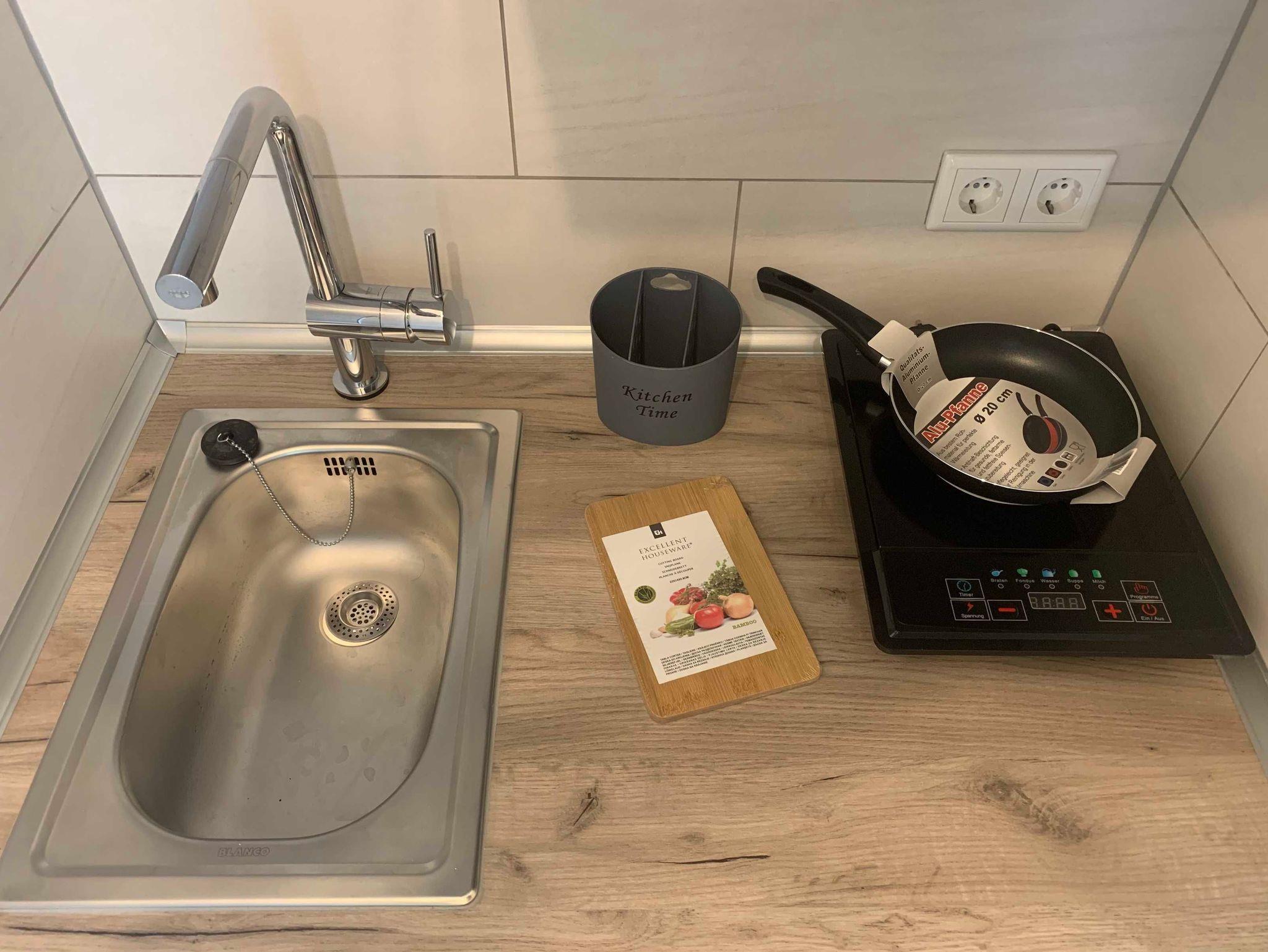 Die kleine Kochnische verfügt über einen Induktionsherd,