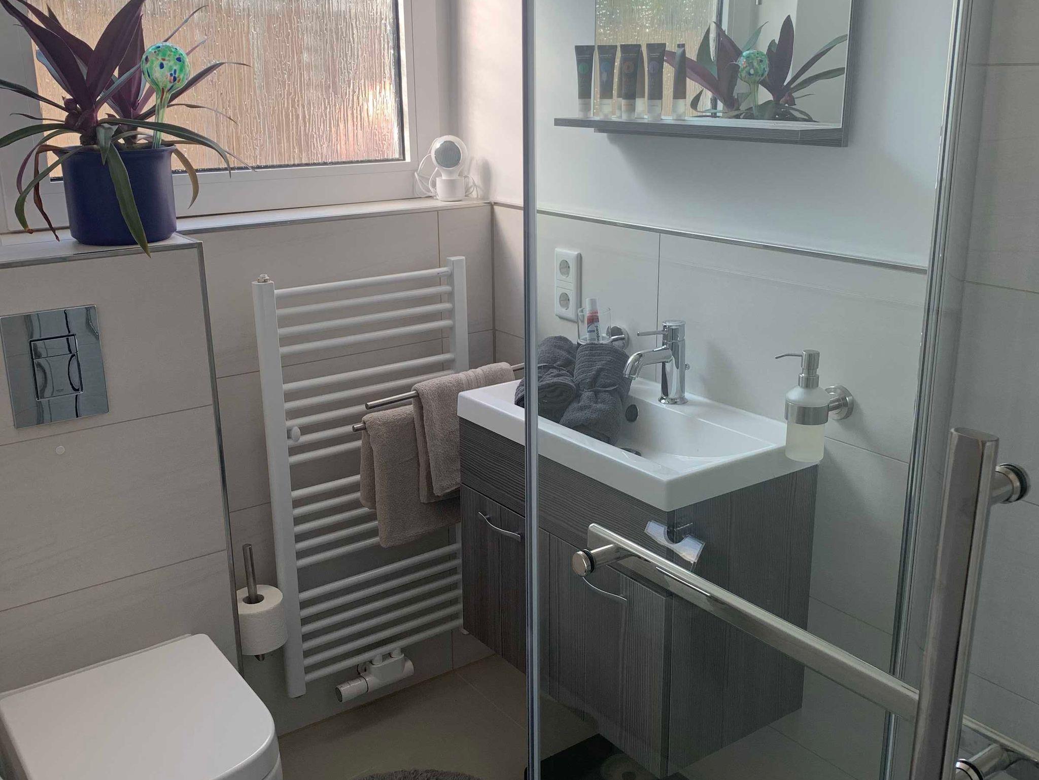 • Bad: Die moderne und neu eingerichtete Wohnung verfügt über ein separates WC mit bodentiefer großer Regendusche, Hänge-WC sowie einem Waschbecken mit Spiegel. Duschgel & Shampoo stehen kostenfrei zur Verfügung. Hand- und Badetücher sowie Badvorleger sind immer frisch für Sie vorhanden.