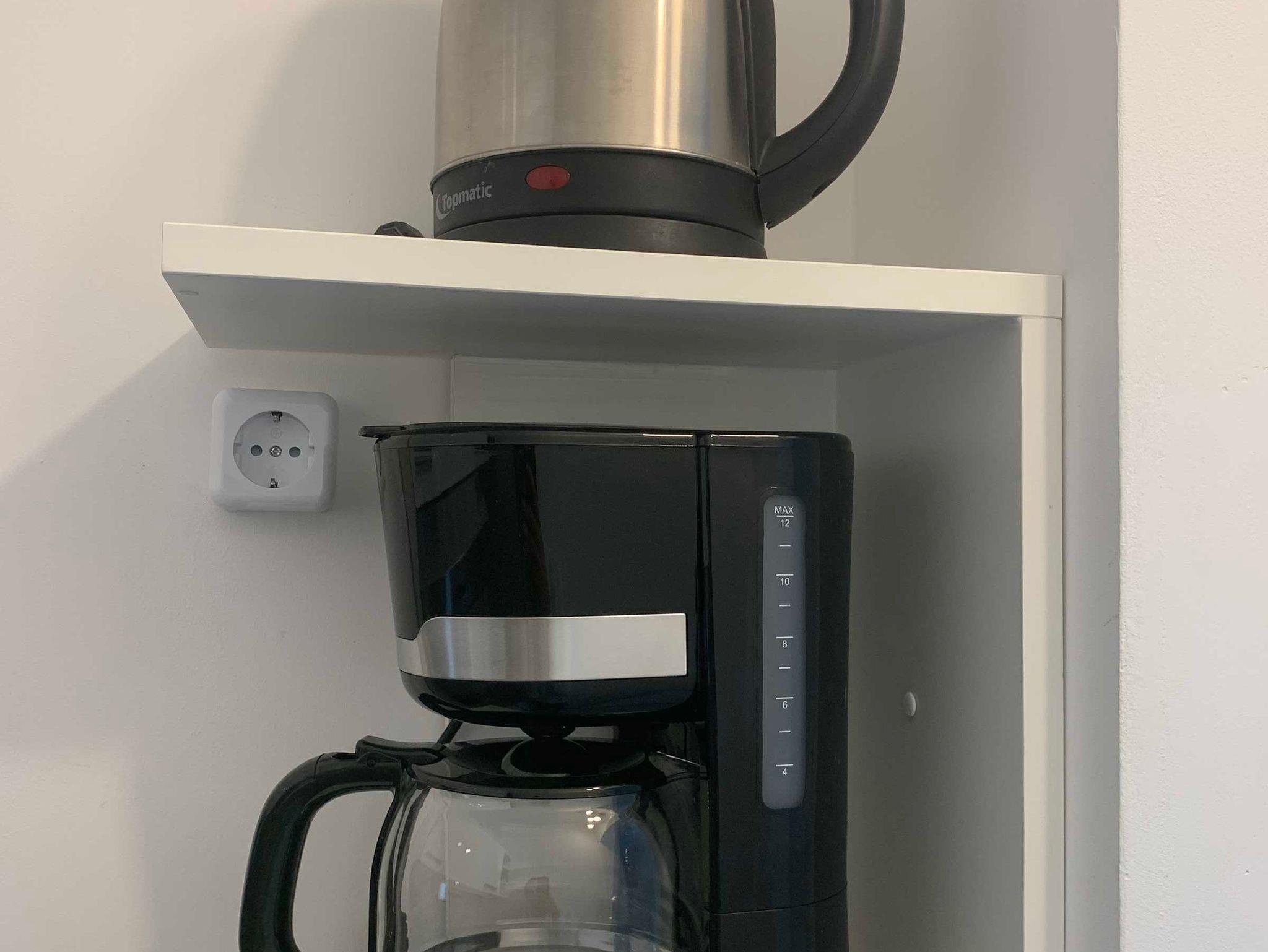 Dunstabzugshaube, Spülbecken, Wasserkocher, Kaffeemaschine, Kühlschrank