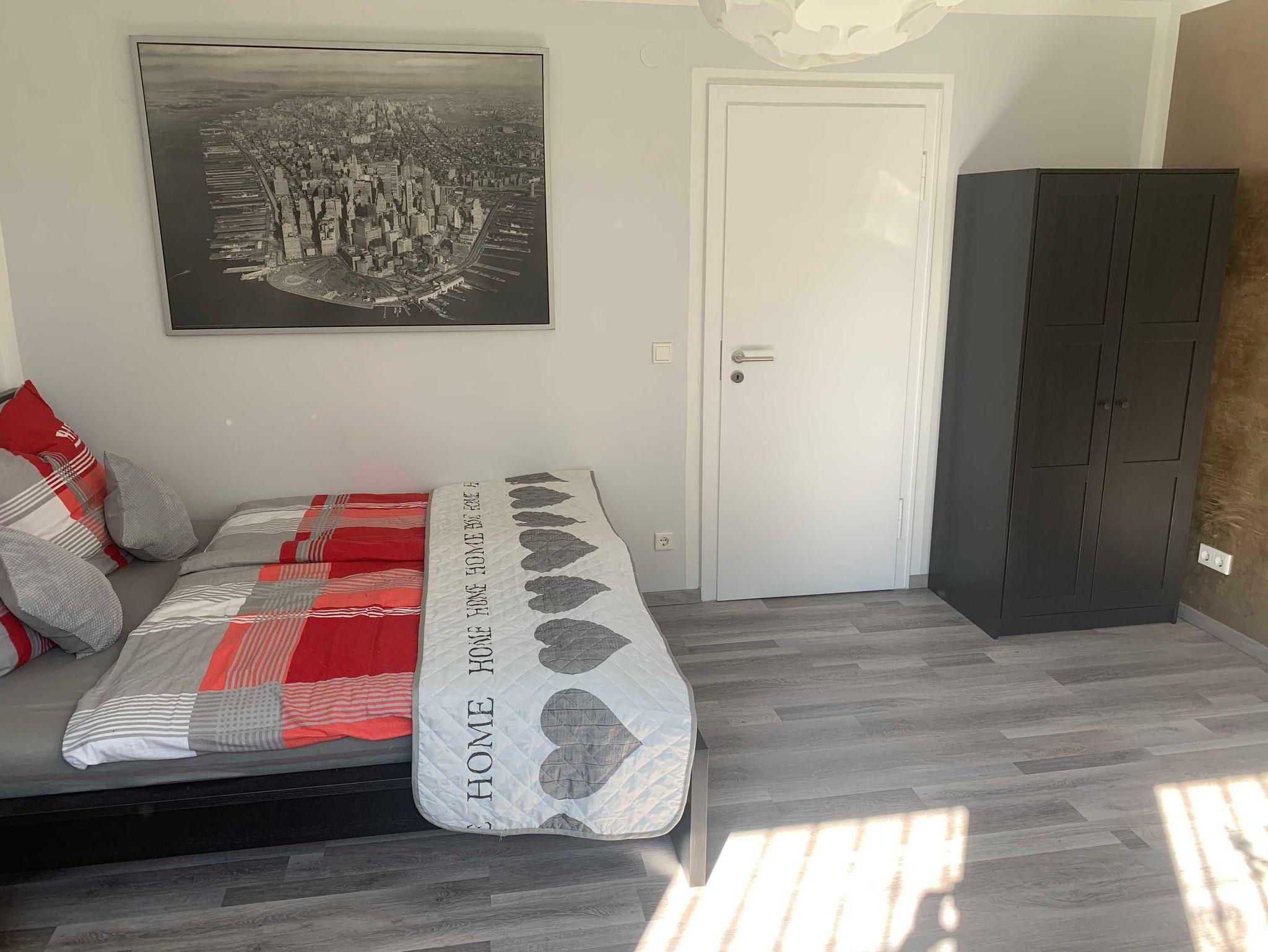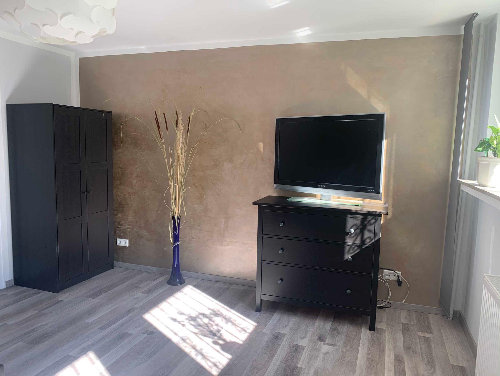 • Wohn-/ Schlafzimmer: Der große Wohn- und Schlafbereich verfügt über ein bequemes 160x200cm Doppelbett. Bei Bedarf kann ein Kind im Gästebett übernachten. Ein (ausziehbarer) Tisch mit Stühlen lädt zu Mahlzeiten, Lesen oder auch Arbeiten ein. Im geräumigem Schrank können Sie Ihre persönlichen Gegenstände ablegen, zudem steht eine weitere Kommode zur Verfügung. Ein großer 42 Zoll TV mit Satellitenanschluss (Astra+Hotbird) sowie kostenfreies WLAN stehen während Ihres Aufenthaltes zur Nutzung. - Flur: Im separaten Eingangsbereich können Sie Ihre Jacken aufhängen und dann den Wohnbereich über eine zweite Tür betreten.