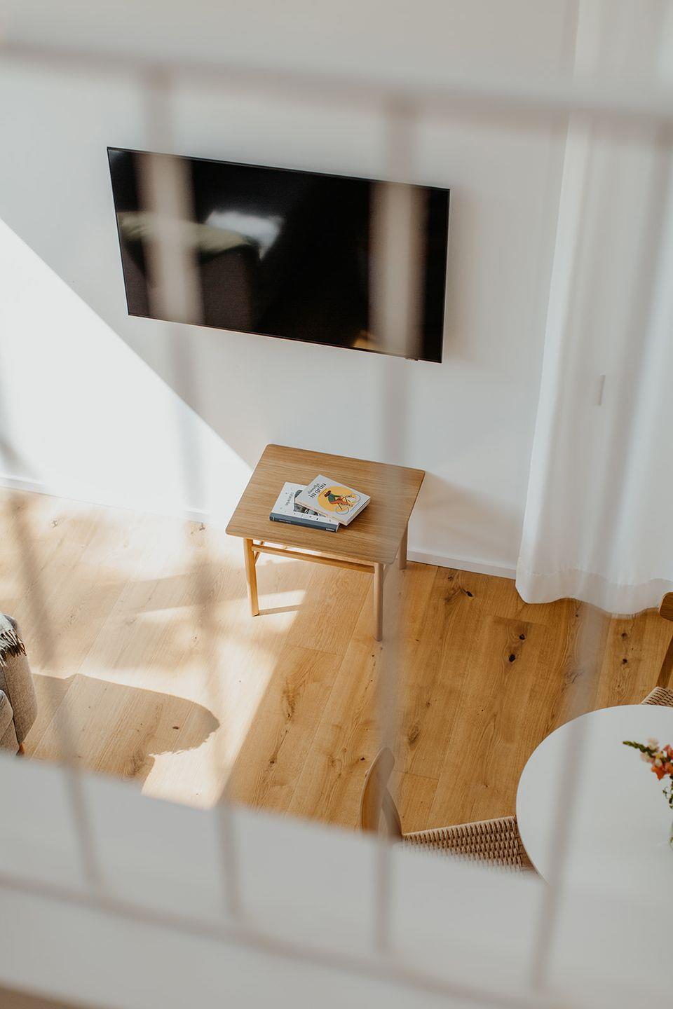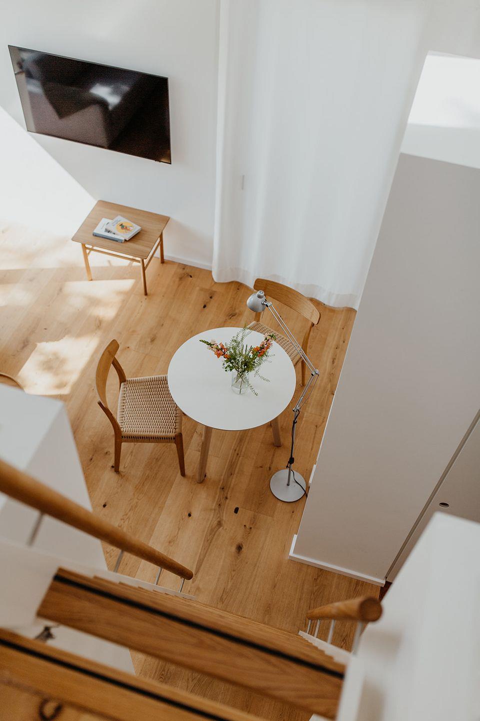 Das Halfhouse ist ein helles, im skandinavischen Stil eingerichtetes Architektenhaus. Es besteht aus einem hellen 30 qm großen Raum mit hohen Decken und Blick in den offenen Giebel. Echtholzdielen und Massivholzmöbel unterstreichen den Stil des Hauses. Neben einer Pantryküche mit 2 Induktionskochplatten, Kühlschrank und Mikrowelle, befinden sich der Aufenthaltsbereich mit Tisch und gepolsterten Stühlen, sowie ein kleines Sofa und der Fernseher.
