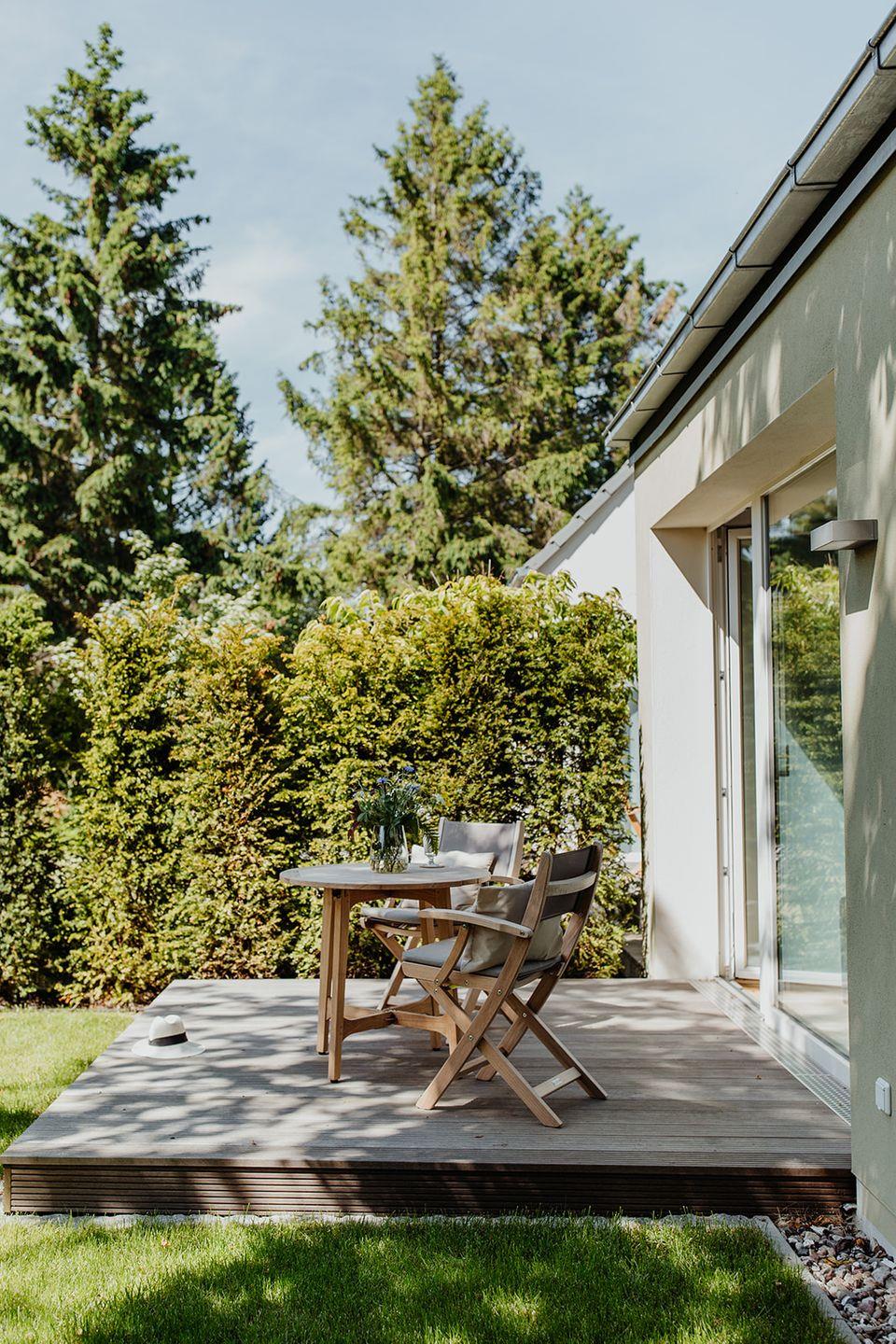 Ein eigener kleiner Garten mit Holzterrasse und Gartenmöblierung lädt nach einem langen Strandtag zum Entspannen ein. Vor dem Haus befindet sich der Parkplatz und die Fahrradständer. In unmittelbarer Nachbarschaft befindet sich auch ein Fahrradverleih.