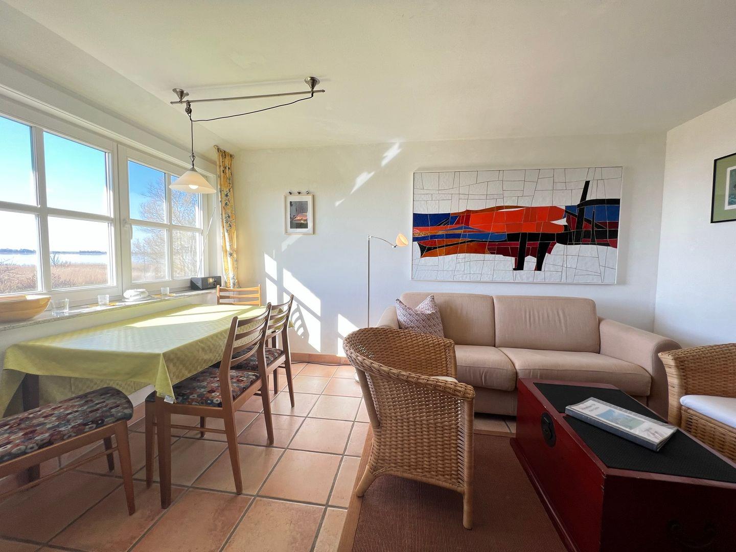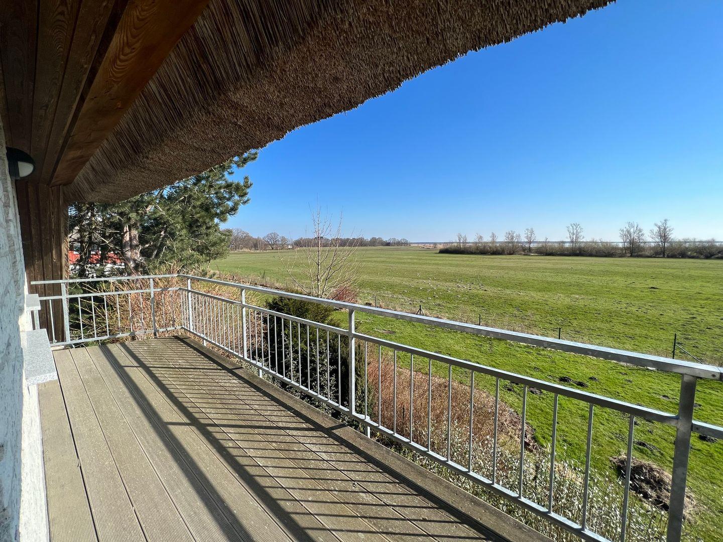 Das Besondere an dieser schönen Ferienwohnung unter Reet mit separatem Eingang ist unter anderem die einzigartige Lage. Erste Reihe auf einem großzügigen Grundstück direkt am Bodden, unmittelbar angrenzend an den Nationalpark Vorpommersche Boddenlandschaft. Hier haben Sie einen unverbaubaren Panoramablick auf Bodden und Nationalpark aus allen Räumen. Der ideale Platz für Gestresste und Erholungssuchende, die den Trubel der Welt hinter sich lassen, aber auch schnell wieder am Leben und Treiben der Seebäder teilnehmen mächten.