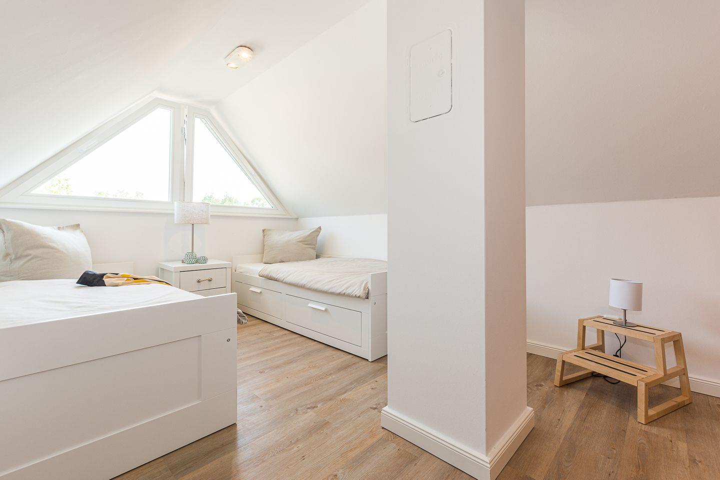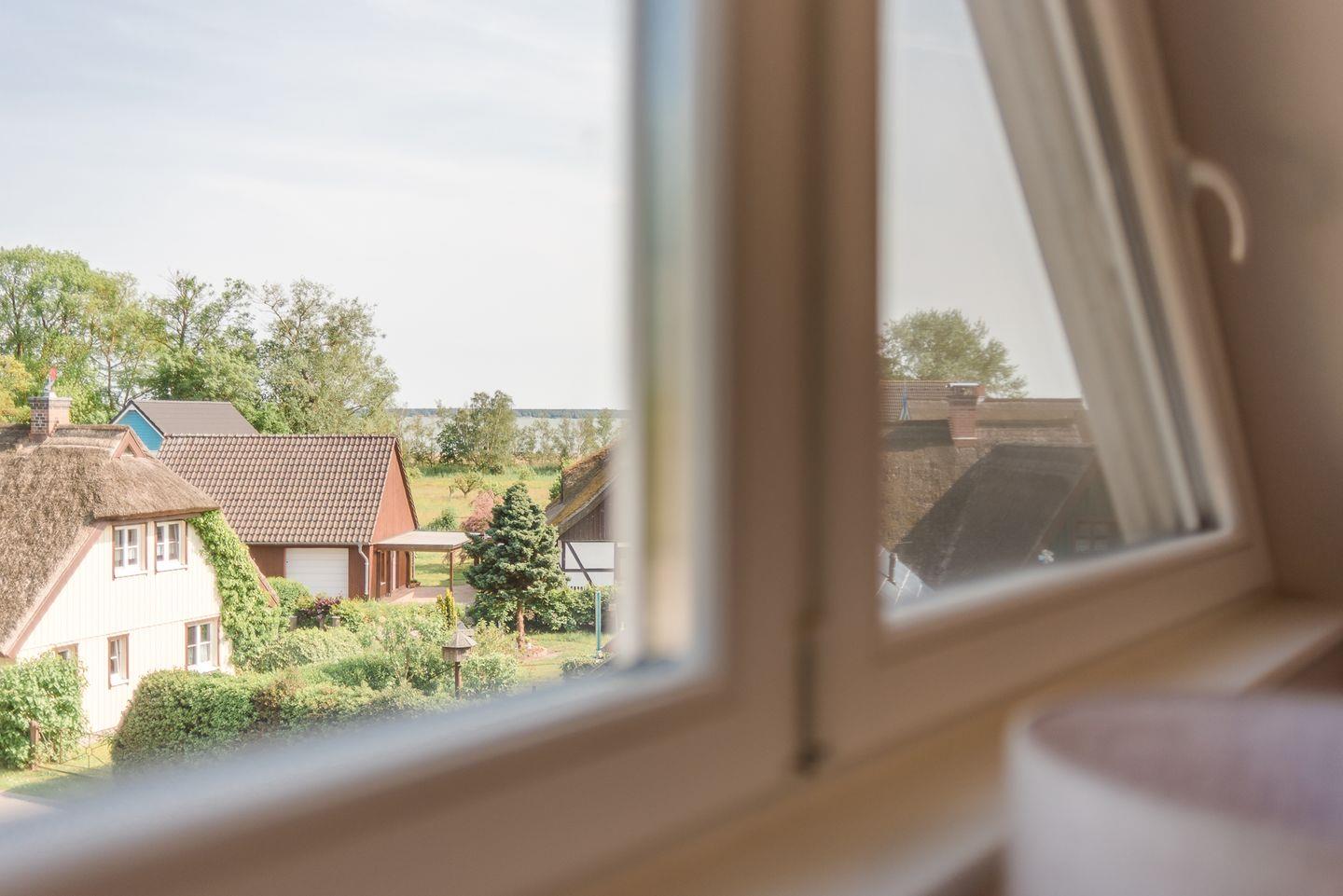 In dem liebevoll eingerichteten Spitzboden stehen zwei Einzelbetten für die Kinder. Von hier aus blicken Sie bis auf den Bodden.