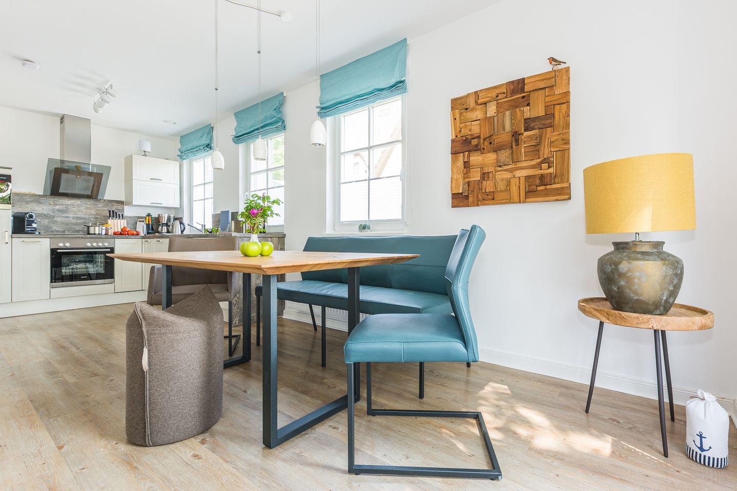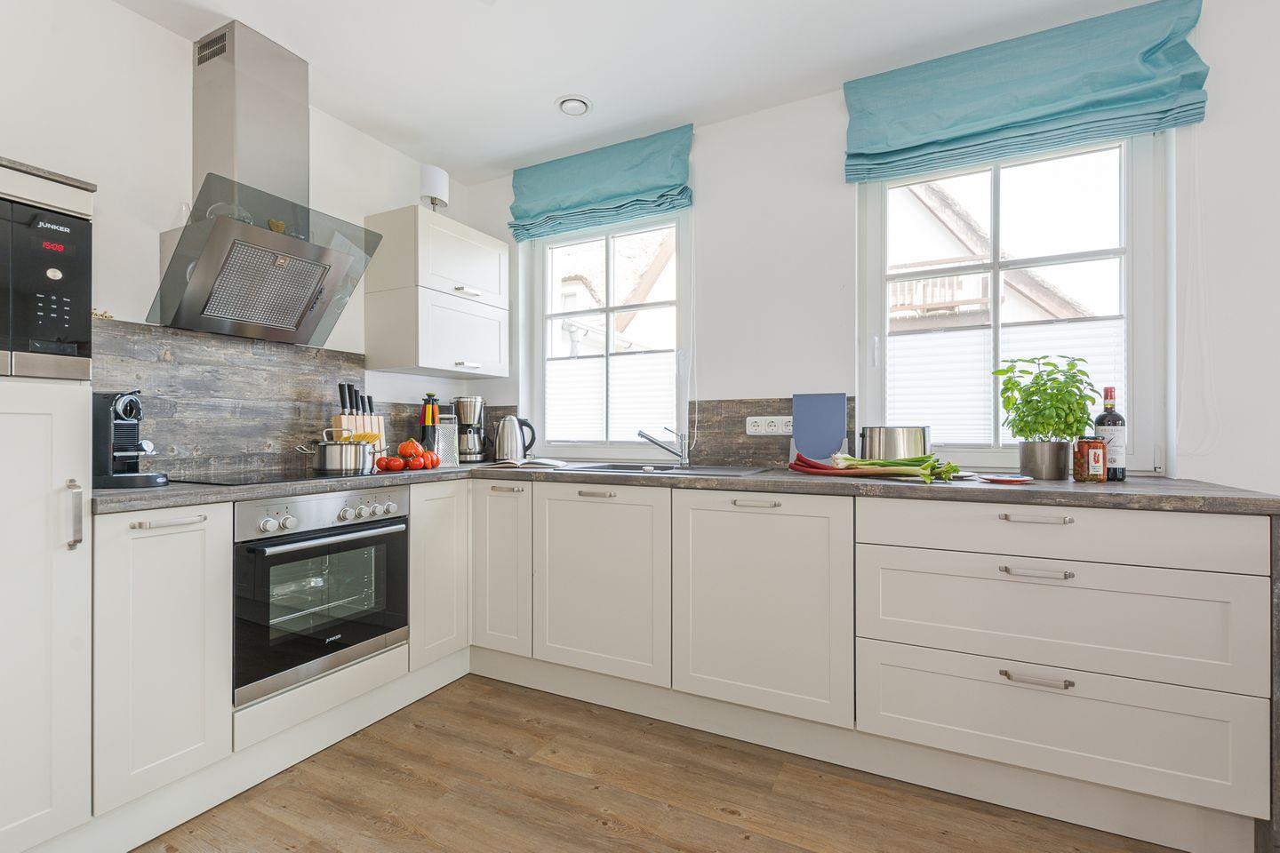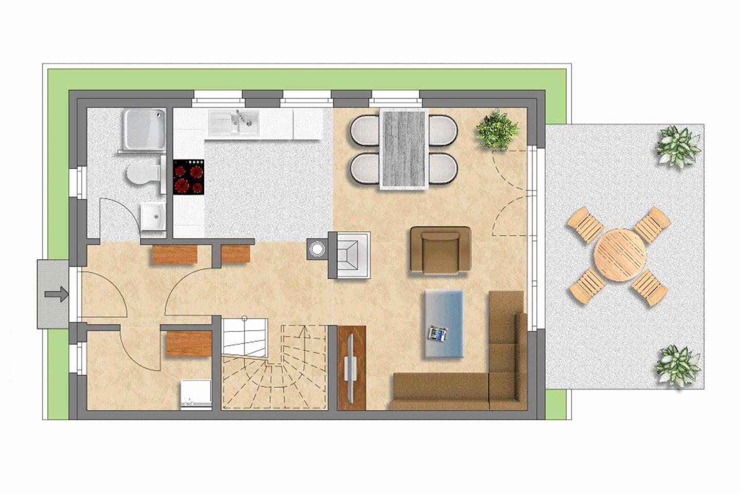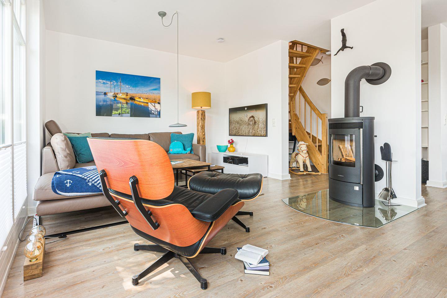 Über den Eingangsbereich gelangen Sie in das Badezimmer mit bodenebener Dusche, WC und Fußbodenheizung und in den licht-durchfluteten Wohnraum mit gemütlicher Sitzecke und Kaminofen. Der einladende Essbereich und die umfänglich ausgestattete Küche sind unmittelbar in den Wohnbereich integriert.