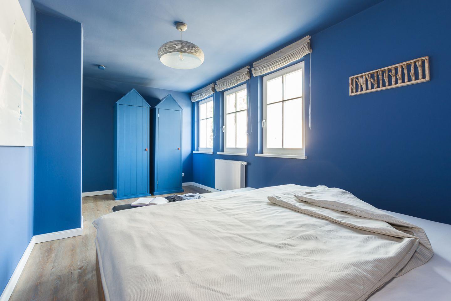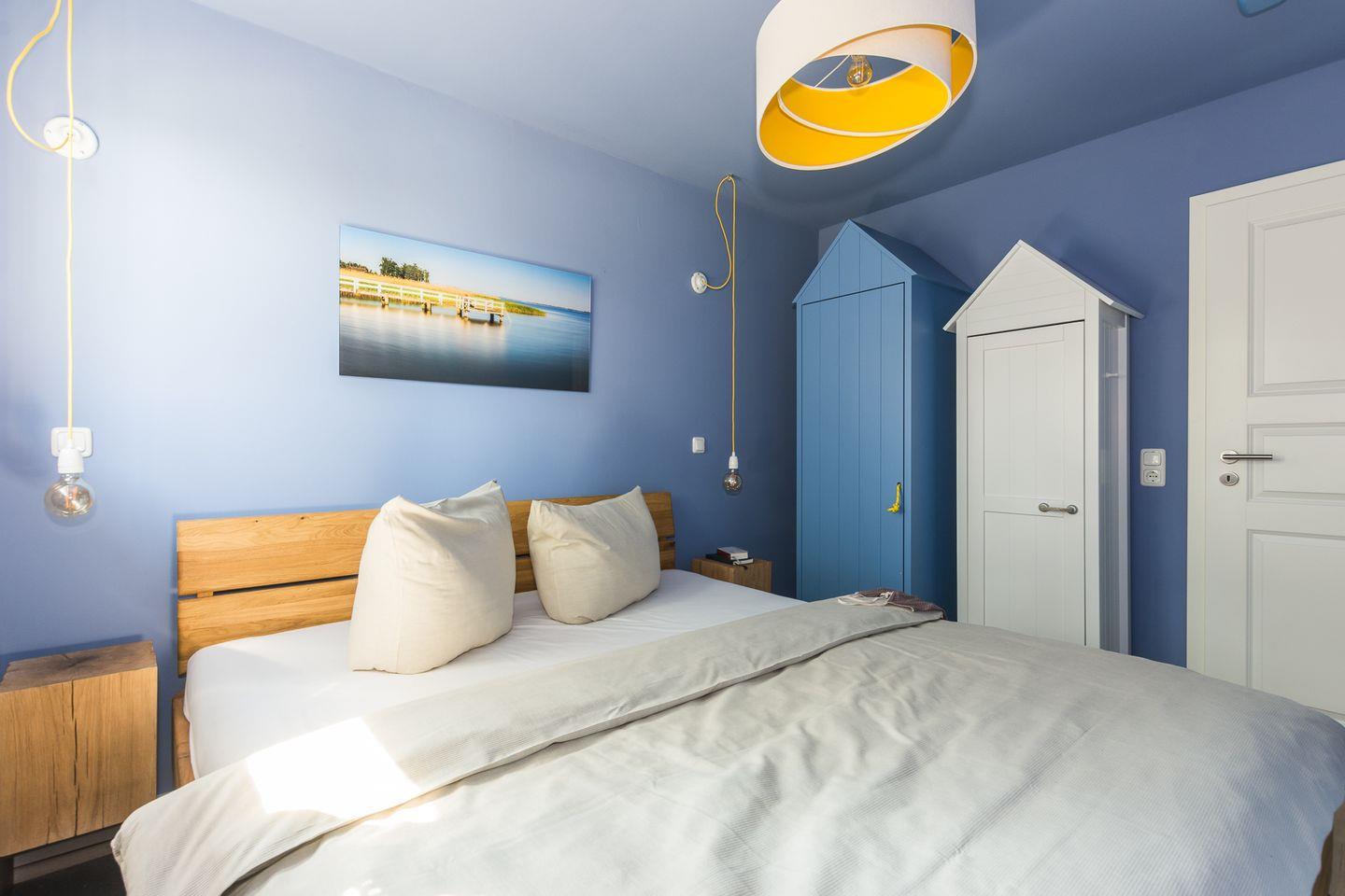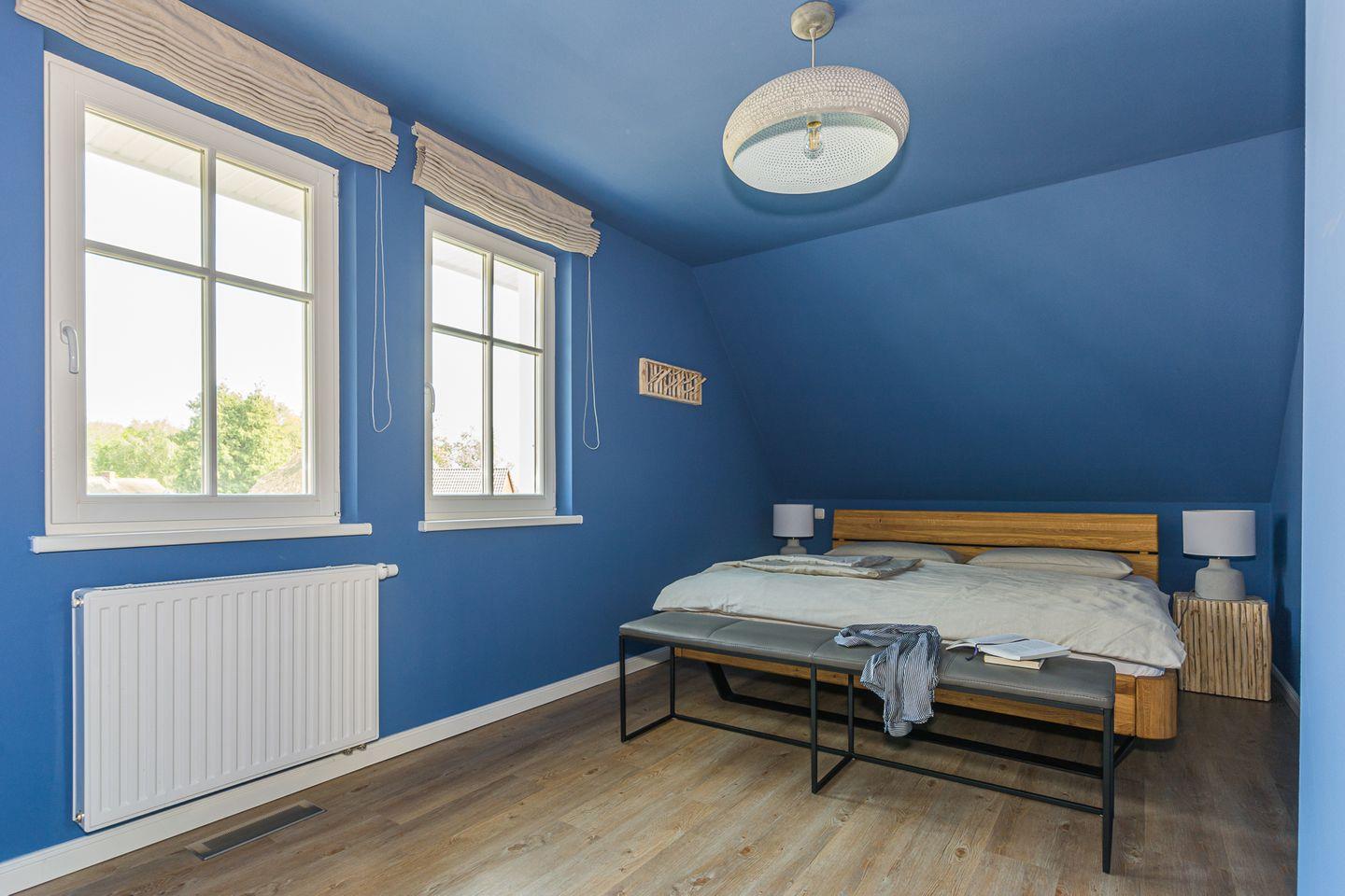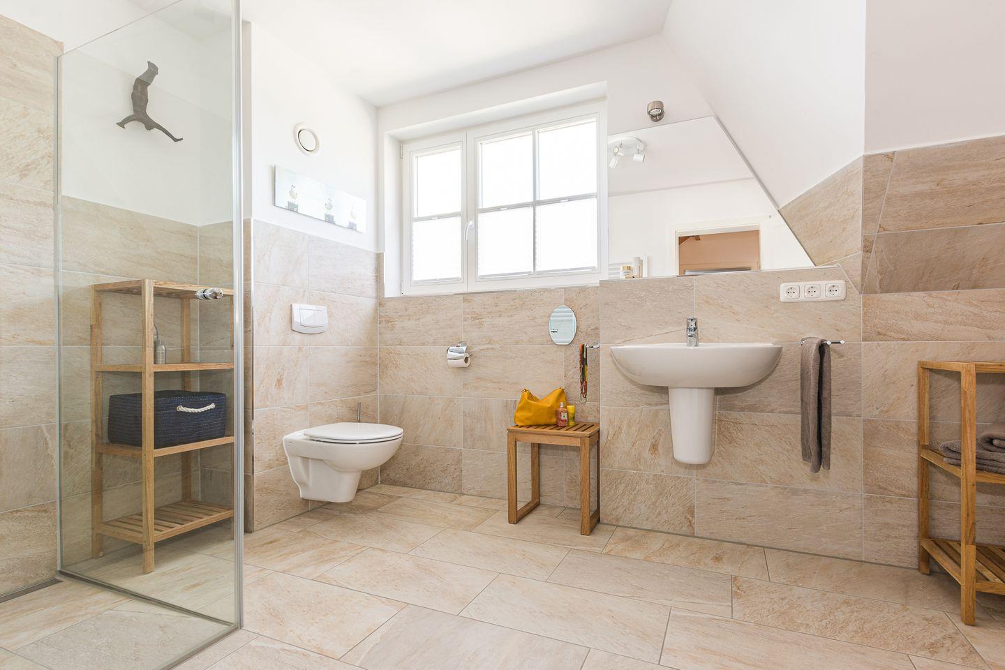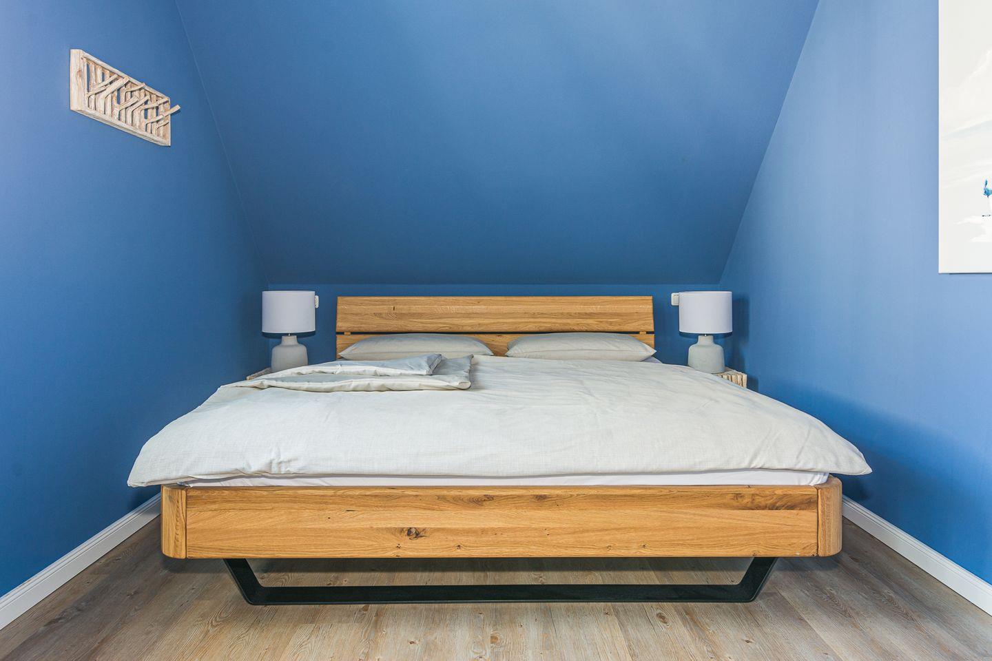 Über eine Eichenholztreppe erreicht man das Obergeschoss, welches aus den zwei Schlafzimmern mit je einem Doppelbett (180x200) besteht. Auf derselben Etage finden Sie das sehr geräumige Badezimmer mit Dusche, Fußbodenheizung und angrenzender, großzügiger Sauna.