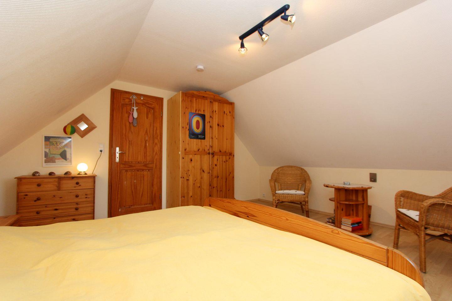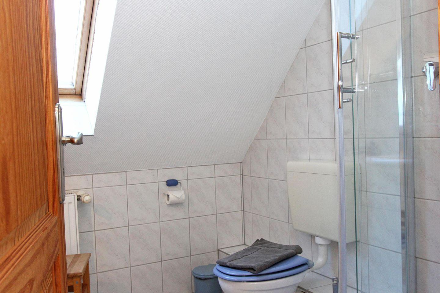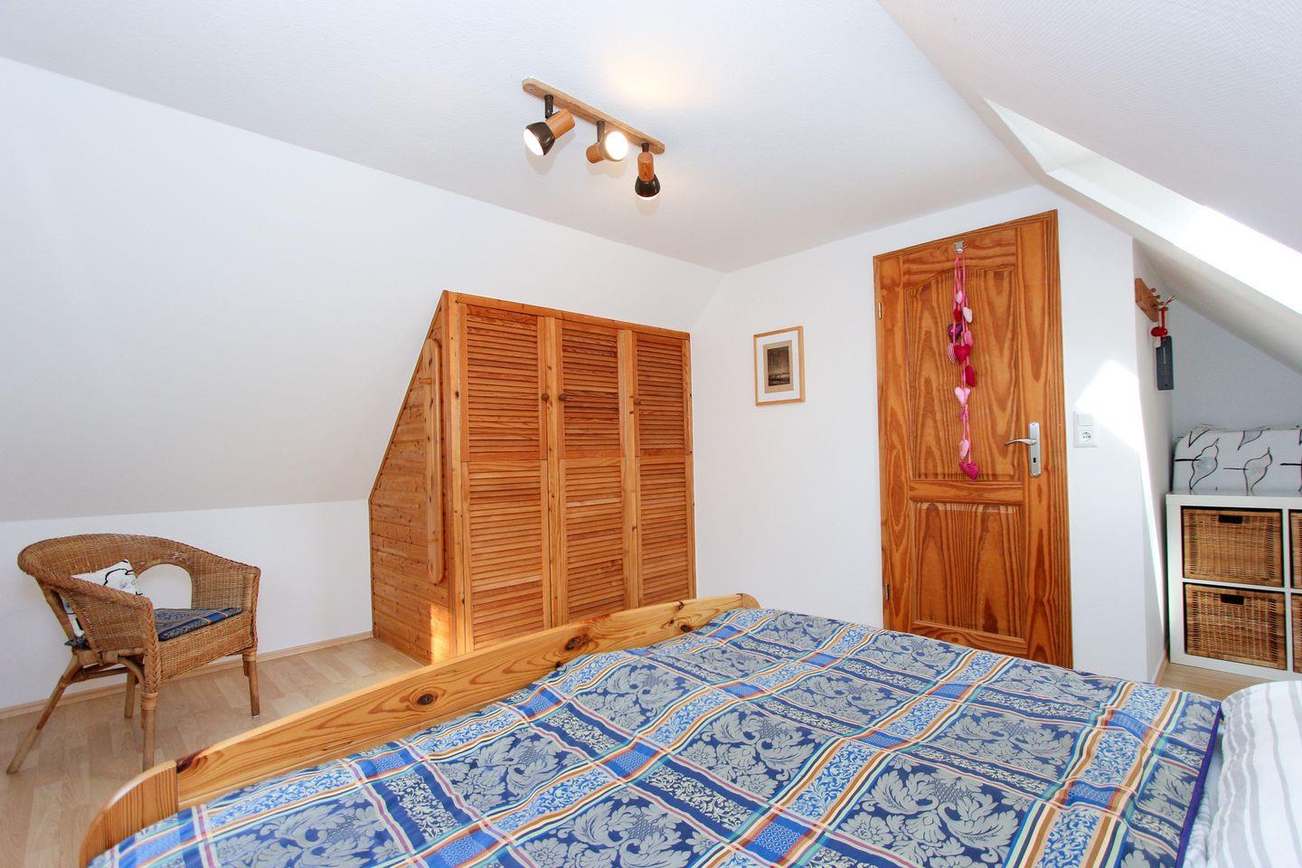 Über eine (schmalere) Treppe im Flur gelangt man in die obere Etage, in der sich zwei Schlafzimmer mit jeweils einem Doppelbett (1,80 x 2,00 m) sowie ein Badezimmer mit Dusche und WC befinden. Es besteht hier die Möglichkeit zum Aufbau eines Kleinkinderbettes.