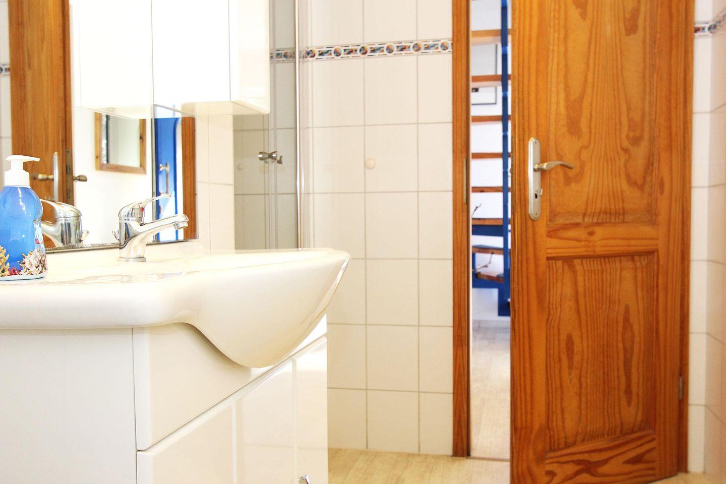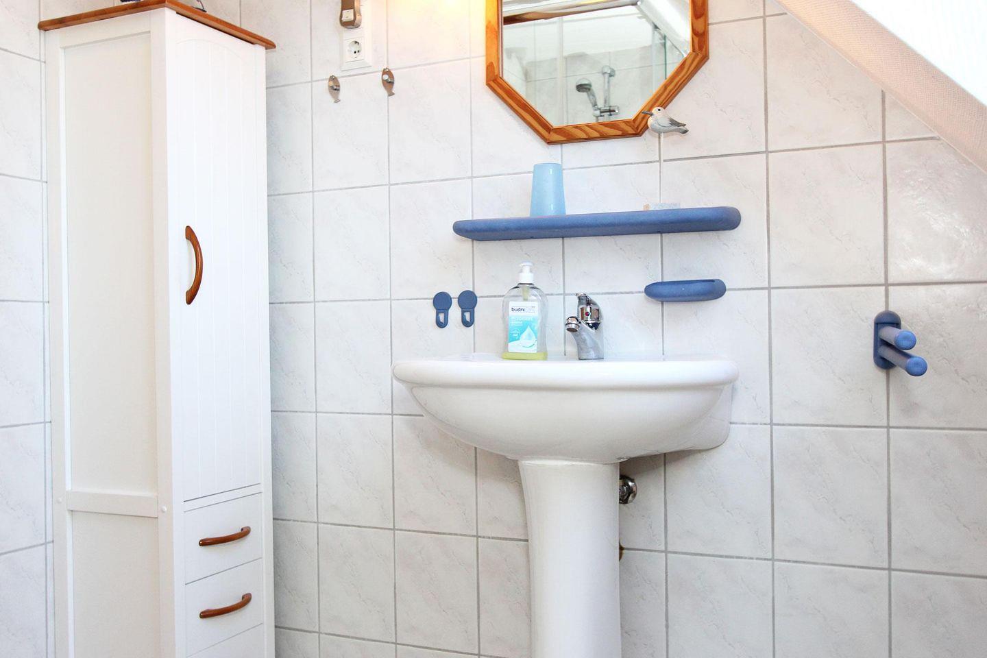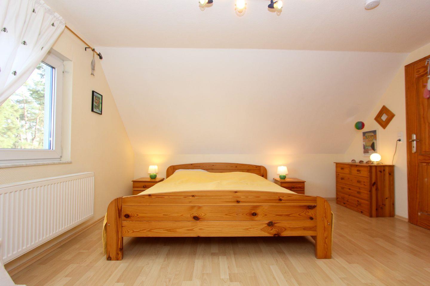 Über eine (schmalere) Treppe im Flur gelangt man in die obere Etage, in der sich zwei Schlafzimmer mit jeweils einem Doppelbett (1,80 x 2,00 m) sowie ein Badezimmer mit Dusche und WC befinden. Es besteht hier die Möglichkeit zum Aufbau eines Kleinkinderbettes.