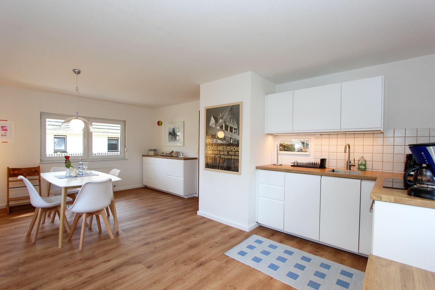 Im Erdgeschoss des Ferienhauses befindet sich eine große neu eingebaute Wohnküche mit Essbereich (Tisch mit 6 Stühlen) und TV sowie getrennt durch den Flurbereich ein geräumiger Aufenthaltsbereich mit Sofasitzgelegenheit. Das Erdgeschoss verfügt zudem über ein Badezimmer mit Dusche, WC und Waschmaschine.