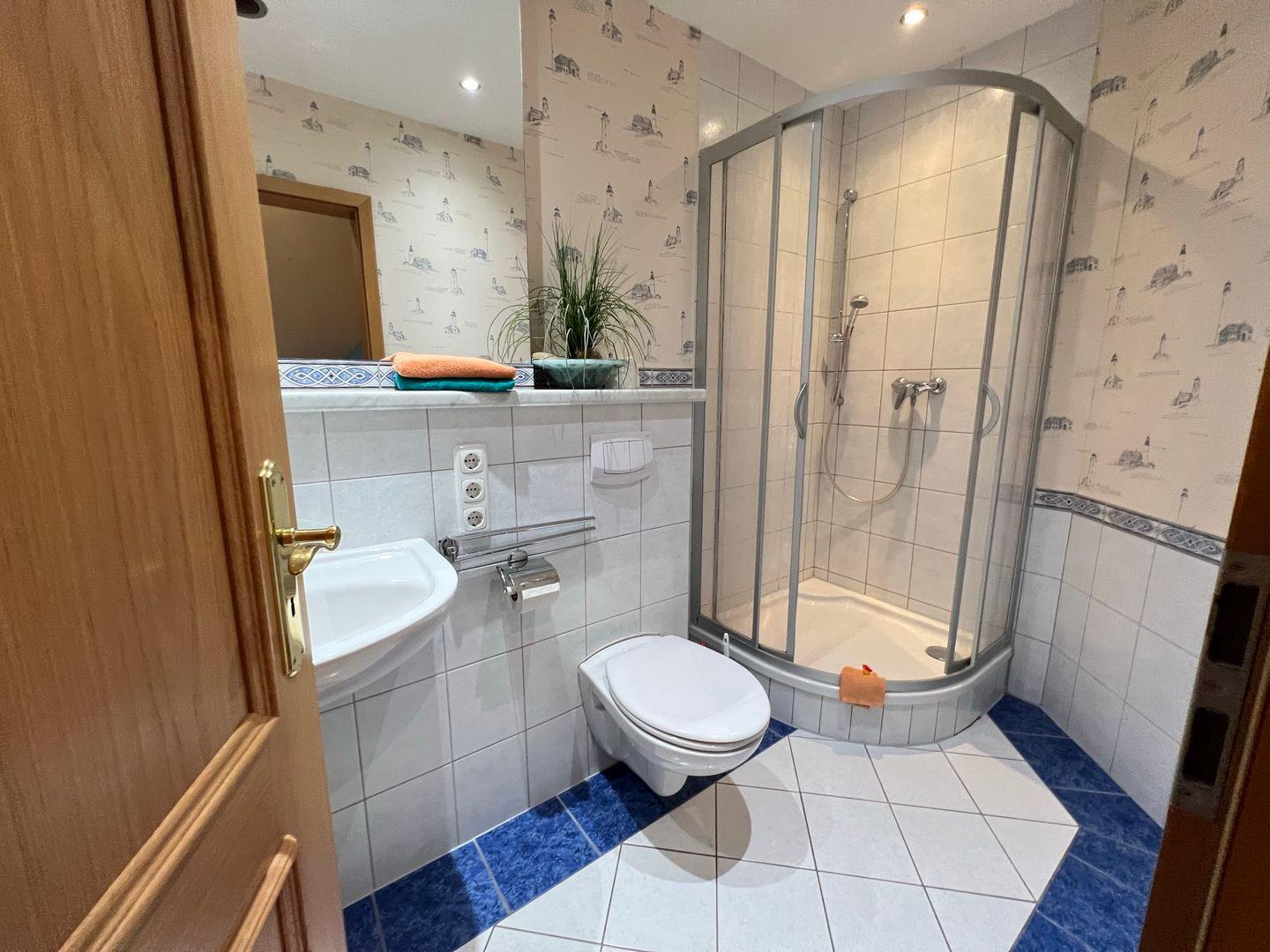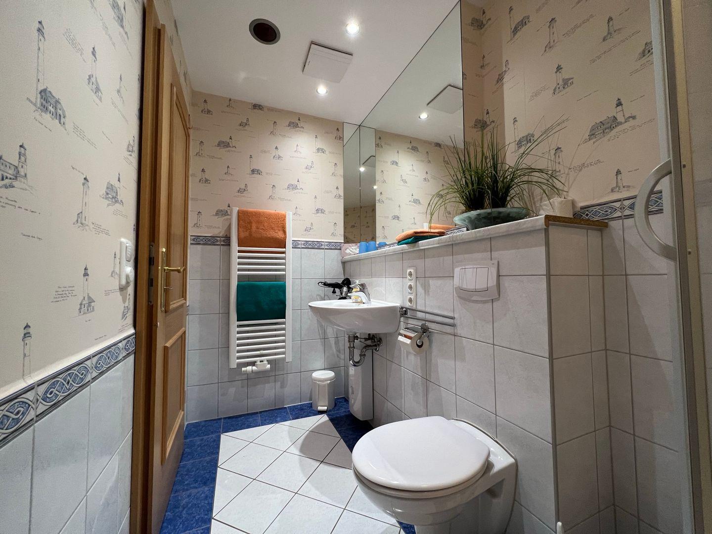 * Bad mit Waschbecken, großem Spiegel, Dusche/WC & einer Infrarot-Wärmelampe