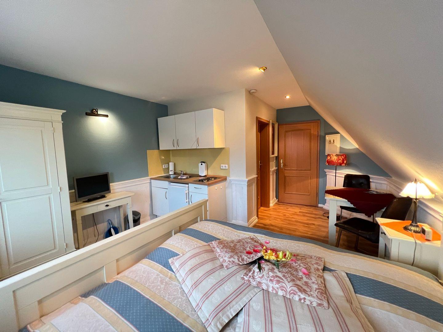 Ruhig und etwas verträumt, so präsentiert sich unsere liebevoll eingerichtete "Matrosenstube" inmitten einer atemberaubenden Urlaubsatmosphäre. Freuen Sie sich auf erholsame Wohlfühltage und gönnen Sie sich zu Zweit eine entspannende Auszeit. Am Abend kuscheln Sie sich in die weichen Federn Ihrer familiären Unterkunft und genießen traumhafte Stunden unter reetgedecktem Dach.