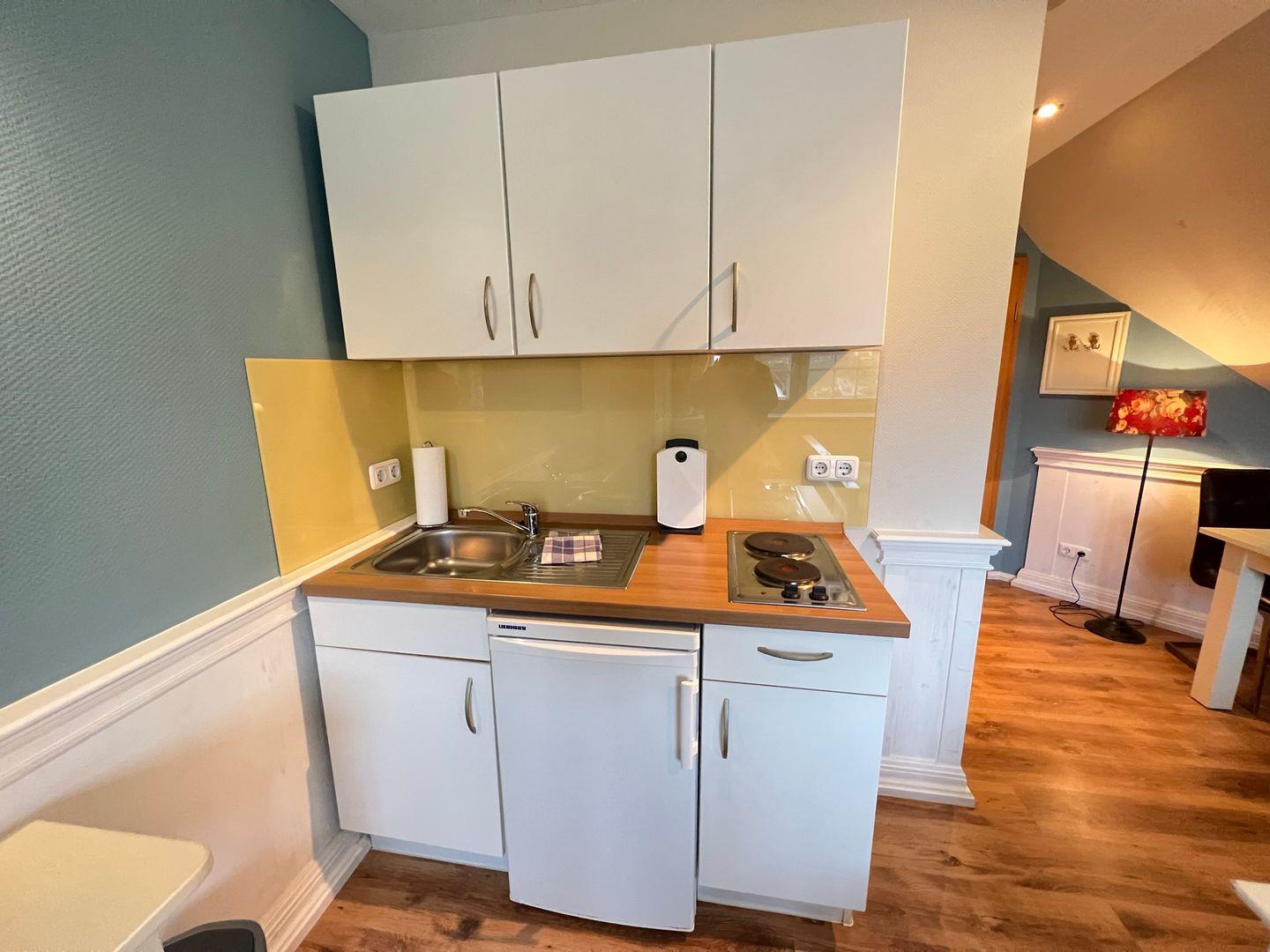 * Miniküche mit 2 - Plattenherd, Kühlschrank, Wasserkocher, Kaffeemaschine und Toaster
