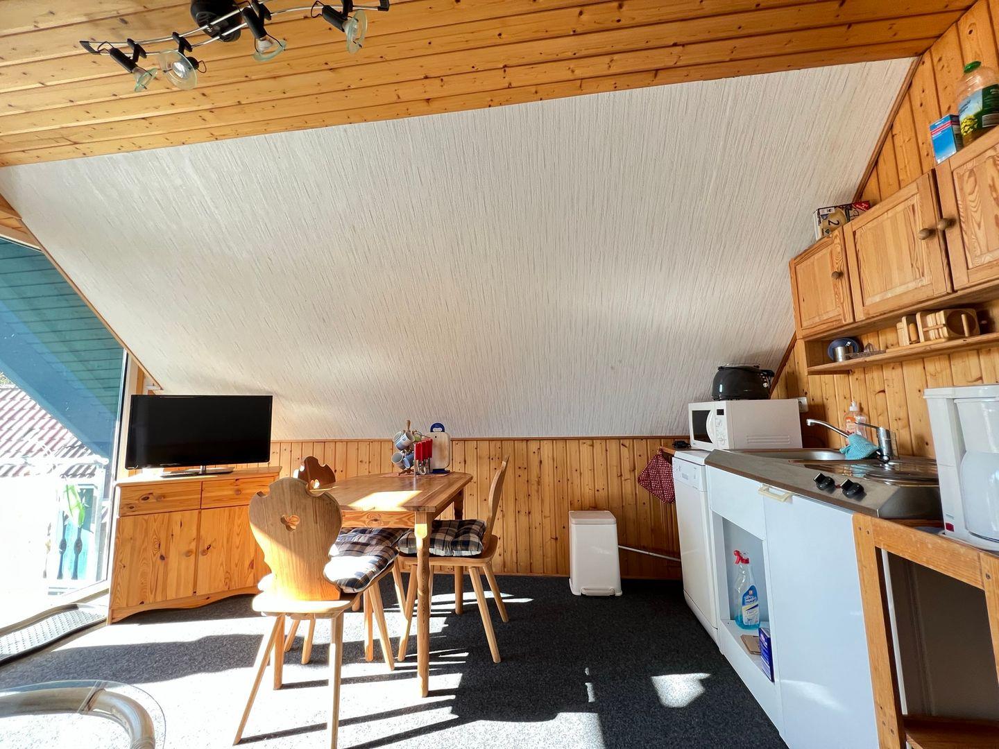 Die gut ausgestattete Küche besitzt unter anderem einen Kühlschrank, einen Herd zum Kochen und sogar eine Spülmaschine.