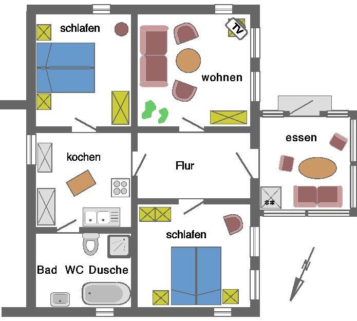 Das Ferienhaus verfügt über einen separaten Eingang, 1 Frühstücksveranda, 2 Schlafzimmer, 1 Wohnzimmer, 1 Küche und 1 Bad.