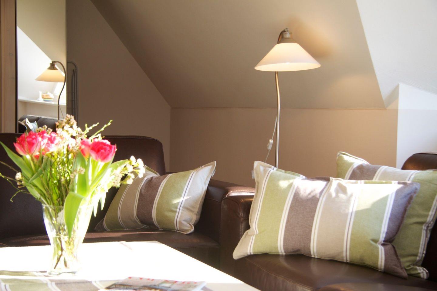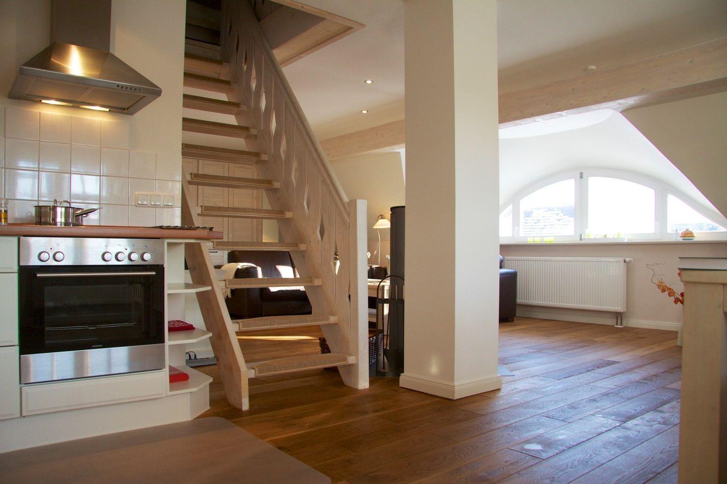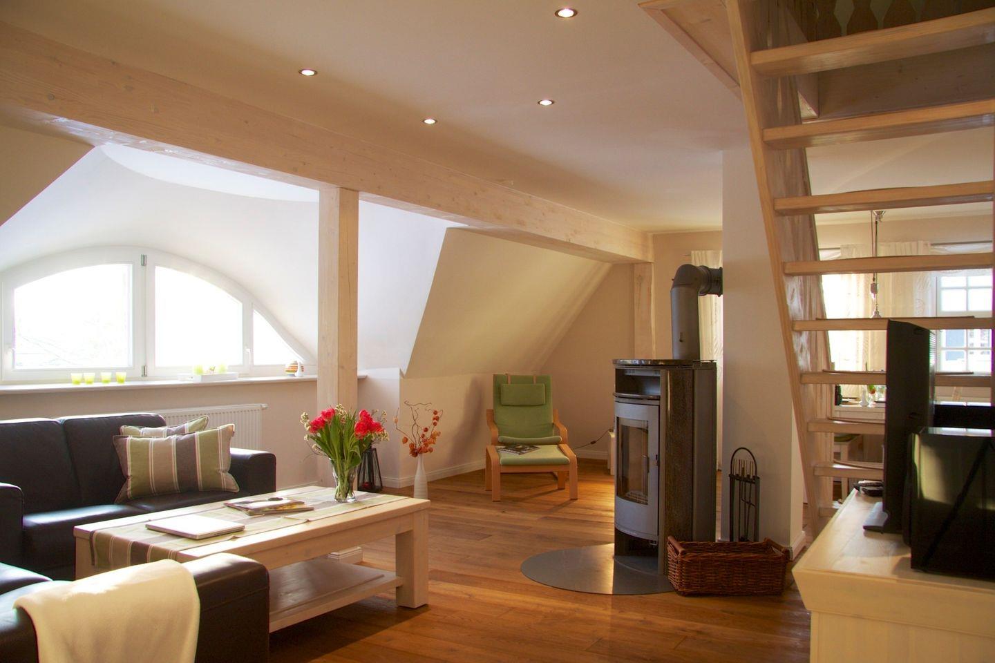 Die Ferienwohnung 4 ist eine 2 geschossige Galeriewohnung mit 54m2 Wohnfläche und großzügig angelegt. Genießen Sie entspannte Stunden am Kaminofen oder Ihrer gemütlichen Schlafgalerie im Spitzboden.