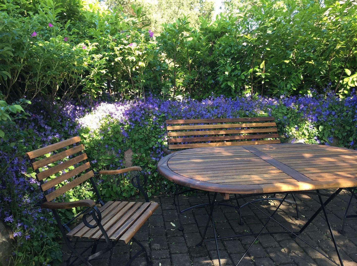 Im Garten befinden sich Freisitze, die durch einen Steinwall mit Rosenbüschen eingefasst sind.