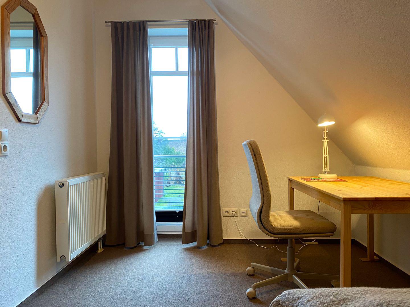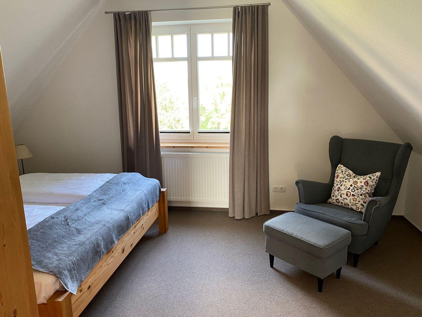Im Obergeschoss befinden sich zwei separate Schlafzimmer. Eins ist mit einem Doppelbett (Maße: 180 x 200) und das andere mit einem Einzelbett (Maße: 100x200) ausgestattet.