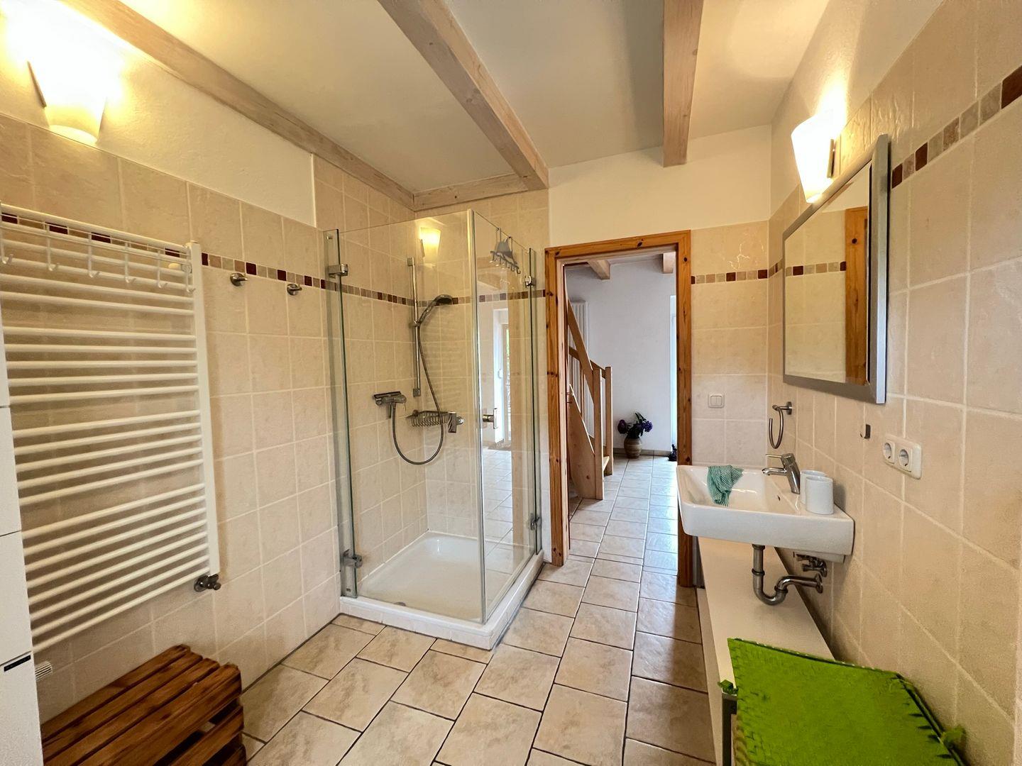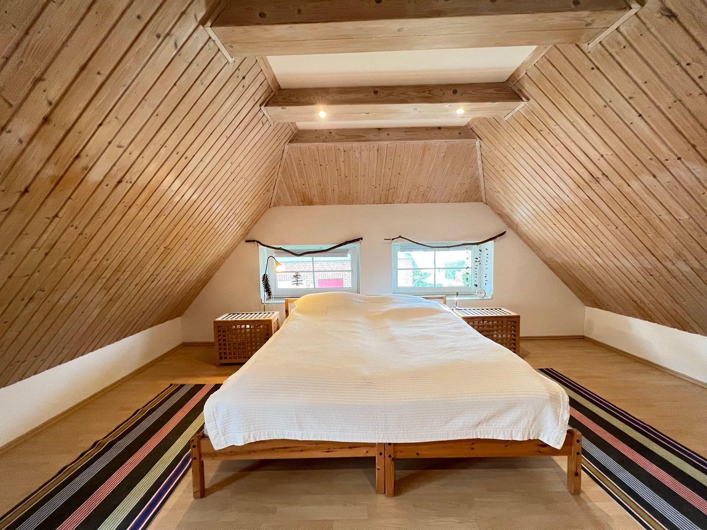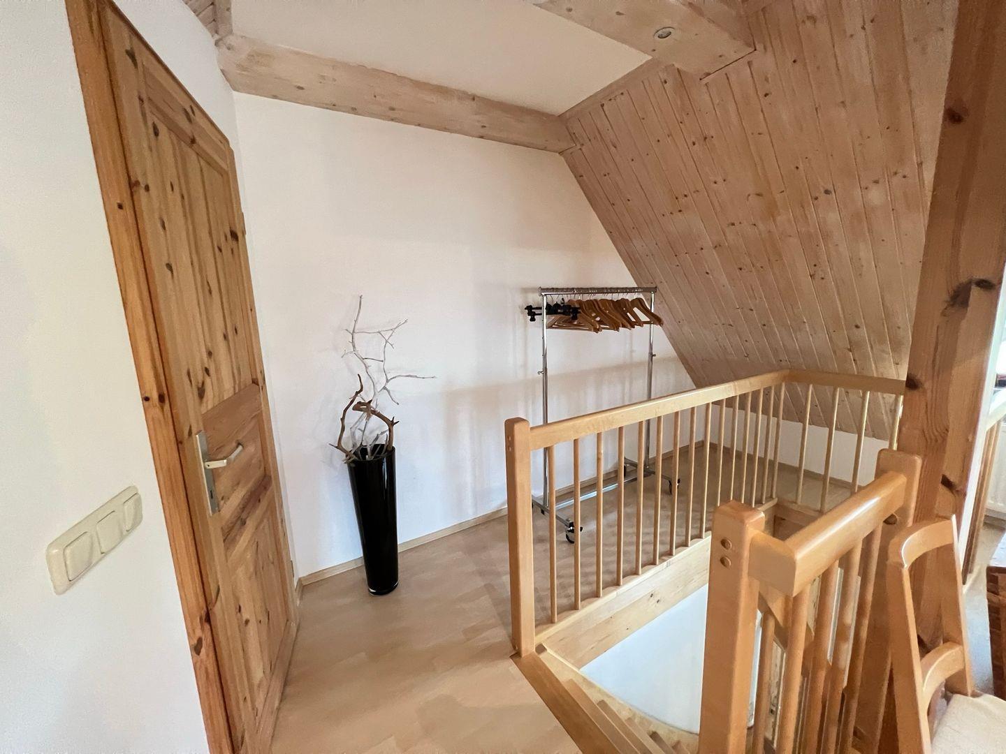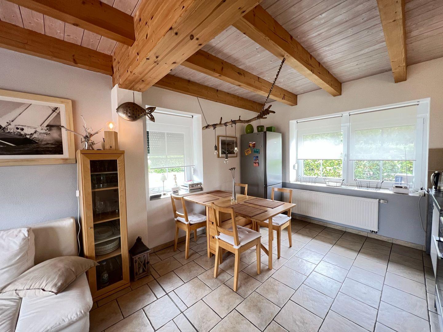 Diese Maisonettewohnung befindet sich auf einem Grundstück mit großer Rasenfläche und freiem Blick zum Bodden. Im Erdgeschoss lädt die offene Küche, sowie der liebevoll eingerichtete Wohn-Essbereich zum Verweilen ein. Ebenfalls im Erdgeschoss befindet sich eines der zwei Badezimmer, welches mit einer Dusche ausgestattet ist. Im Obergeschoss entspannen Sie sich in einem großen Schlafzimmer mit Doppelbett.