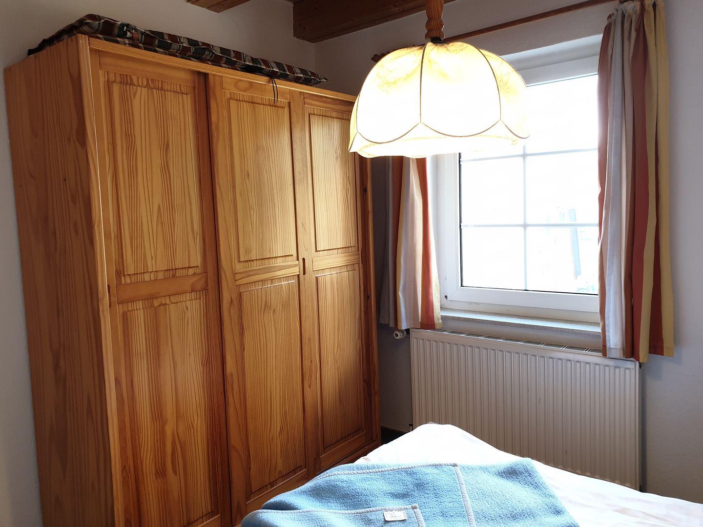 Die Ferienwohnung befindet sich im 1. Stock mit Balkon und Blick zum Bodden. Das Schlafzimmer verfügt über ein Doppelbett und großen Kleiderschrank.