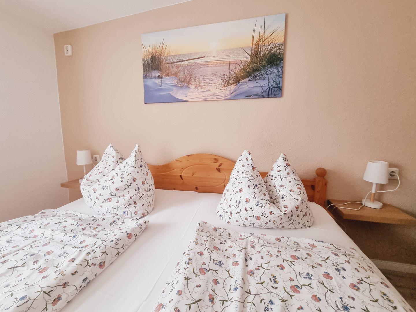 Das gemütliche Doppelzimmer mit Bad im Erdgeschoss nahe dem Nationalpark Vorpommersche Boddenlandschaft bietet modernen Komfort, verfügt über einen Flachbild-TV und kostenfreies WLAN. Gemeinschaftlich steht Ihnen eine Küche mit Kochzeile, Kaffeemaschine, Toaster, Wasserkocher und einem Kühlschrank zur Verfügung.