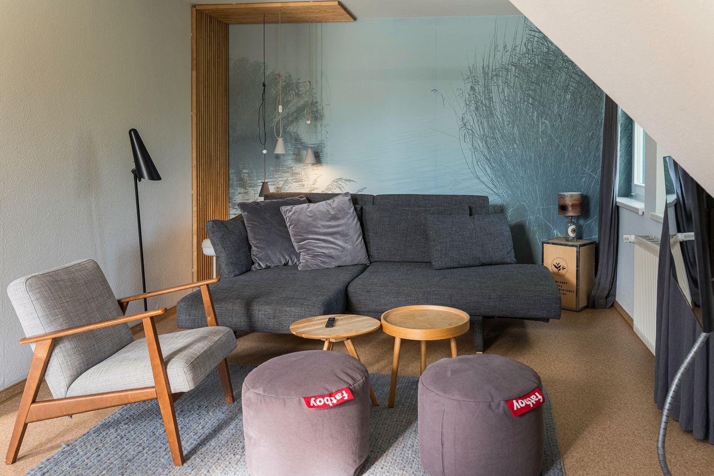 Die Ferienwohnung im ersten Stock verbindet puristischen skandinavischen Stil mit einem harmonischen Farbkonzept, das Modernität und Gemütlichkeit vereint. Mit einem Schlafzimmer, dass mit zwei Einzelbetten ausgestattet ist, einem hellen Wohnzimmer mit Schlafsofa, einer offenen Küchenzeile und einem modernen Bad bietet die Wohnung alles, was für einen komfortablen und entspannten Aufenthalt nötig ist. Ein besonderes Highlight ist der außergewöhnliche Balkon in Storchennestoptik, der über einen Steg erreichbar ist. Von hier eröffnet sich ein traumhafter Blick auf weite Wiesen – ein Ort, um die Ruhe der Natur zu genießen. In den Abendstunden sorgt das sanfte Flackern des Leuchtturms am Himmel für eine magische Atmosphäre.