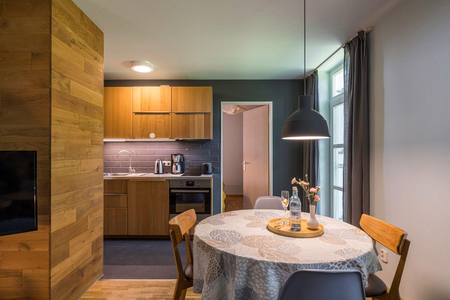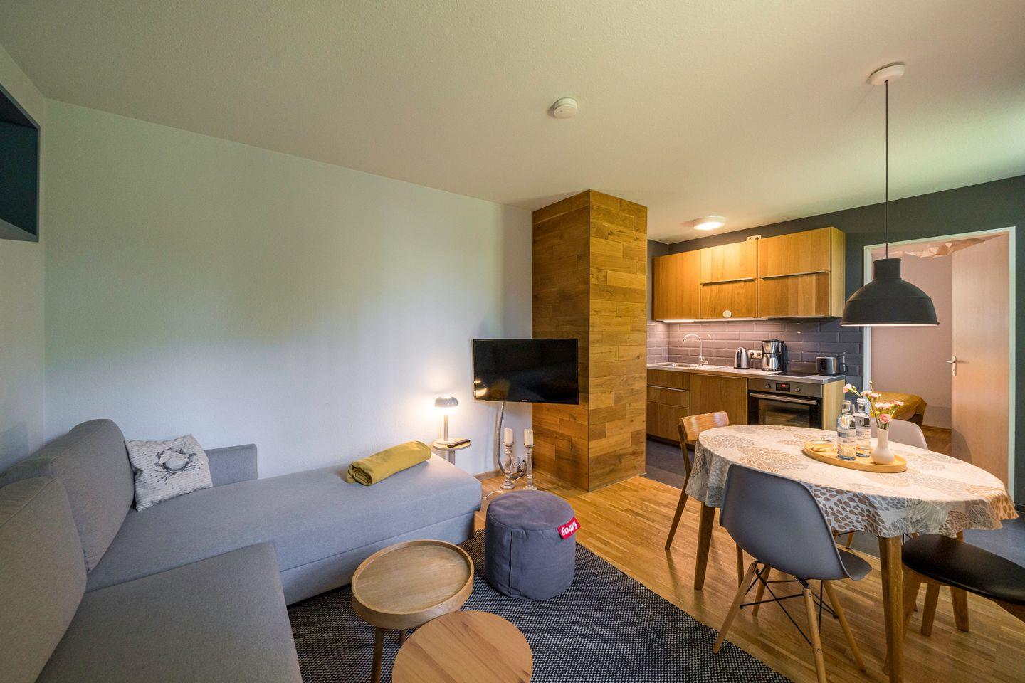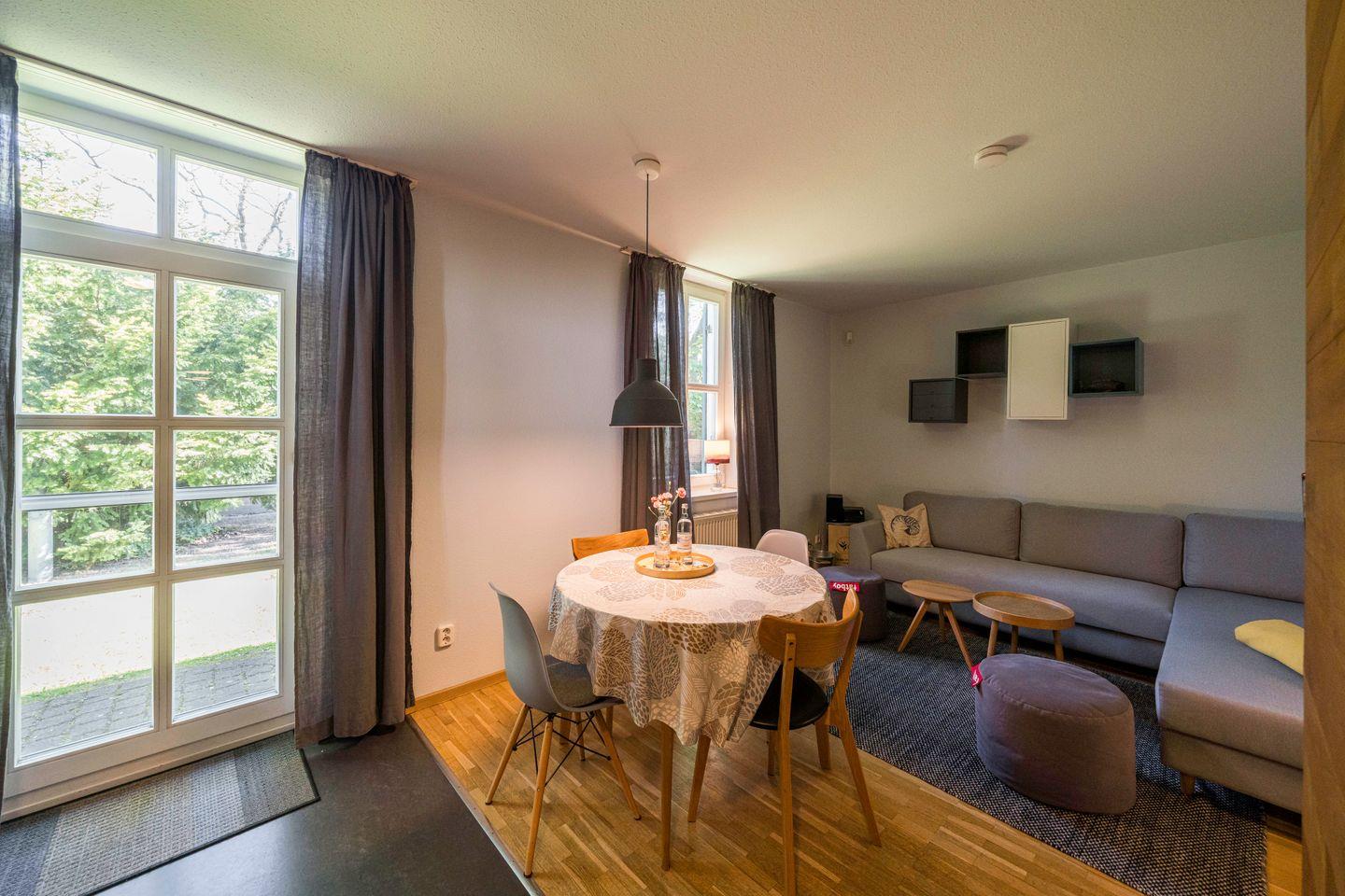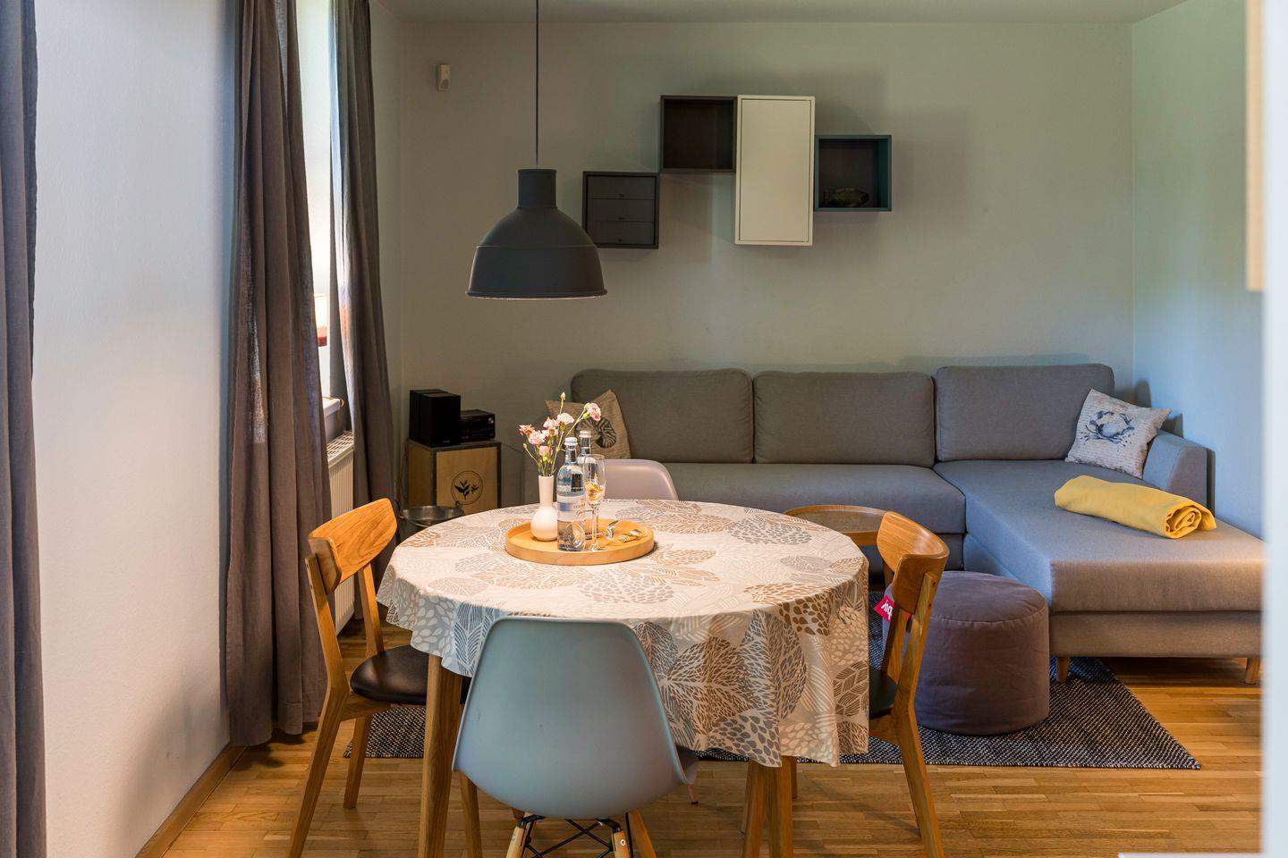 Die private Terrasse lädt zu entspannten Stunden im Freien ein, während der gemeinschaftliche Garten zusätzliche Möglichkeiten für Erholung und Aktivitäten bietet. Ein Grillplatz, eine Schaukel und eine Tischtennisplatte sorgen für gesellige Momente und Spielspaß für Groß und Klein. Für Familien mit kleinen Kindern stehen ein Kinderbett und ein Hochstuhl bereit, sodass sich die Wohnung ideal für einen erholsamen Familienurlaub eignet. Eine stilvolle Unterkunft, die durch ihre moderne Ausstattung und familienfreundliche Extras überzeugt – perfekt für eine Auszeit in entspannter Atmosphäre.