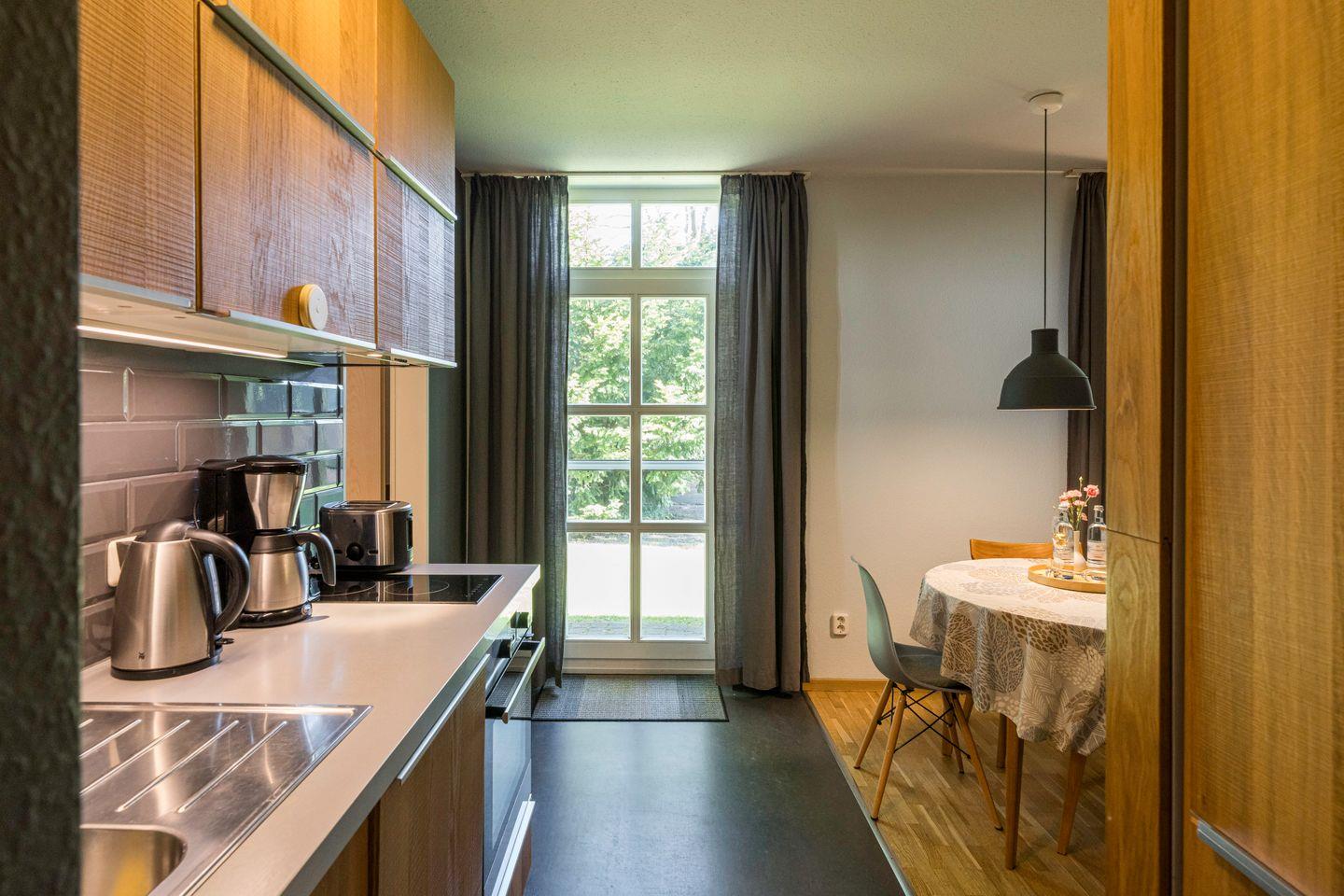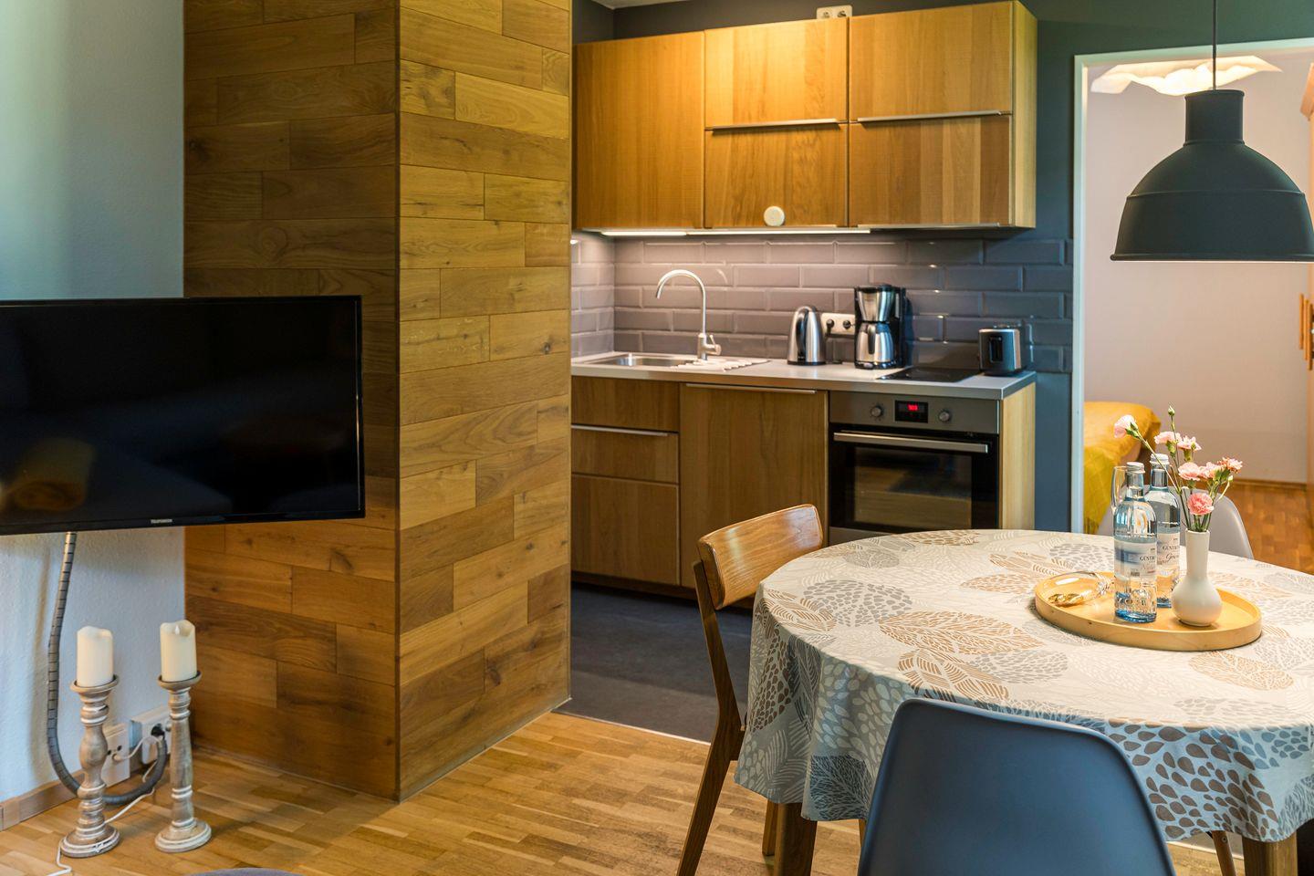 Diese charmante Erdgeschosswohnung kombiniert modernen, skandinavischen Stil mit einer klaren, reduzierten Einrichtung und einem harmonischen Farbkonzept. Mit zwei Schlafzimmern, einem gemütlichen Wohnzimmer mit Schlafsofa, einer voll ausgestatteten Küche und einem modernen Bad bietet die Wohnung eine durchdachte Raumaufteilung, die Funktionalität und Ästhetik perfekt verbindet.