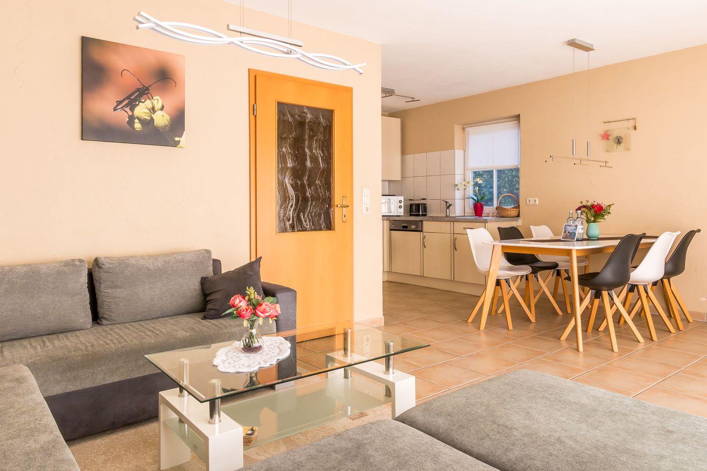 Willkommen in deinem neuen Ferienzuhause. Die gemütliche Doppelhaushälfte mit 98 Quadratmetern bietet dir und deinen Liebsten viel Platz zum Wohlfühlen. Mit drei komfortablen Schlafzimmern und zwei modernen Bädern ist ausreichend Raum für erholsame Nächte und entspannte Urlaubstage garantiert. Der offene Wohn- und Küchenbereich lädt zu gemeinsamen Stunden ein – hier kannst du nach einem aktiven Tag an der frischen Luft gemütlich beisammensitzen oder deine Lieblingsgerichte zubereiten.