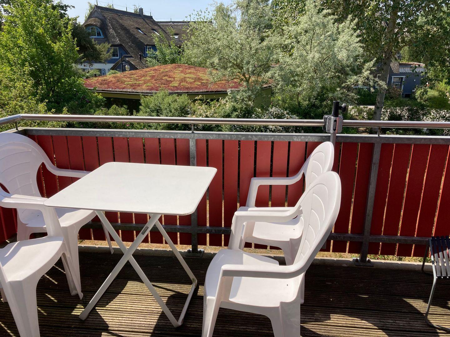 Ein Liegestuhl und ein Gartentisch mit vier Stühlen stehen auf dem Balkon.