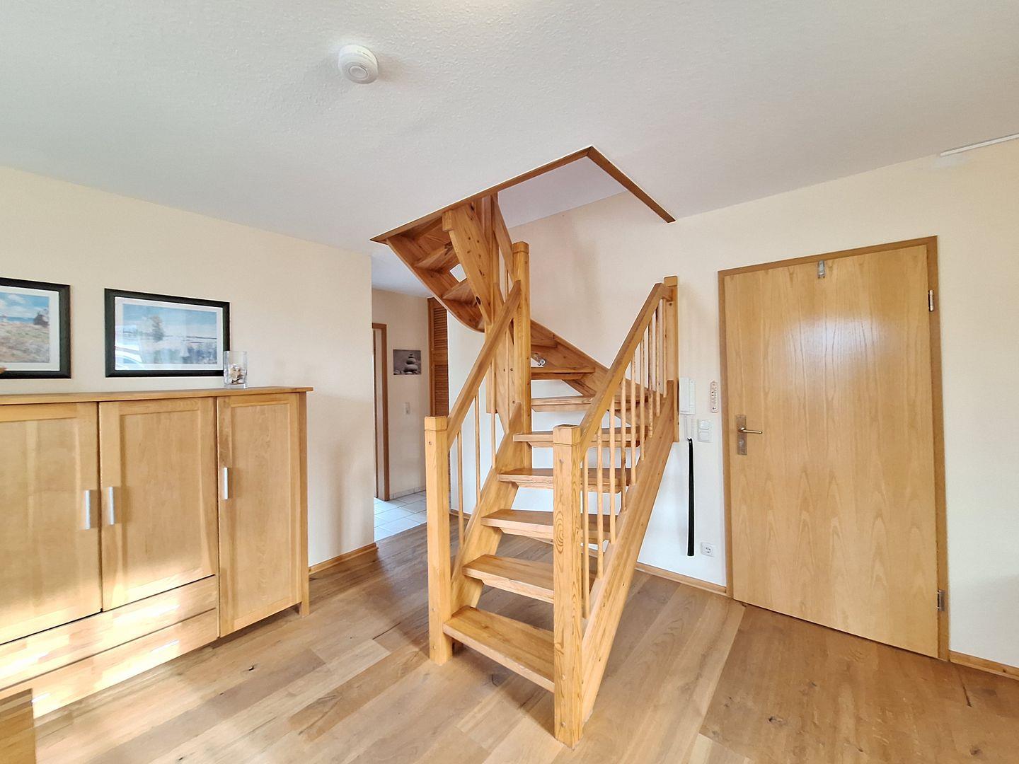 Gemütliche und ruhige Ferienwohnung, ideal geeignet für einen Aufenthalt zu zweit, gelegten in einer ruhigen Seitenstraße. Sie befindet sich im ersten Obergeschoss und verfügt über ein großzügiges Wohnzimmer, eine vollständig eingerichteten Küche, sowie ein Bad mit Dusche und WC. Über eine Treppe gelangen Sie in das Schlafzimmer. Zur Wohnung gehört ein Fahrradschuppen, ein Stellplatz für Ihren PKW und ein Sitzplatz im Garten vor dem Haus.