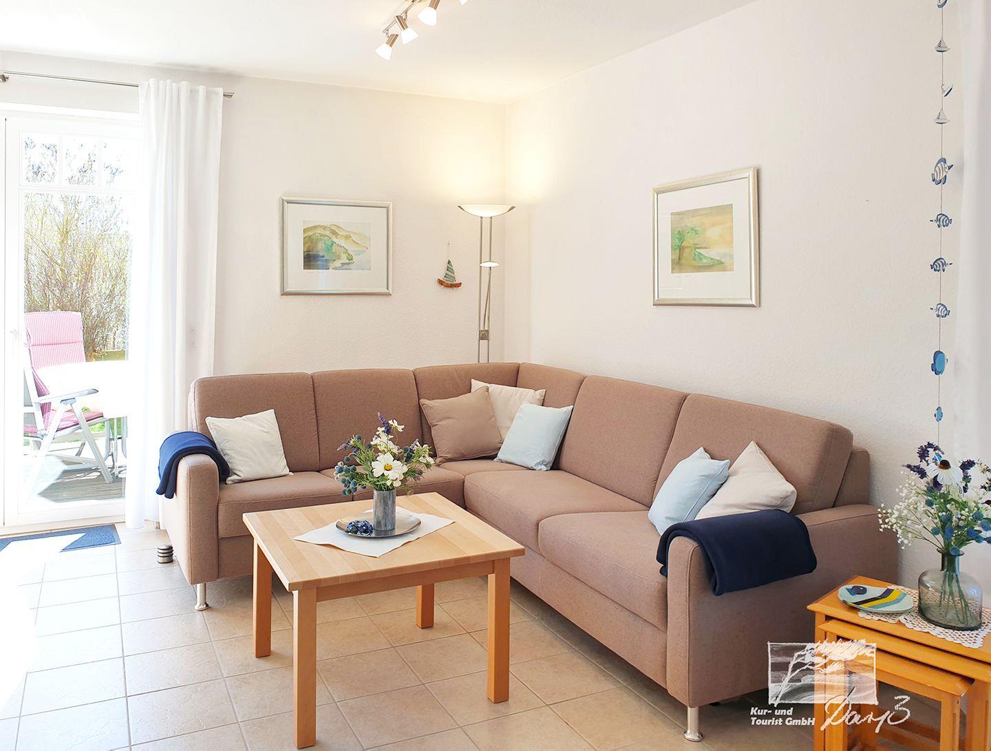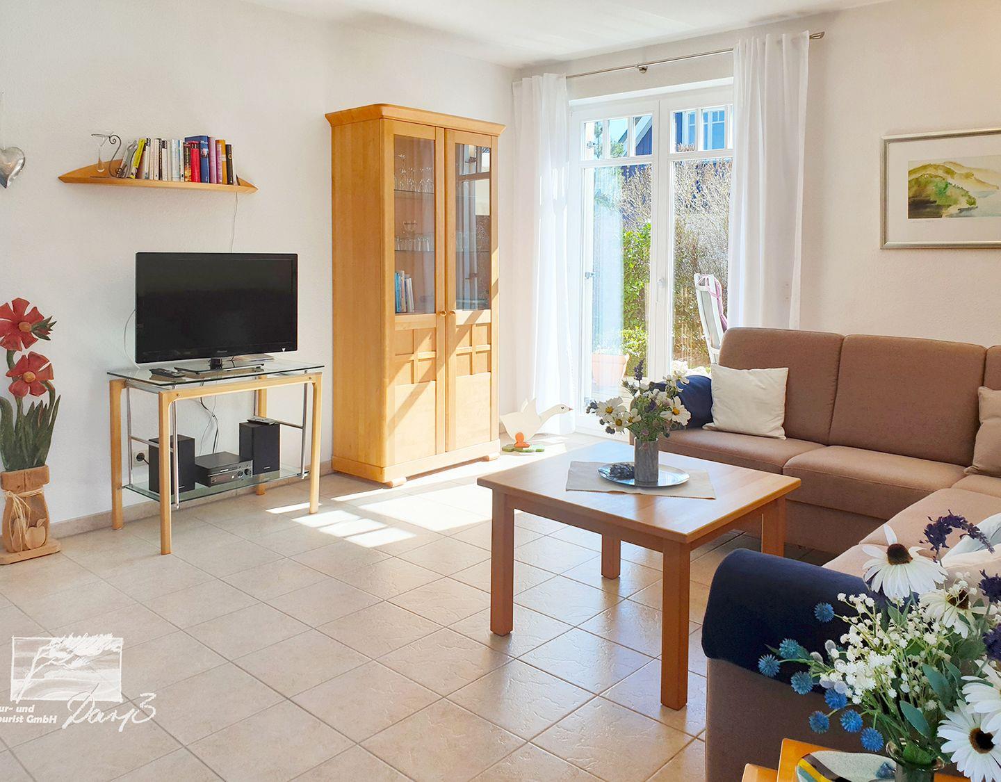 Ferienhaus bis 4 Personen + Baby | ca. 70 m2 Wohnfläche | EG Wohnzimmer, integrierte Küche mit Küchenzeile und Essbereich, Bad mit Dusche, Hauswirtschaftsraum | OG 2 Schlafzimmer, Gäste-WC | 2 Terrassen | 2 Parkplätze | Wohnzimmer Ecksofa, Flachbild-SAT-TV, Stereoanlage | Integrierte Küche Essbereich mit Tisch und 4 Stühlen, Küchenzeile mit Herd (Cerankochfeld), Backofen, Geschirrspüler, Kühlschrank mit Gefrierfach, Kaffeemaschine, Toaster, Wasserkocher, Mikrowelle | 1 Bad mit Dusche und WC im EG, Gäste-WC im OG | 2 Schlafzimmer | SZ 1 mit Doppelbett | SZ 2 mit 2 Einzelbetten | Garten, Terrassenmöbel, Reisebett und Kinderhochstuhl vorhanden, Fliegenschutzgitter, Fahrradschuppen, WLAN kostenfrei