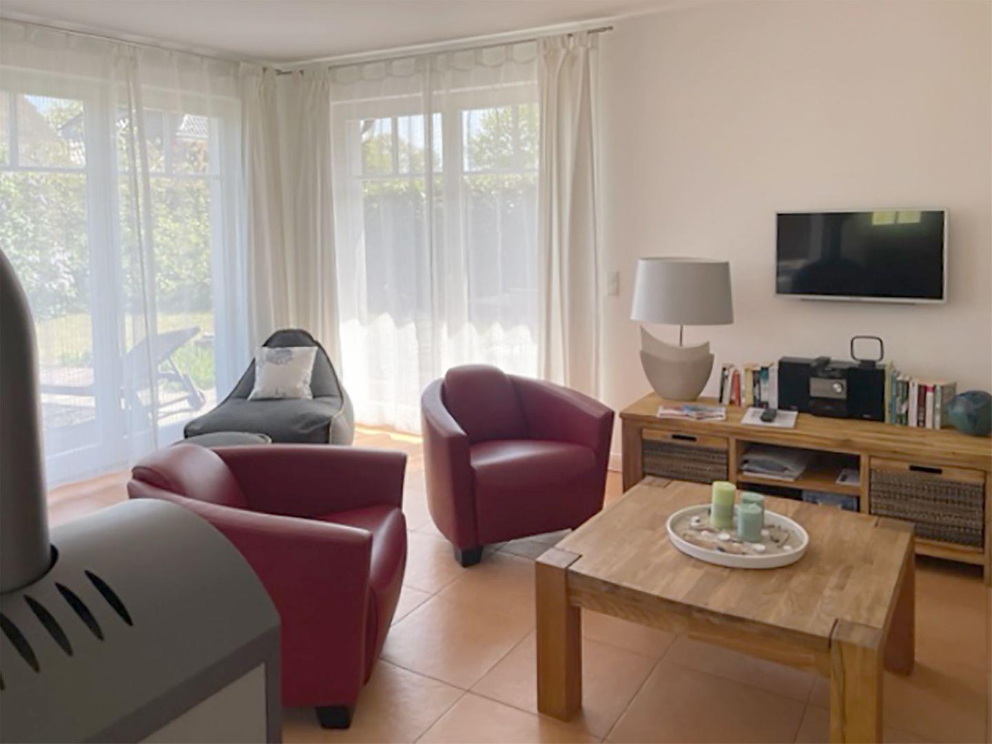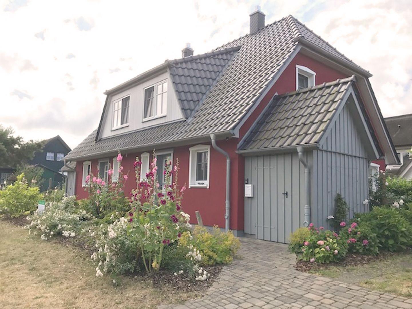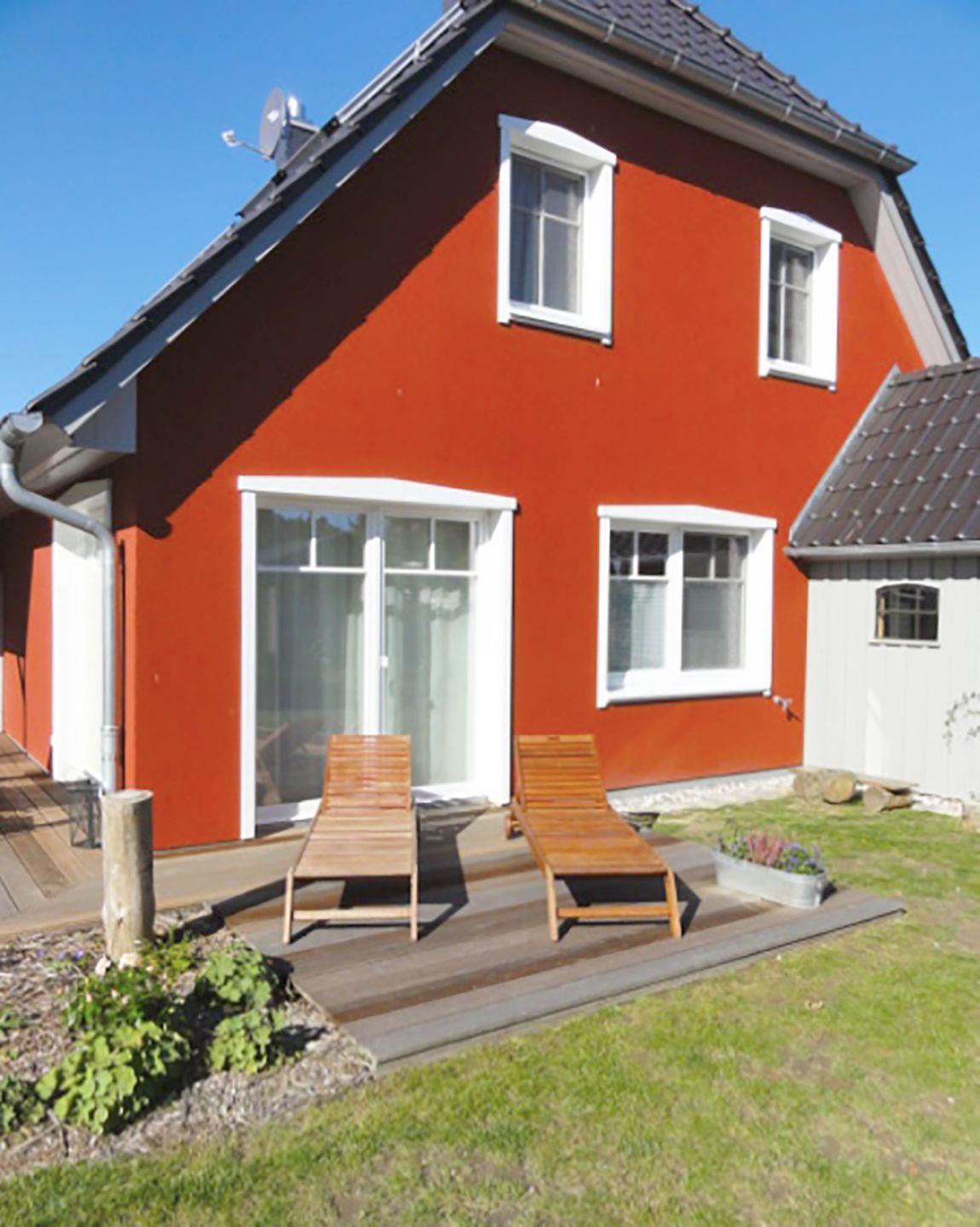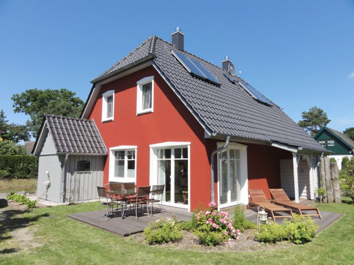 Ferienhaushälfte (linke Seite) bis 4 Personen in Wieck auf dem Darß | ca. 75 m² Wohnfläche | Süd- und Westterrasse | Garten mit Liegewiese | 2 Parkplätze | EG Wohn-/Essbereich mit Einbauküche, Kamin | Duschbad | OG 2 Schlafzimmer, Sauna, Duschbad | Wohn-/Essbereich Esstisch, Couchecke, Radio/CD-Player, SAT-TV, Kamin | Offene Landhausküche Backofen, Geschirrspüler, Herd/Cerankochfeld, Kaffeemaschine, Kühlschrank mit Gefrierfach, Toaster, Wasserkocher | 2 Bäder mit Dusche, WC im EG und im OG | 2 Schlafzimmer im OG | SZ1 mit Doppelbett (180 x 200 cm) | SZ2 mit zwei Einzelbetten (90 x 200 cm), Sat-TV | Babyreisebett, Kinderhochstuhl | ab 7 ÜN inkl. Bettwäsche und Handtücher, Fahrradschuppen, Gartenmöbel, Sauna, WLAN