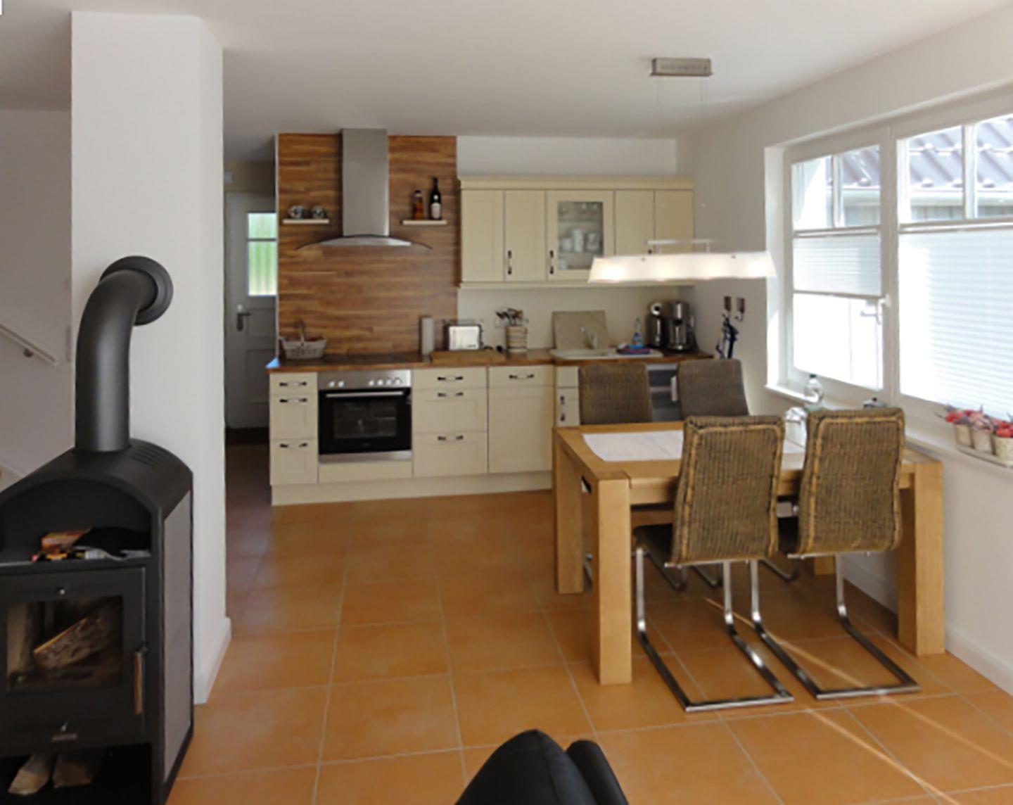 Im Erdgeschoss befindet sich der großzügige Wohn-/Essbereich mit einem Esstisch, einer bequemen Couchgarnitur, einem Kaminofen und einem Radio/CD-Player sowie SAT-TV für gemütliche Abende. Die offene Landhausküche ist bestens ausgestattet mit einem Backofen, Geschirrspüler, Cerankochfeld, Kaffeemaschine, Kühlschrank mit Gefrierfach, Toaster und Wasserkocher.